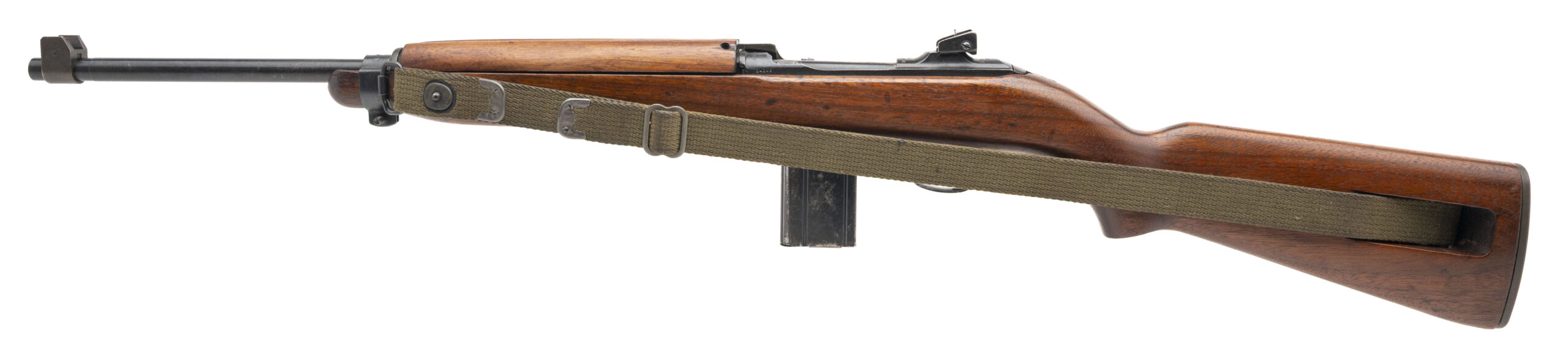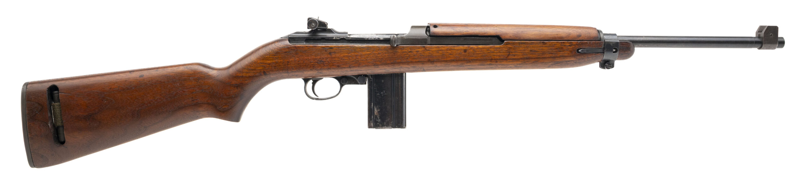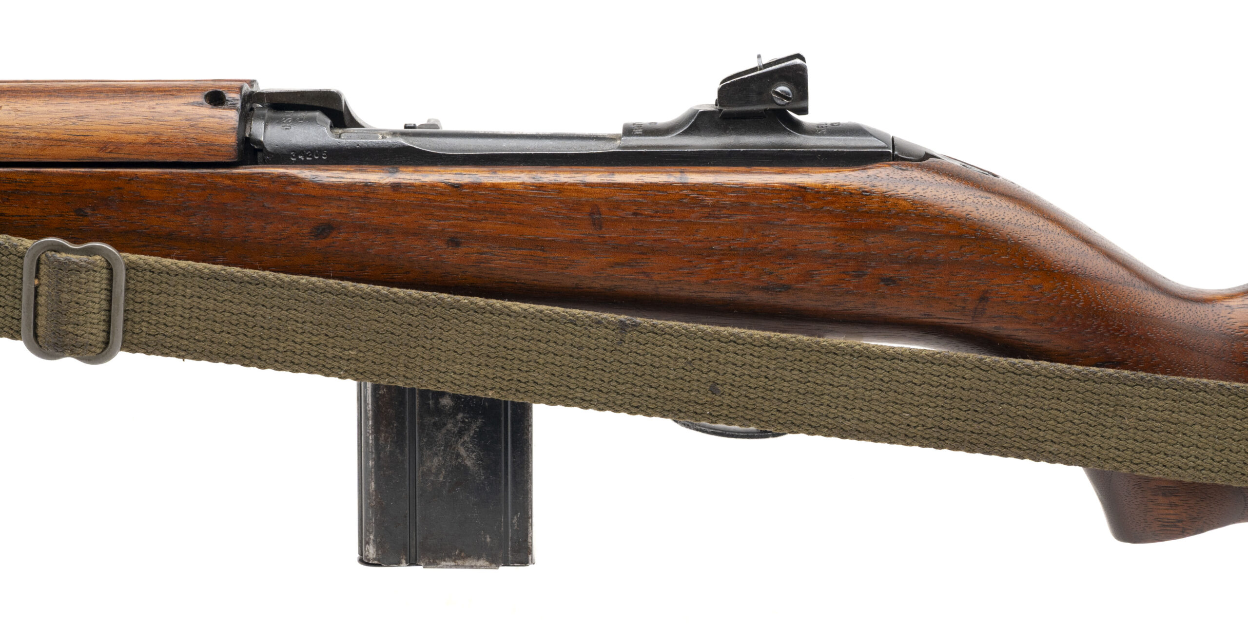 Serial number 34205. Made in 1969 with an 18-inch barrel that has a bright bore with strong visible rifling. This gun was assembled using a combination of USGI parts & new made components. The USGI surplus parts include the magazine release, operating slide, round bolt, stamped adjustable rear sight & type 2 barrel band. The original Standard Products/Hillerich & Bradsby (the company famous for Louisville Slugger baseball bats) low wood oval cut stock is also World War II production USGI. New made parts include the receiver, barrel & the front sight. Overall condition is good. Comes with a USGI webbed sling, USGI oiler & USGI 15-round magazine.