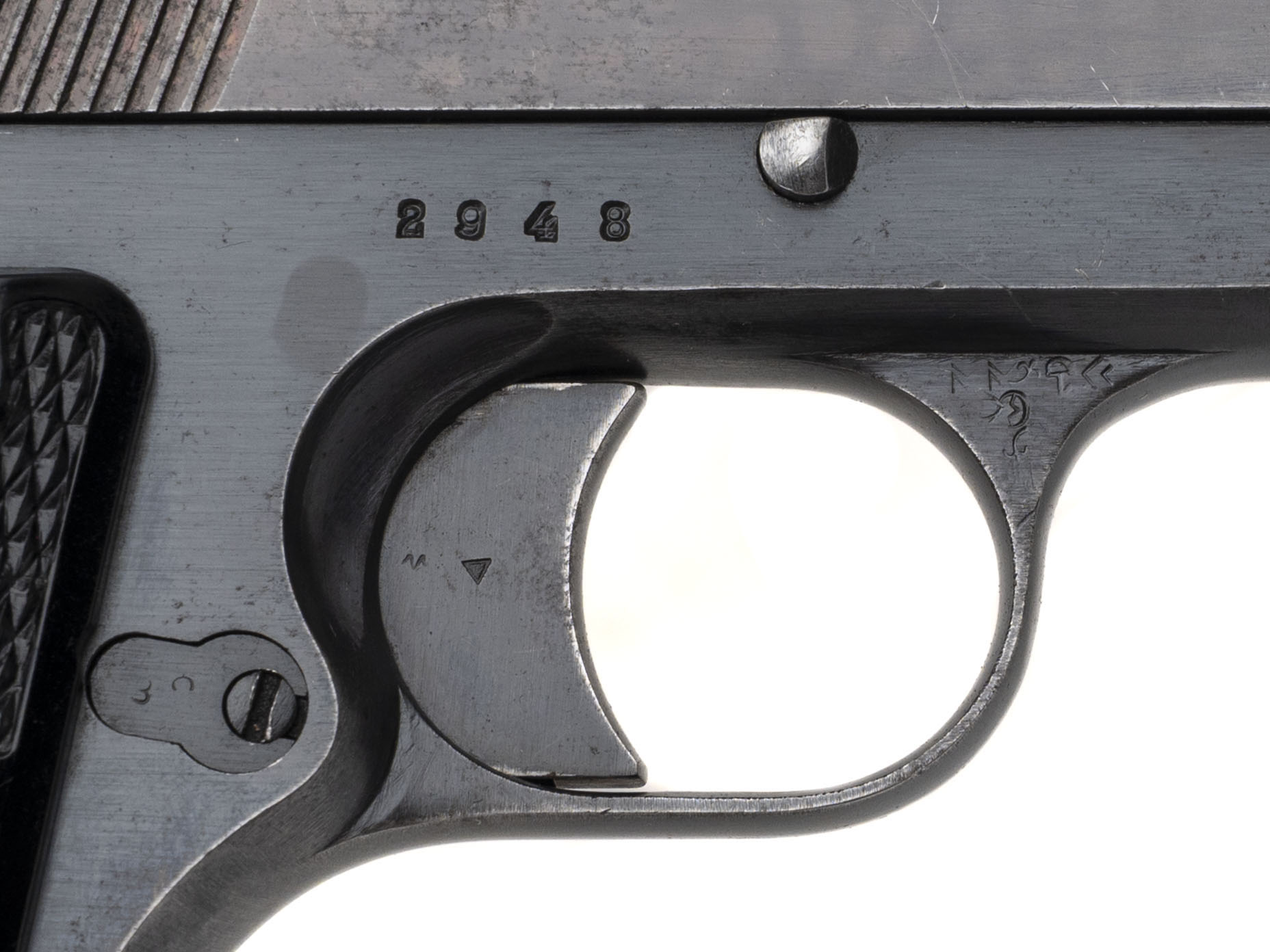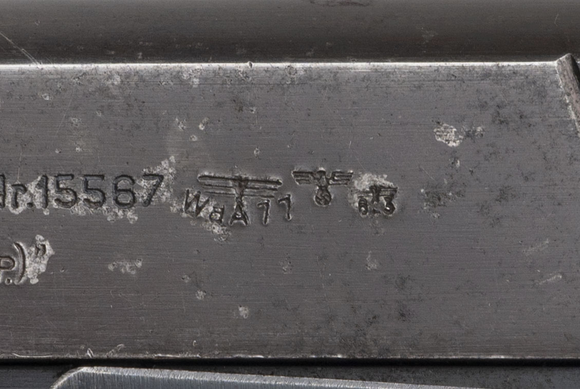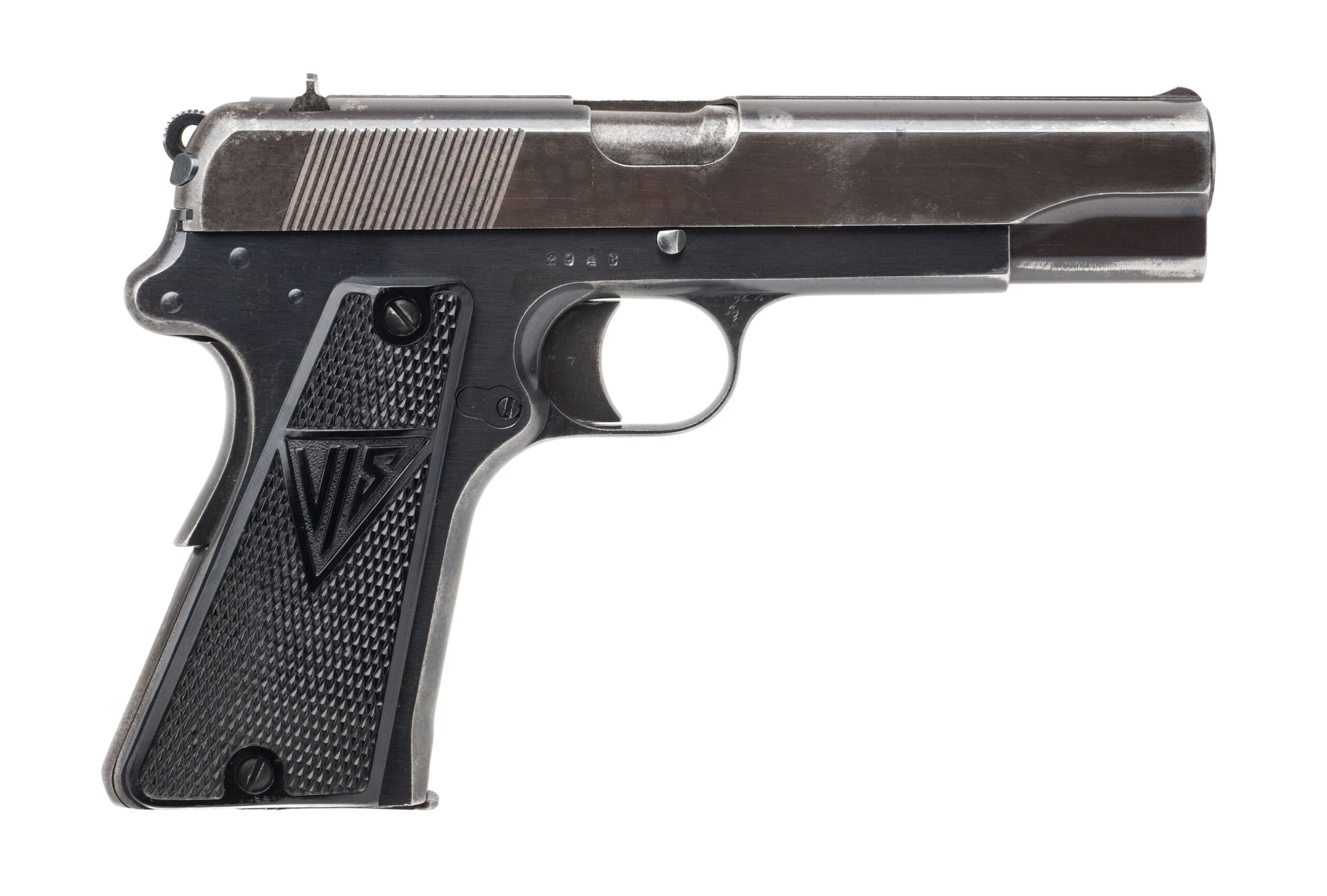 Serial number 2948. Made with a 4.7-inch barrel that has a good bore with strong visible rifling. This "three lever" example of the FB Vis/P35(p) was made at the Fabryka Broni factory in Radom, Poland in 1940 with a slotted frame for a buttstock. It is marked with a WaA77 Waffenamt acceptance stamp indicating that it was issued to the German Army during the Second World War. Overall condition is good with original factory finish across the metallic parts, but there is some light oxidation on the frame as well as some some discoloration & holster wear on the slide. Comes with "FB" marked plastic grips & an original 8-round magazine.