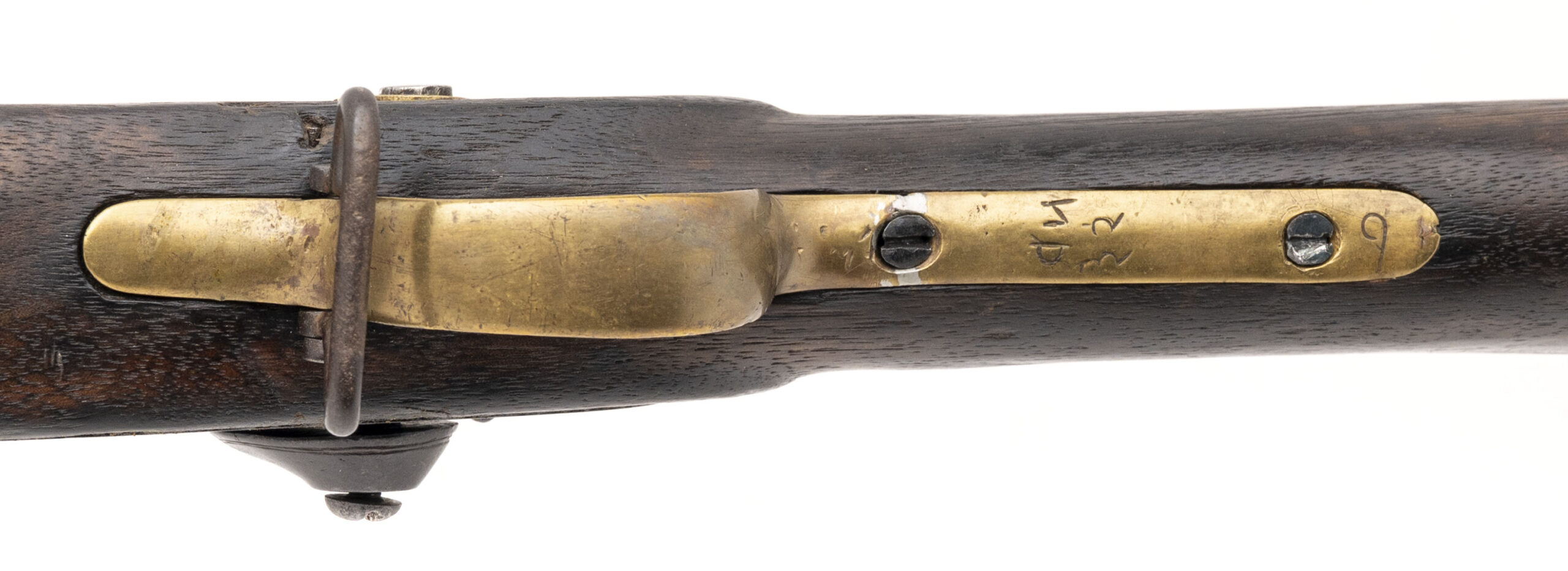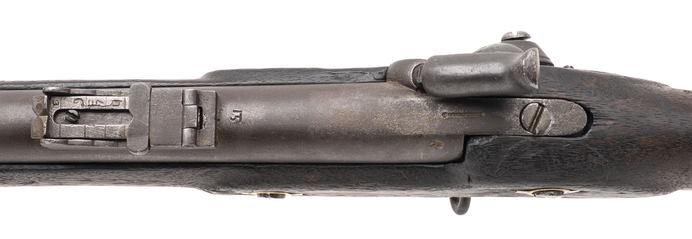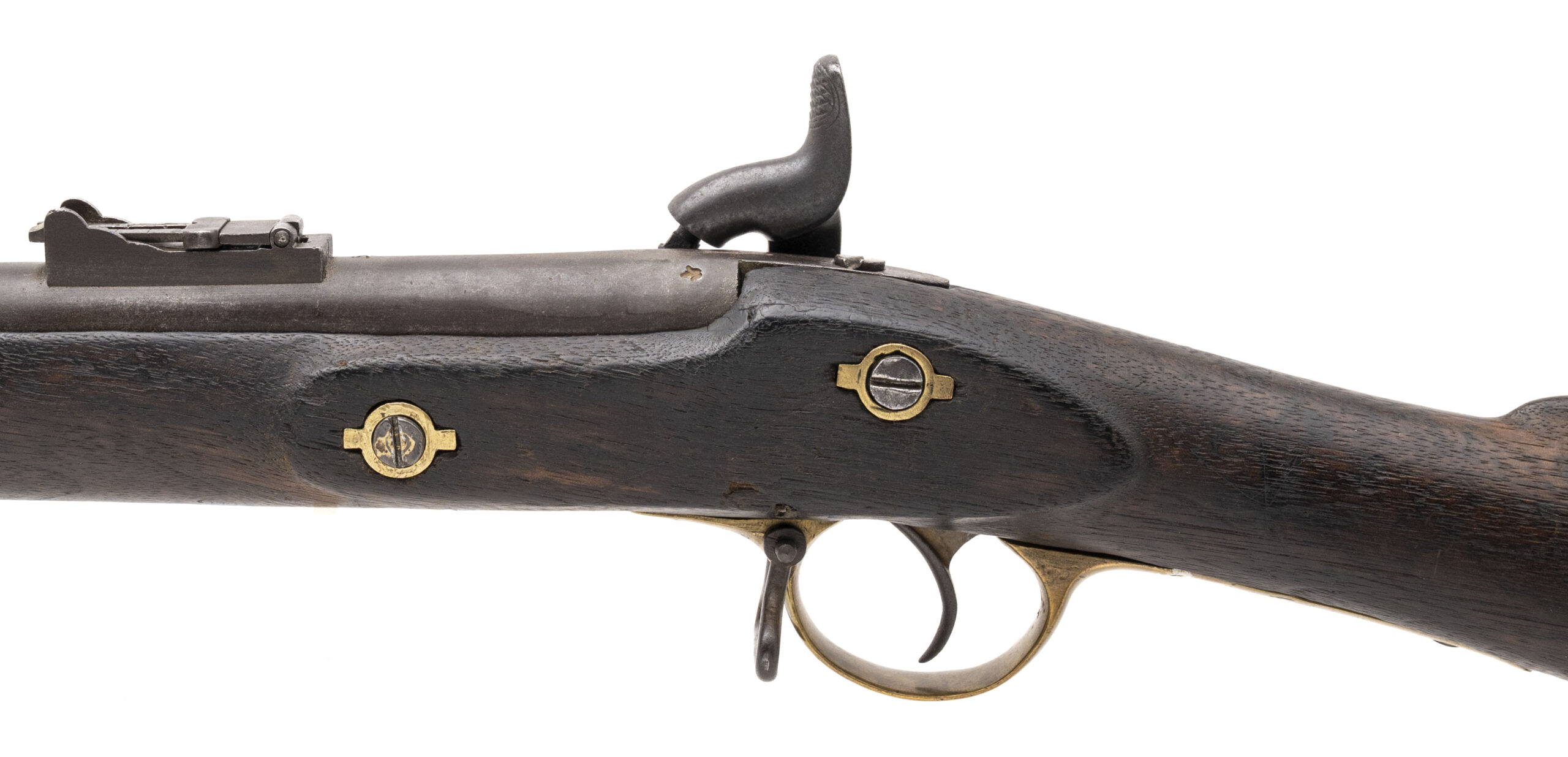 NSN, manufactured circa 1850s–1860s, .577 caliber, 39” round barrel. Metal surfaces show a smooth brown patina. Brass furniture has developed a pleasing aged finish, with Nepalese writing visible on the trigger guard. Stock is in good condition with light handling impressions throughout. Action holds at both half and full cock.