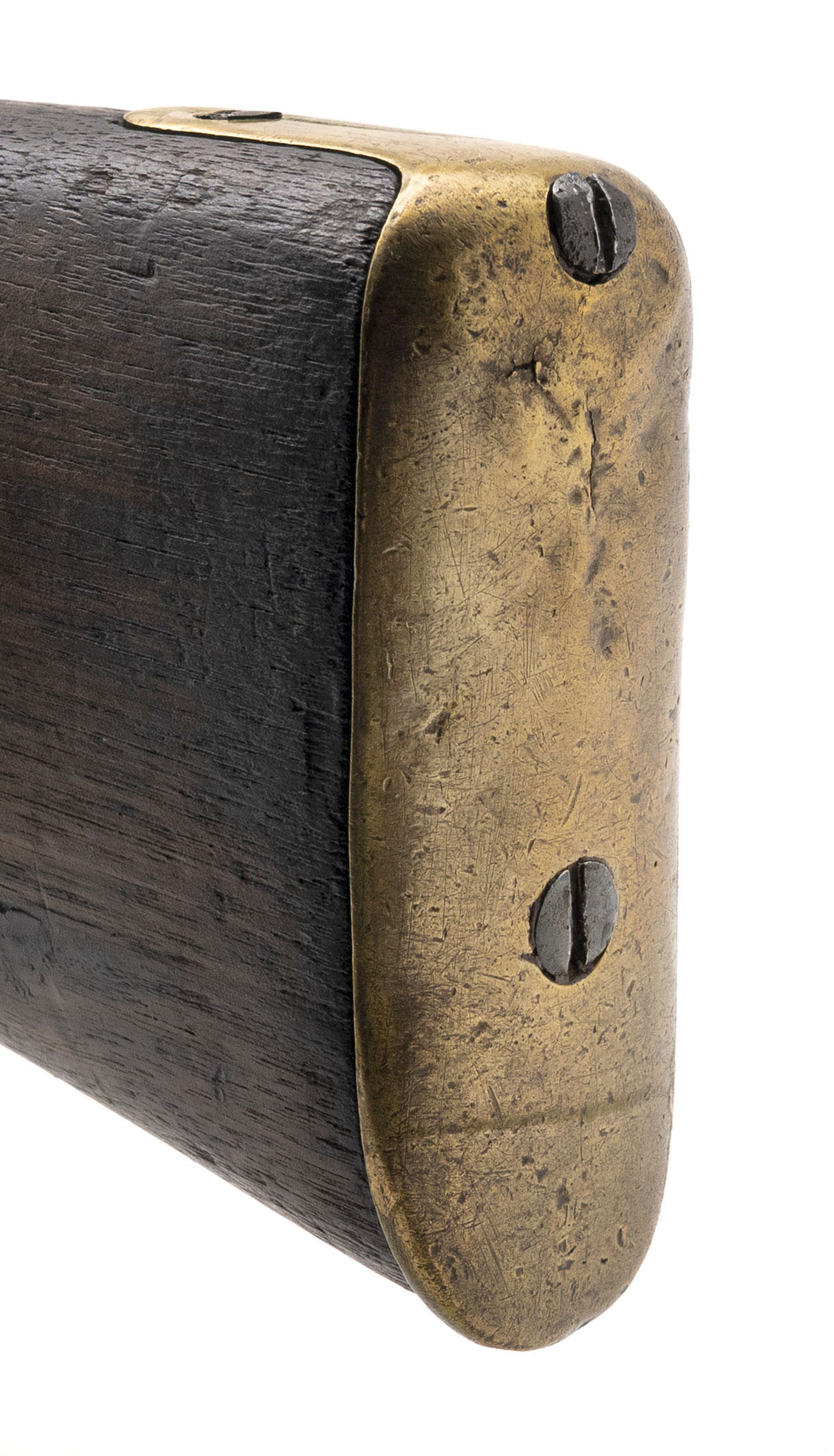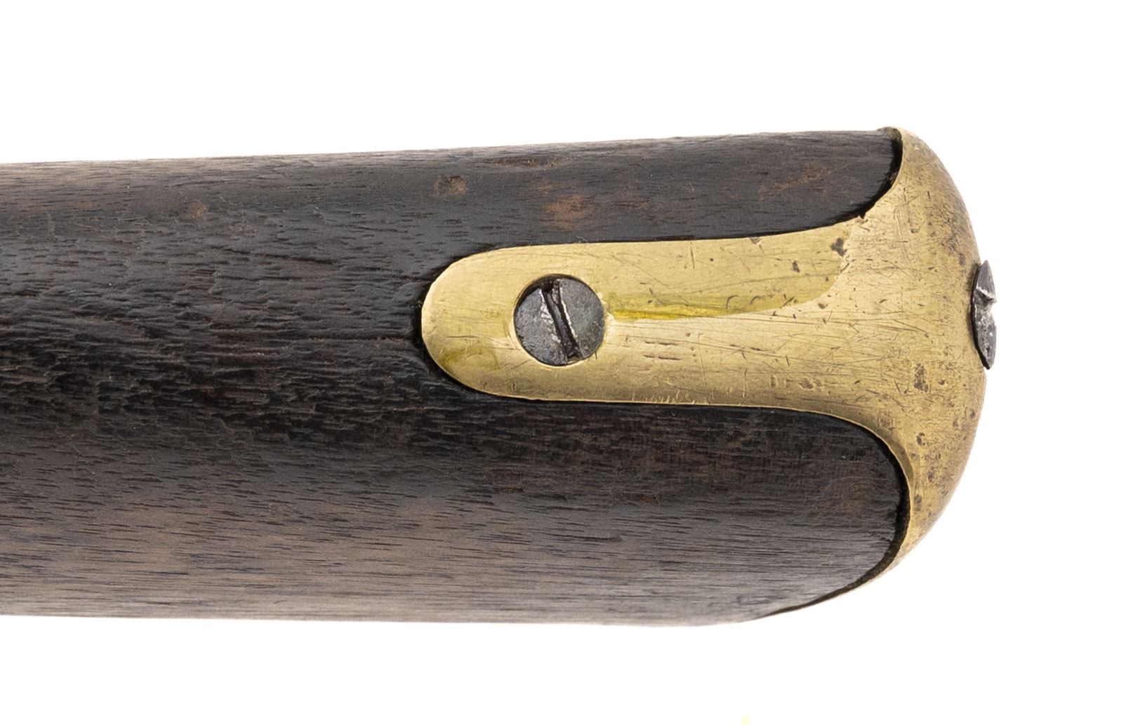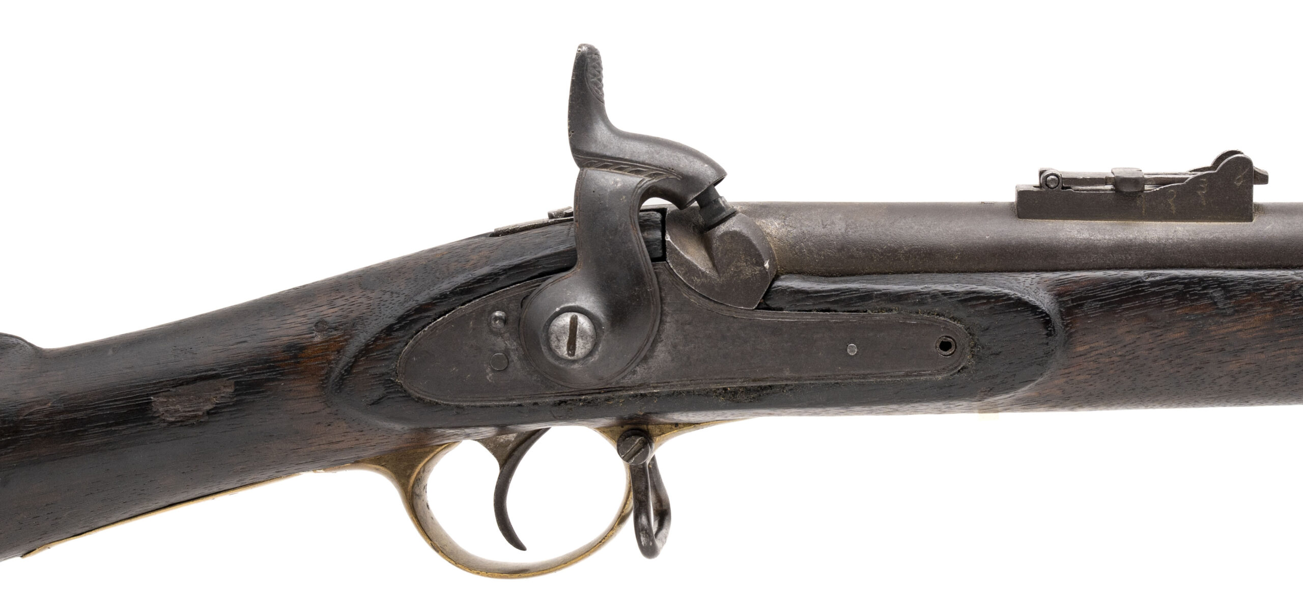 NSN, manufactured circa 1850s–1860s, .577 caliber, 39” round barrel. Metal surfaces show a smooth brown patina. Brass furniture has developed a pleasing aged finish, with Nepalese writing visible on the trigger guard. Stock is in good condition with light handling impressions throughout. Action holds at both half and full cock.