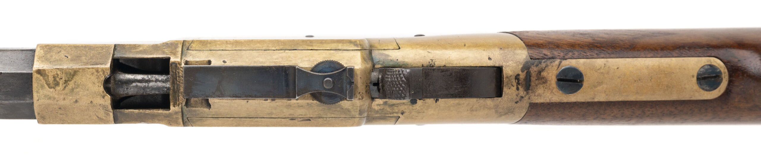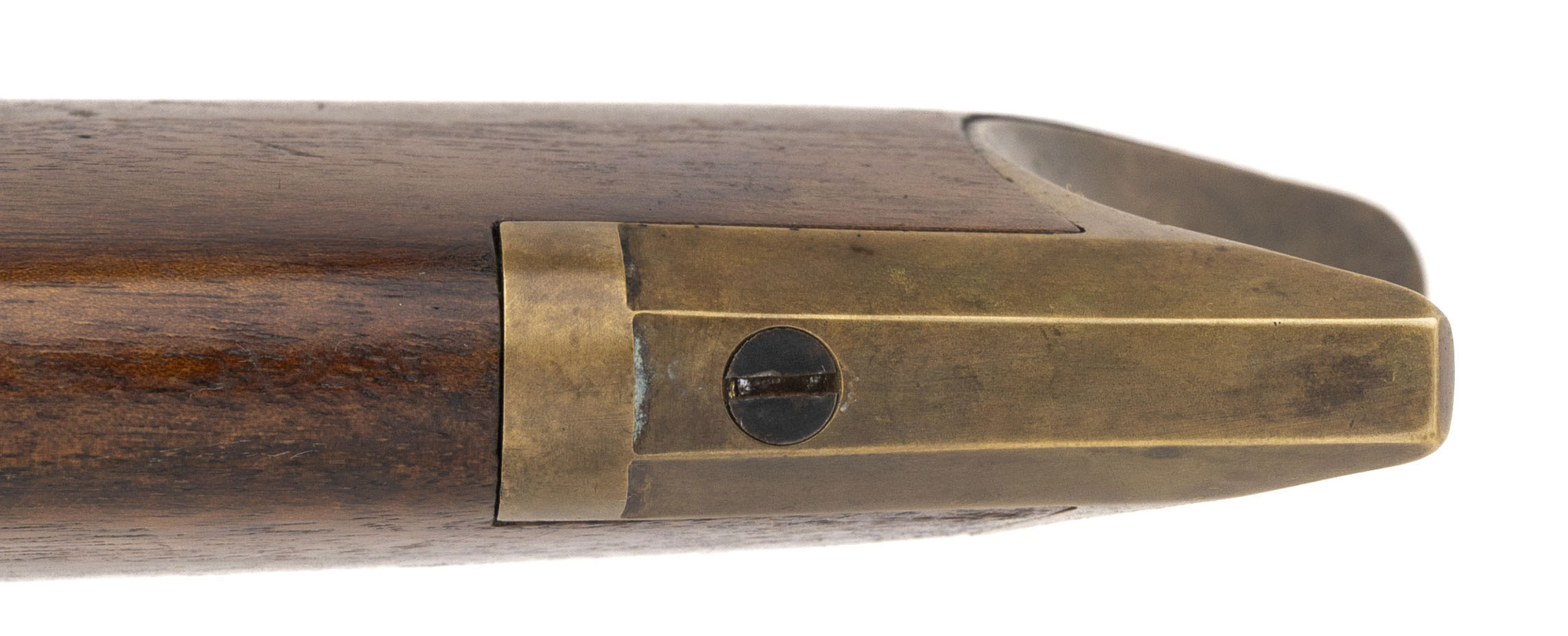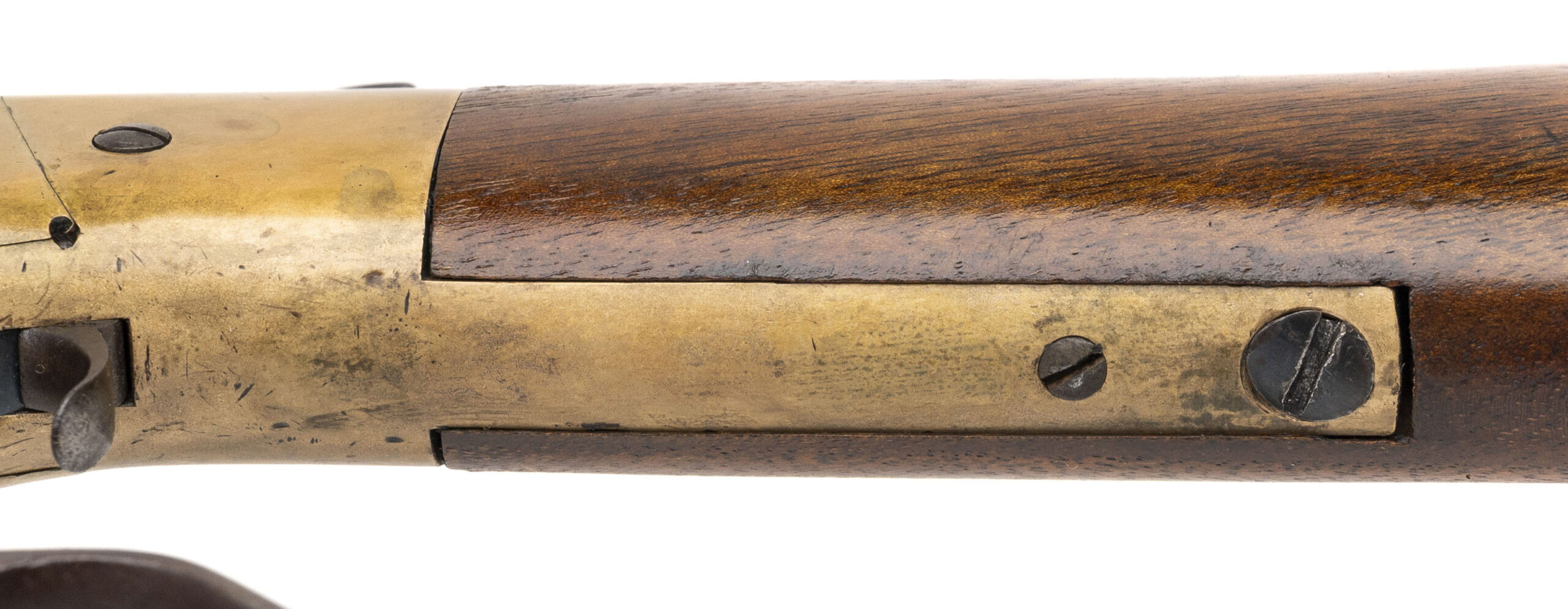 Serial number 70. Made circa 1857-1860. 41 Rocket ball caliber with a 21” barrel. This is a scarcer barrel length than you typically see. The barrel has been refinished. The frame is very good. The stock is a well made copy. The bore is dark with pitting, but does have strong visible rifling. The Volcanic carbine was an important step in developing the Winchester Rifle!