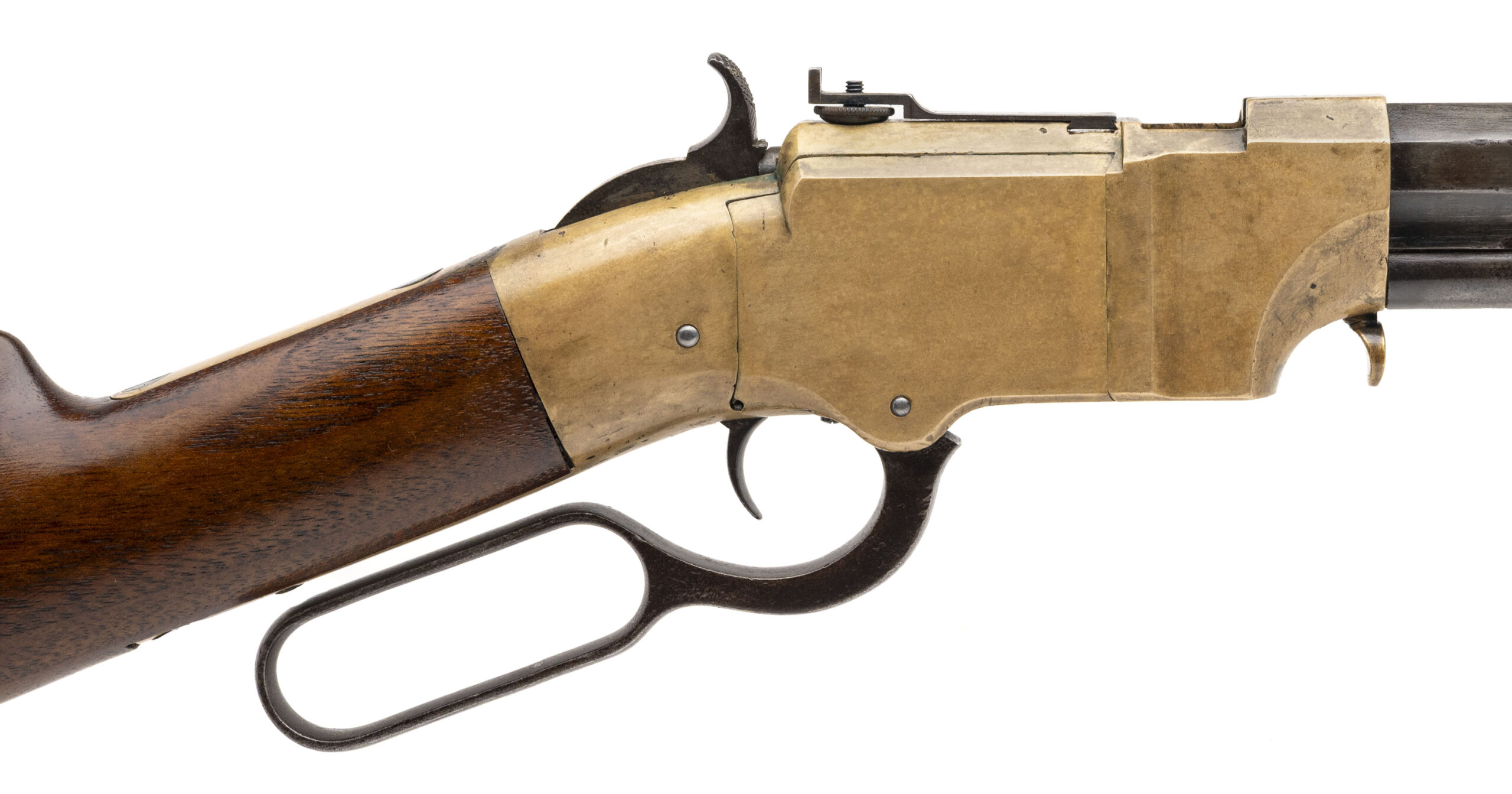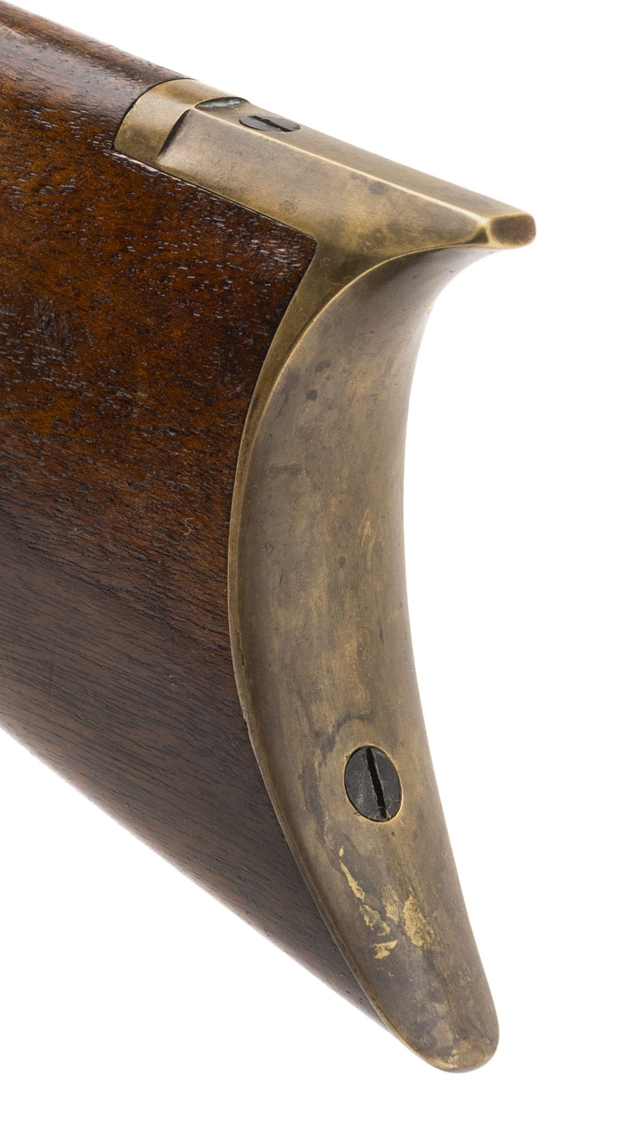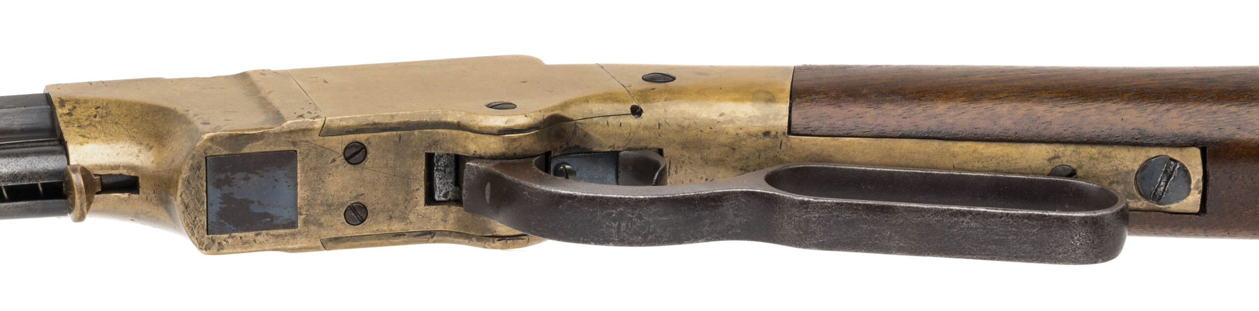 Serial number 70. Made circa 1857-1860. 41 Rocket ball caliber with a 21” barrel. This is a scarcer barrel length than you typically see. The barrel has been refinished. The frame is very good. The stock is a well made copy. The bore is dark with pitting, but does have strong visible rifling. The Volcanic carbine was an important step in developing the Winchester Rifle!
