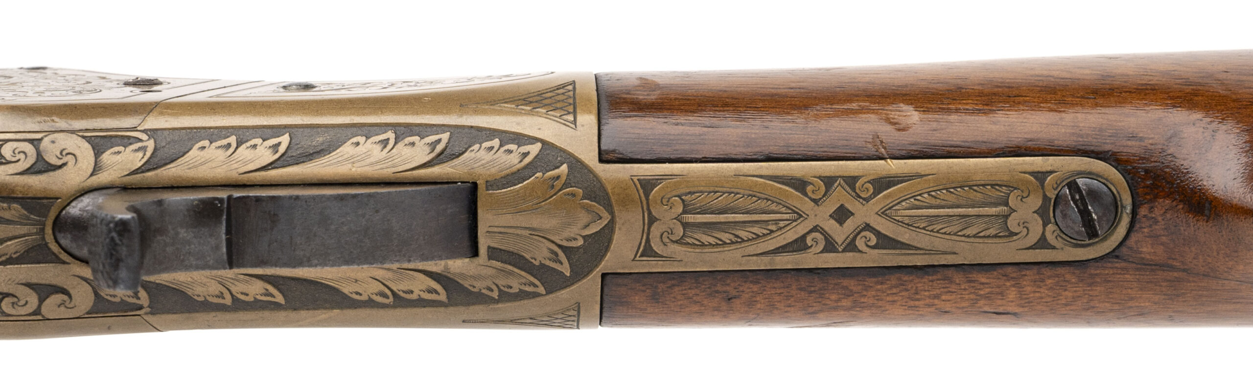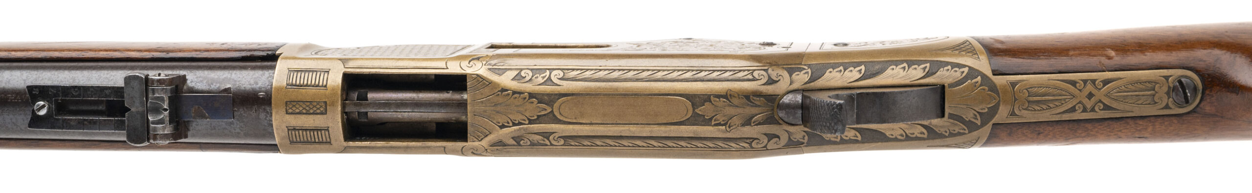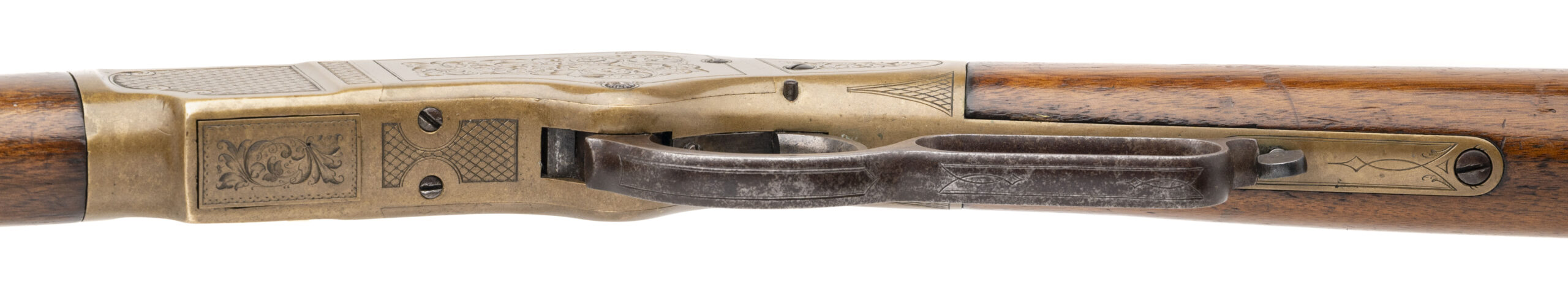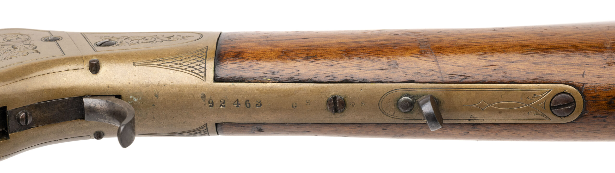 Serial number 92463. Made in 1872. 44RF caliber with a 27” barrel. The receiver is superbly engraved. The side plates have vinal scrolls and the frames havboth a cross hatch patter and scrolls within a border. The top of the frame is actually high relief chiseled. The engraving is period and is superb quality. The butt plate also is engraved mostly with cross hatching. The barrel has 75%-80% of the original mottled blue finish. All markings are perfectly legible. The is excellent as refinished during the period of use with a lighter color stain and varnish. Very attractive 1866 Musket!