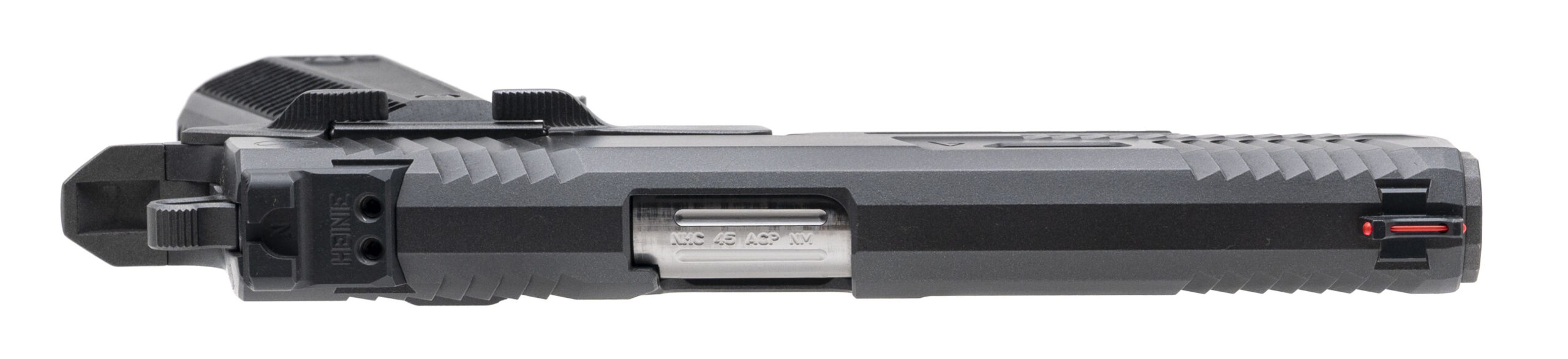 SN: NCP28500. Modern production, .45 Auto with an 5" crowned flush-cut barrel. Premium grade custom 1911 pistol with trigger job set with 3.5 to 3.75 pound trigger, smoke cerakote finish, G10 grips, and an accessory rail. Excellent condition with NHC carry bag and an extra magazine.