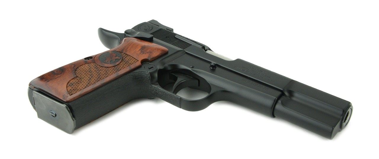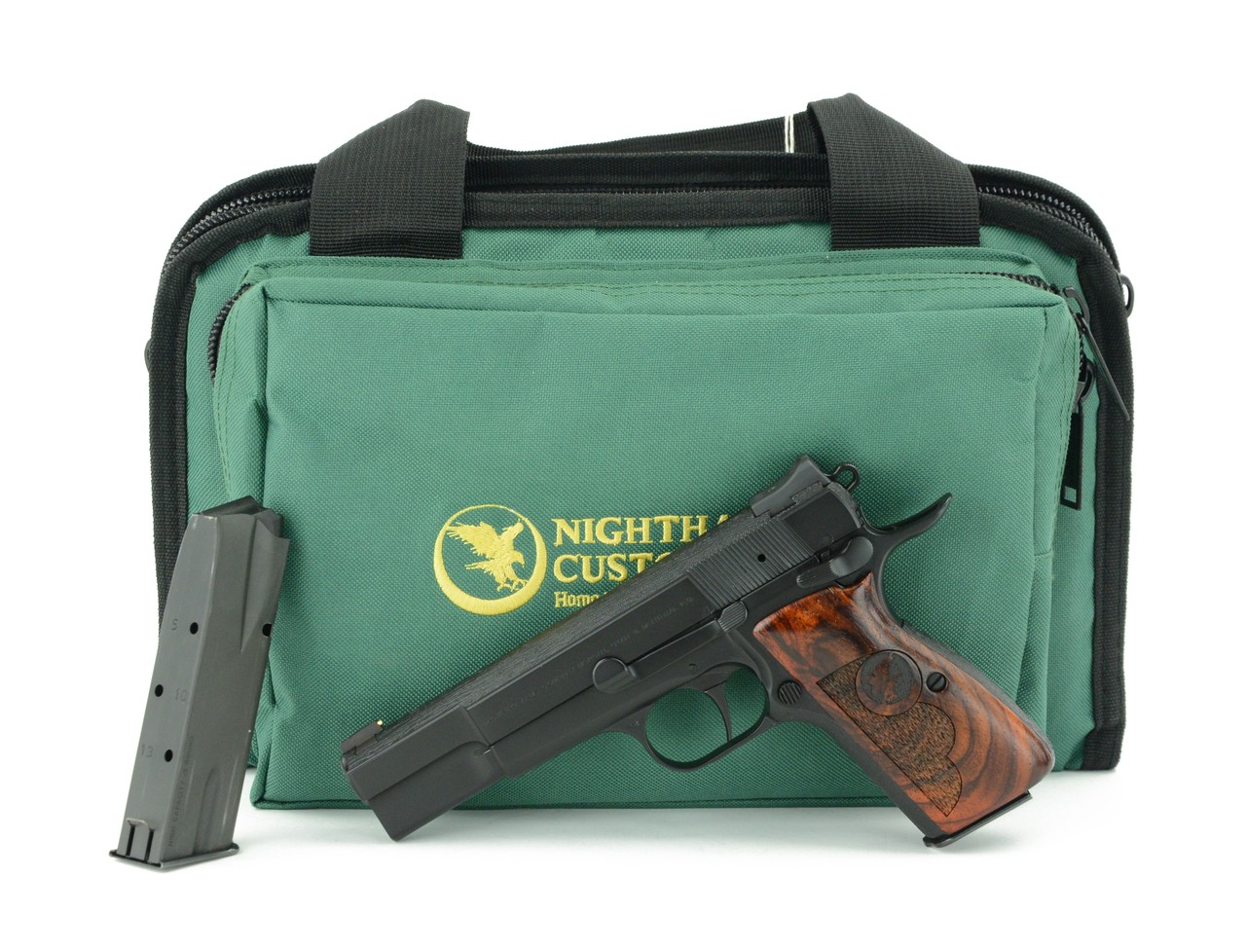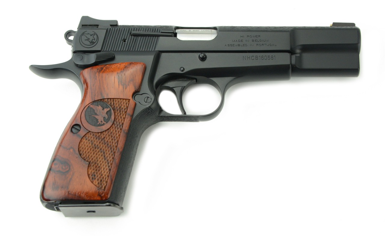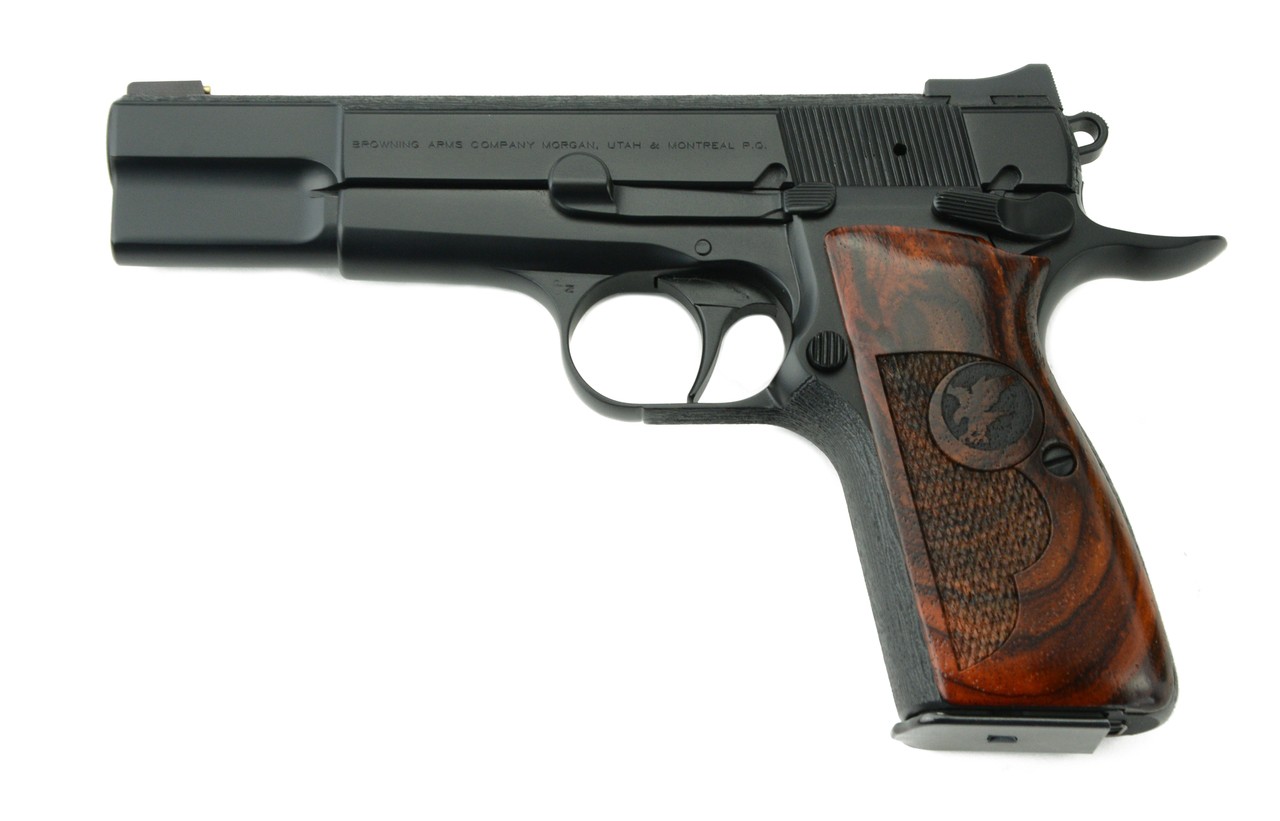 Nighthawk Custom Browning Hi-Power 9mm caliber pistol. Nighthawk Custom Hi-Power with gold bead sight and beautiful wood grips. Excellent condition with bag and extra mag.