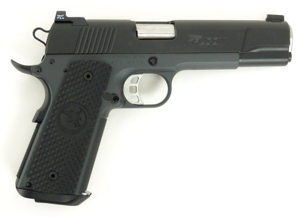 Nighthawk Custom Falcon 10mm caliber pistol. Desirable 10mm pistol with 5” barrel, Heine night sights, top slide serrations, magwell, and extra magazine. New