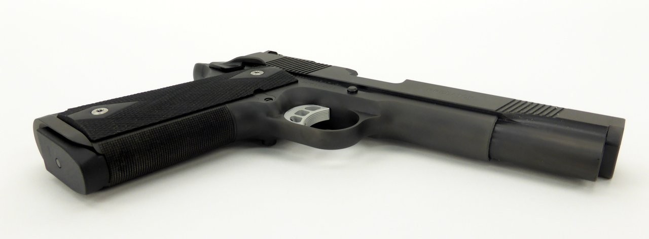 Nighthawk Custom Predator .45 ACP caliber pistol. Special order model with 5" flanged barrel and Tritium adjustable sights. Has thin Micarta grips. Excellent condition with bag and magazine. Special Sale