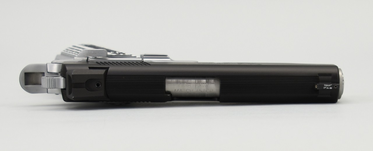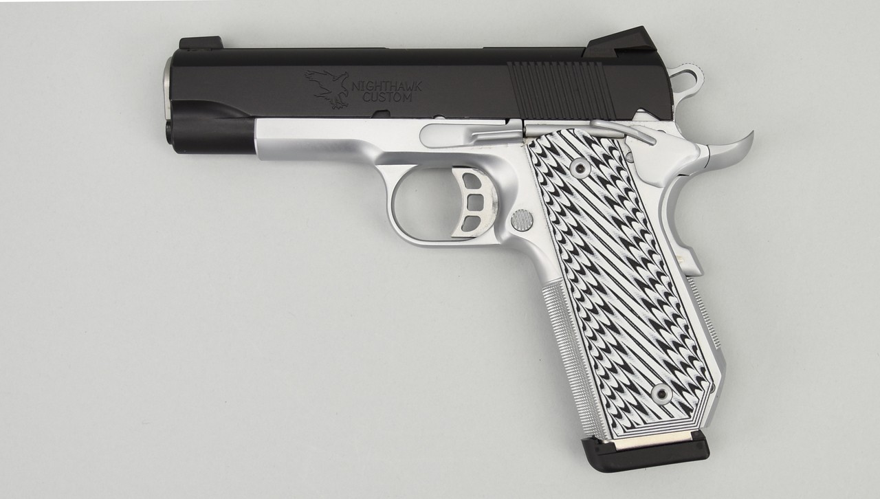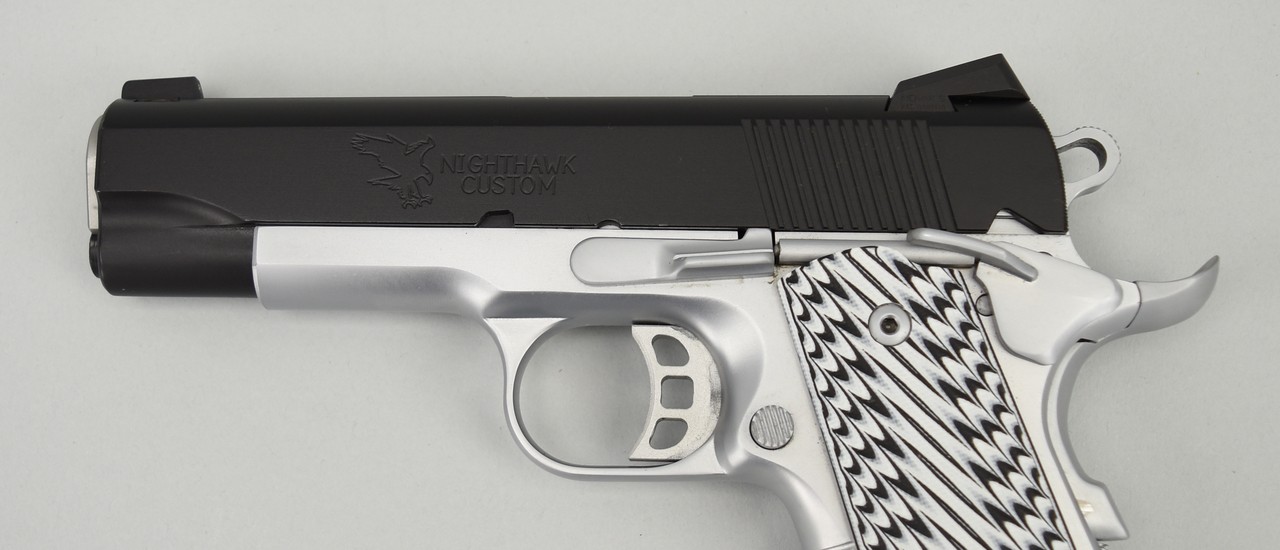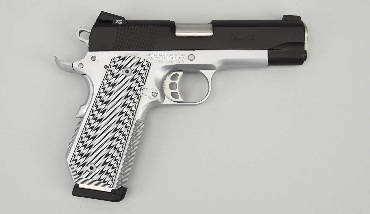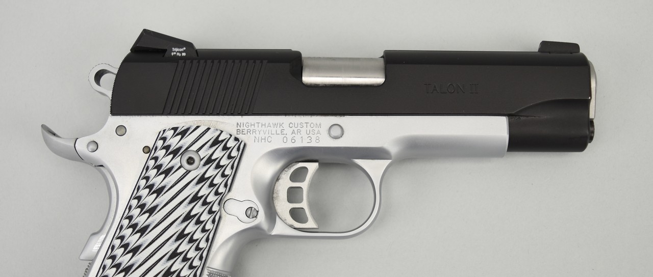Nighthawk Talon II.45 ACP caliber pistol. Commander 4 ¼” size carry gun with 2-tone finish, Bobtail grips, and night sights. Excellent condition with bag and extra magazine.