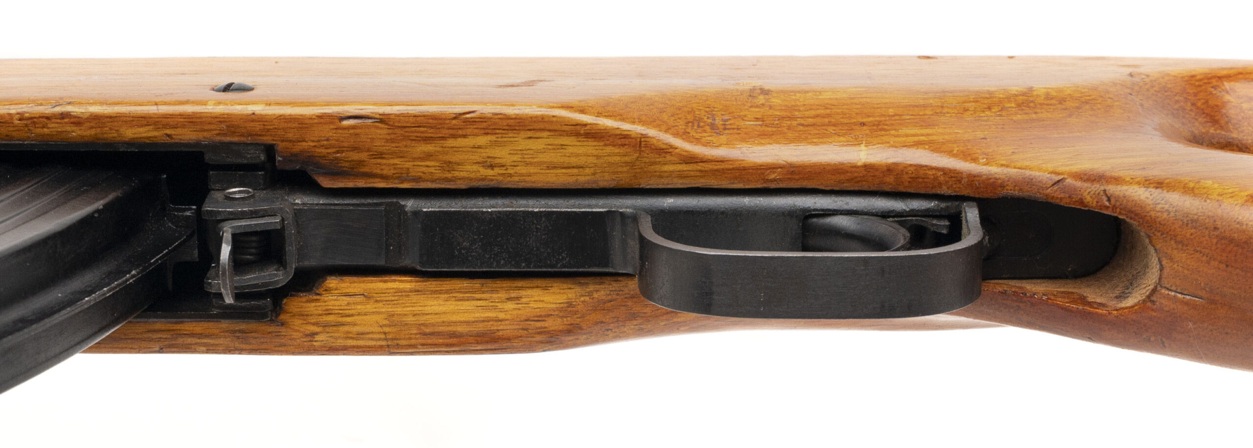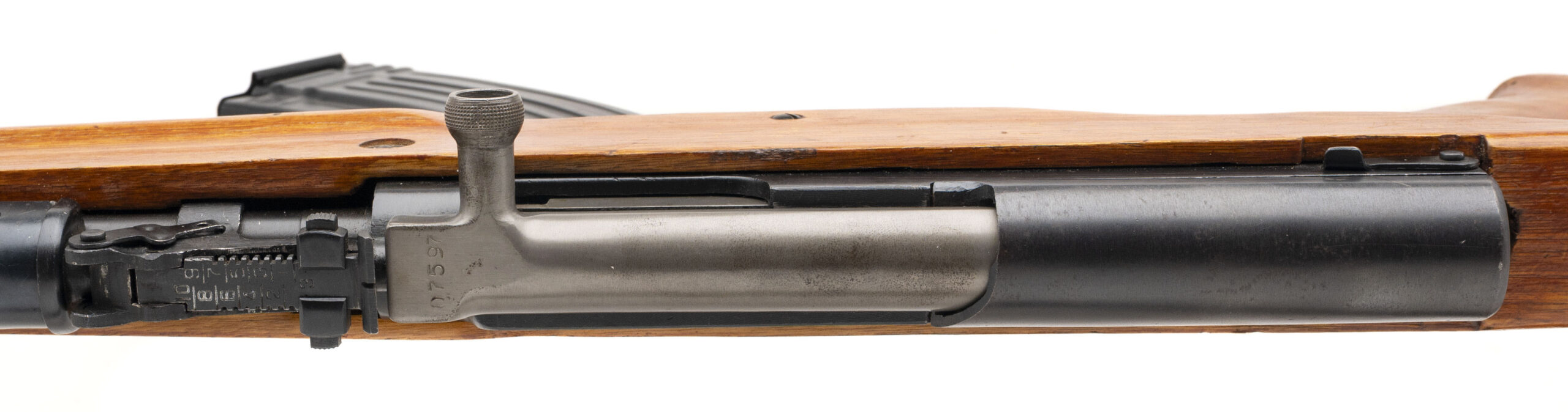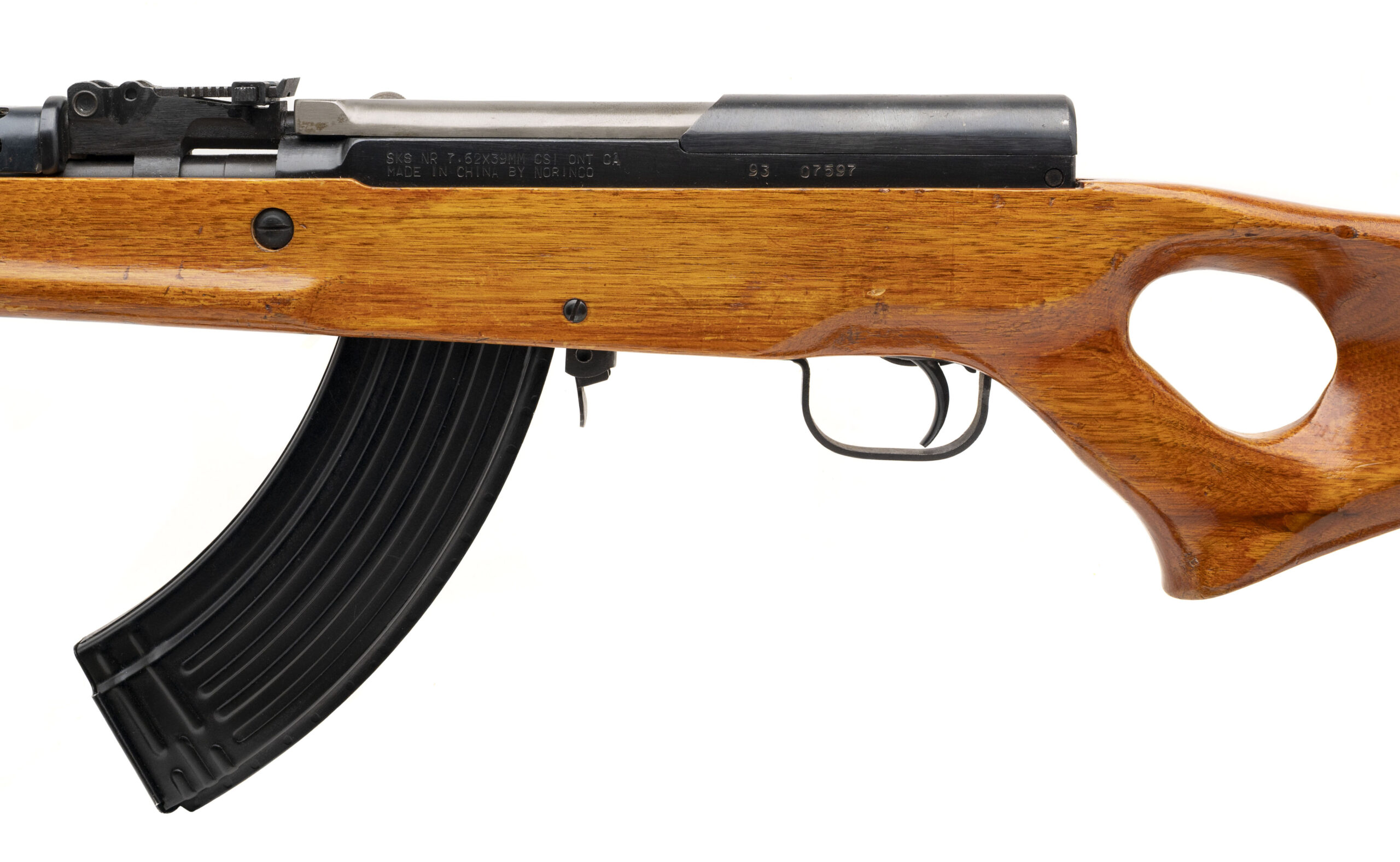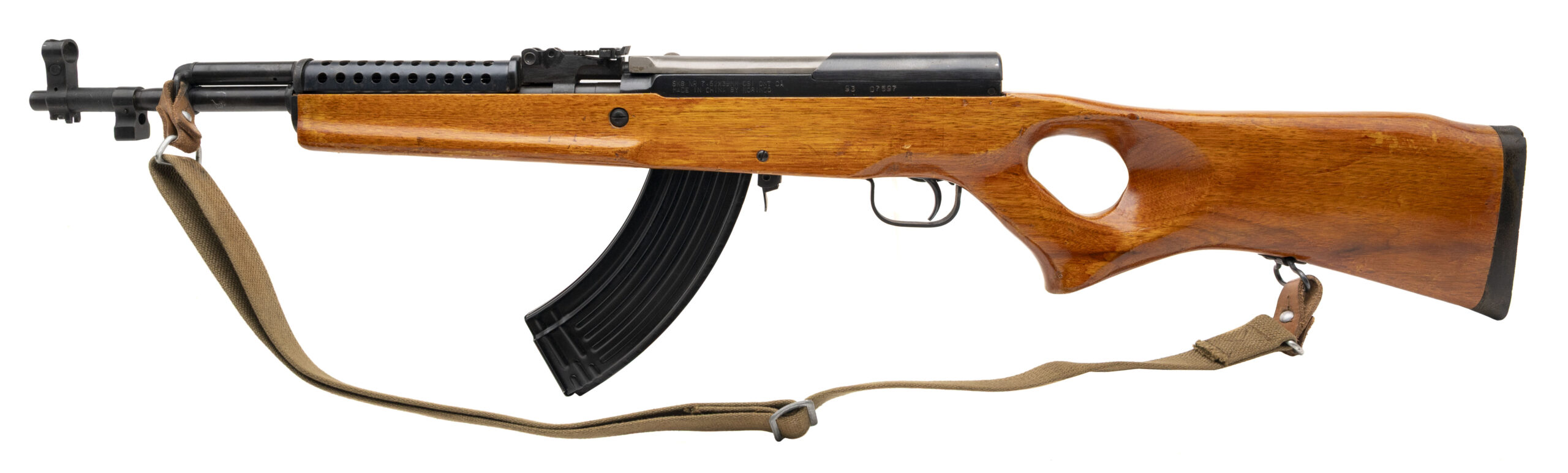 Serial Number 9307597. Made in 1993 with a 16.5-inch barrel that has a bright bore with strong visible rifling. Imported by China Sports in post-ban configuration with a thumbhole stock & a neutered bayonet mounting lug. This desirable model was engineered to accept Kalashnikov detachable box magazines. Overall condition is excellent with original factory finish across the metallic parts & minor handling wear on the stock. Comes with one steel 30-round magazine, a ventilated sheet metal handguard & a Chinese webbed sling.