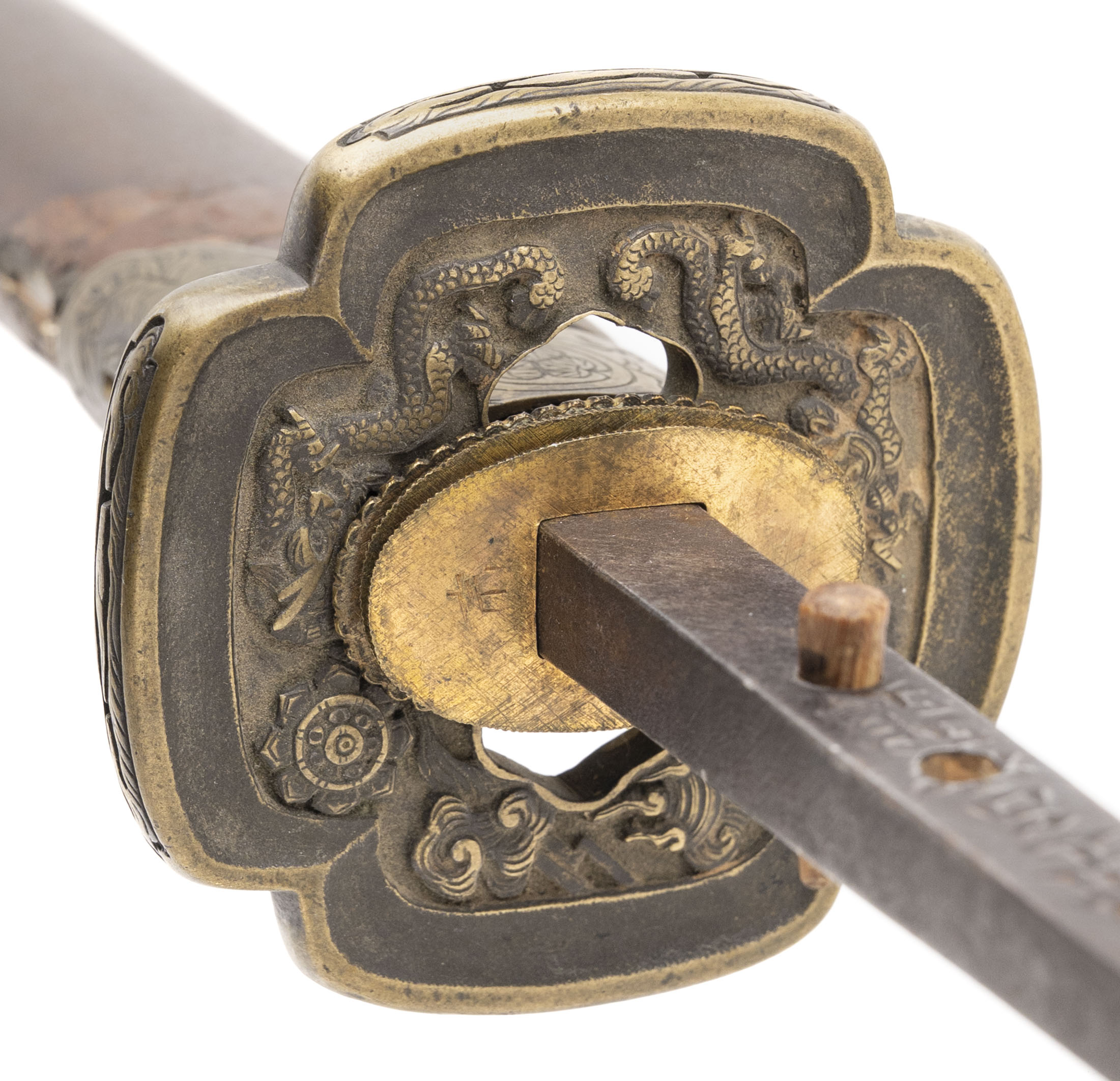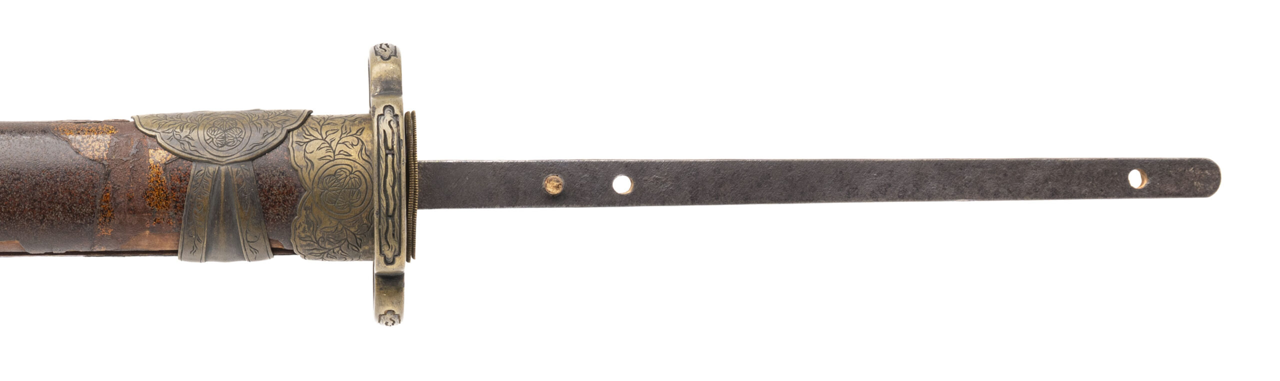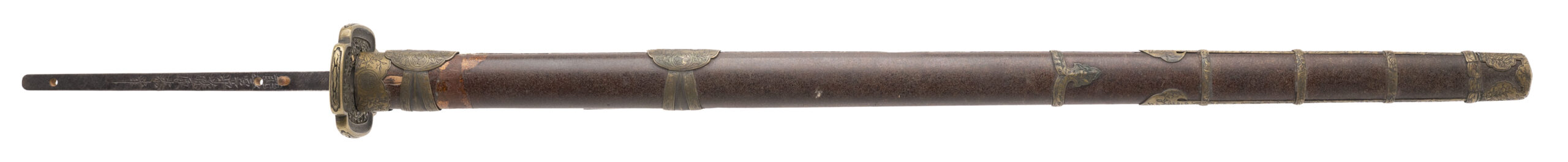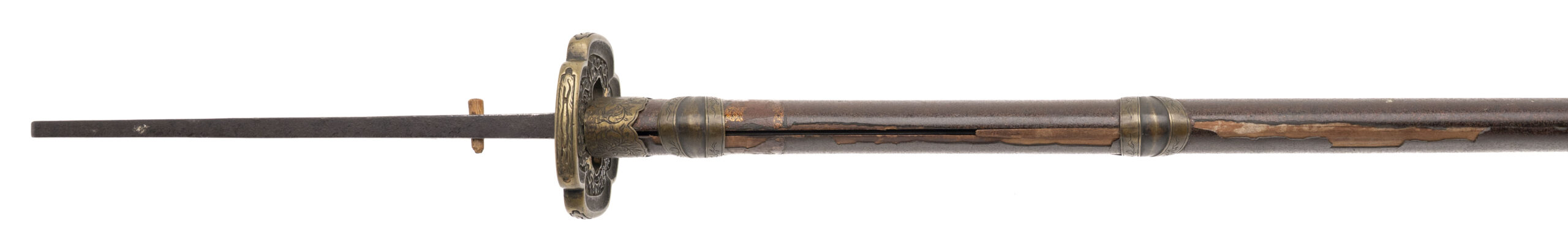 Blade: A massive ōmi-yari with a nagasa of 28” — unusually long for the type. The blade is of su-yari form, double-edged with a long central ridge and a deep bo-hi extending down the shaft. The geometry remains sharp and crisp, with a rounded spear point (minor edge bruise noted). Bright polish shows a clean ji and activity in the ha, though some areas display surface scratches and cloudiness from earlier oxidation. Nakago: Long tang with two mekugi-ana, cut with the detailed mei: 「能登国住藤原義之」 (Noto Kuni jū Fujiwara Yoshiyuki). Translation: “Yoshiyuki of the Fujiwara clan, residing in Noto Province.” Yasurime are straight, typical of Edo-period workmanship. Mounts: Unusually, this yari is found in katana-style mounts rather than on a pole. • Tsuba: Heavy brass/bronze guard of mokko-gata form, decorated in low relief with twin coiling dragons among clouds on the obverse and reverse. The carving is detailed, with additional symbolic motifs including a Buddhist wheel. The hitsu-ana are intact. • Saya: Lacquered wood saya fitted with decorative brass bands and kojiri. The lacquer finish shows flaking and wear but retains its original Edo-period character. • Other fittings: The tsuka (handle) is missing, but seppa and other spacers remain present. Condition: The blade is in a bright polish, with some abrasions and a few surface blemishes, but overall remains impressive. Mounts are worn, with lacquer losses to the saya, but all major components are intact and display well. Remarks: Ōmi-yari of this size are rare, especially when signed and mounted in katana-style koshirae. The blade’s mei attributes it to Fujiwara Yoshiyuki of Noto Province, a documented Edo-period smith. This was not a battlefield yari but rather a prestige piece — likely for ceremonial or display use in the late Edo period.