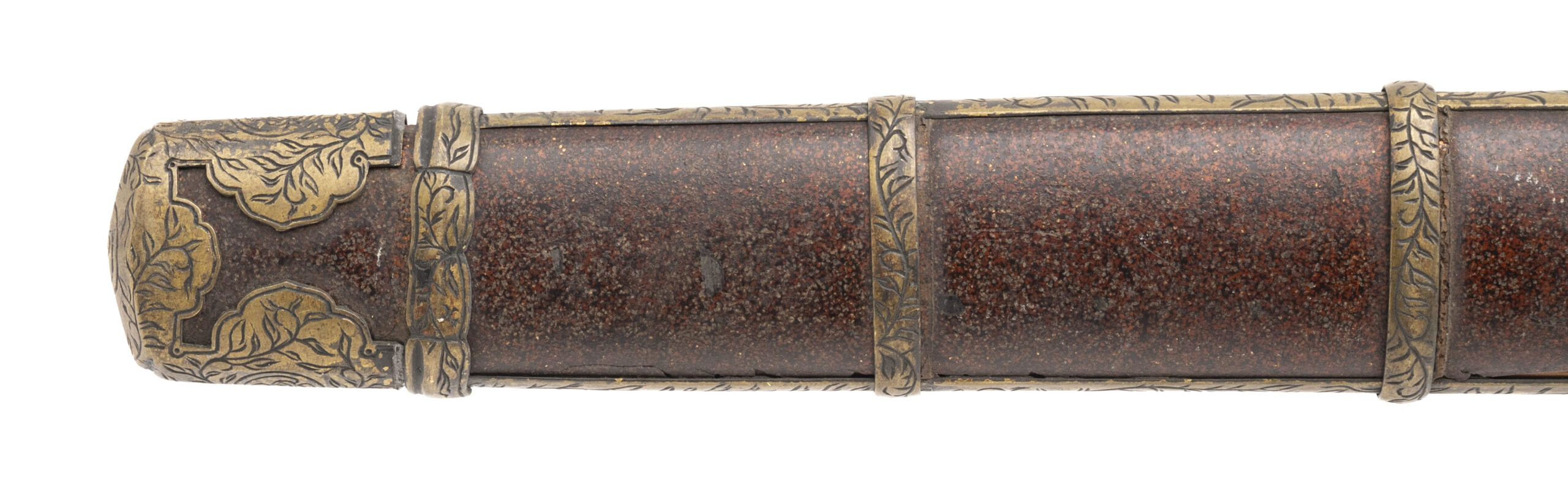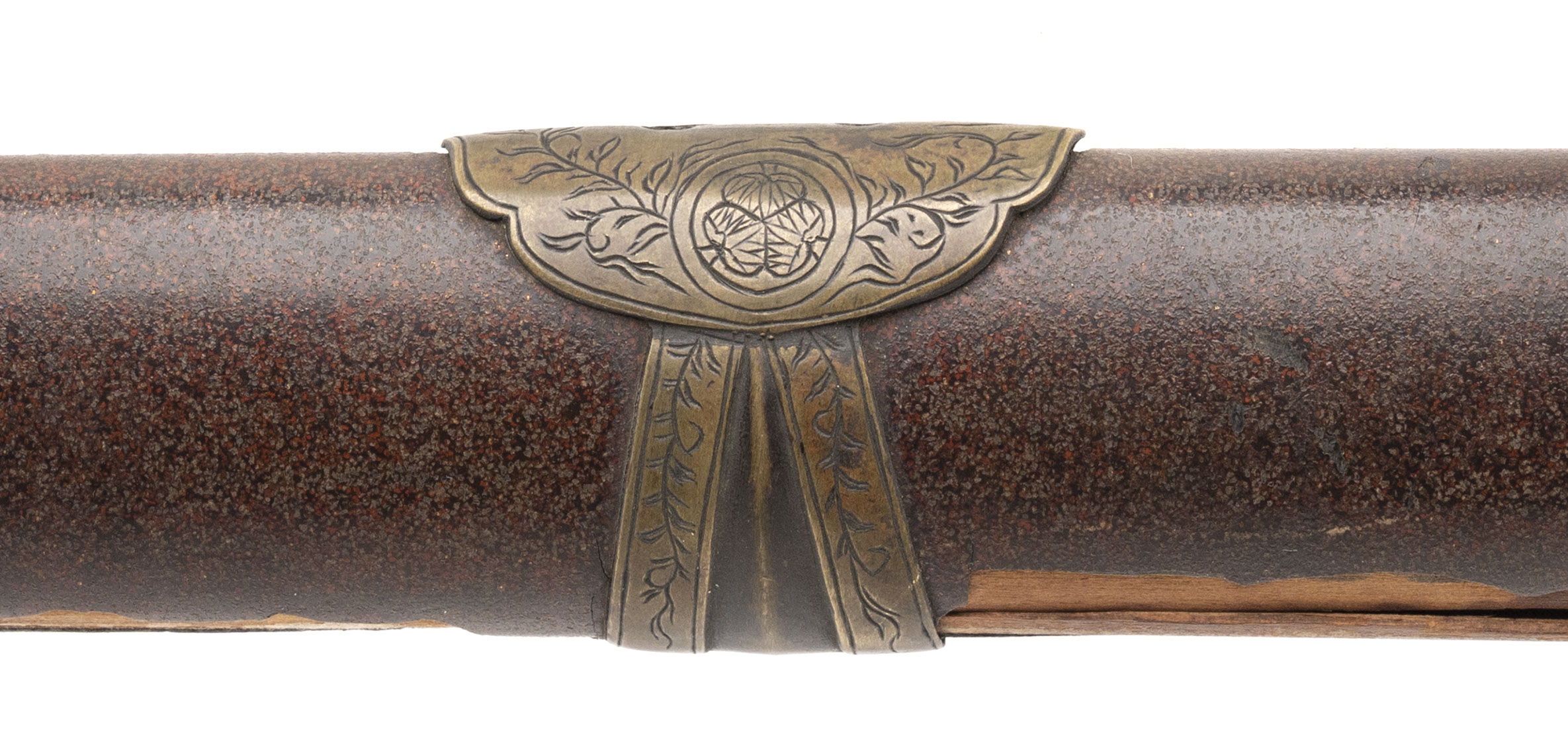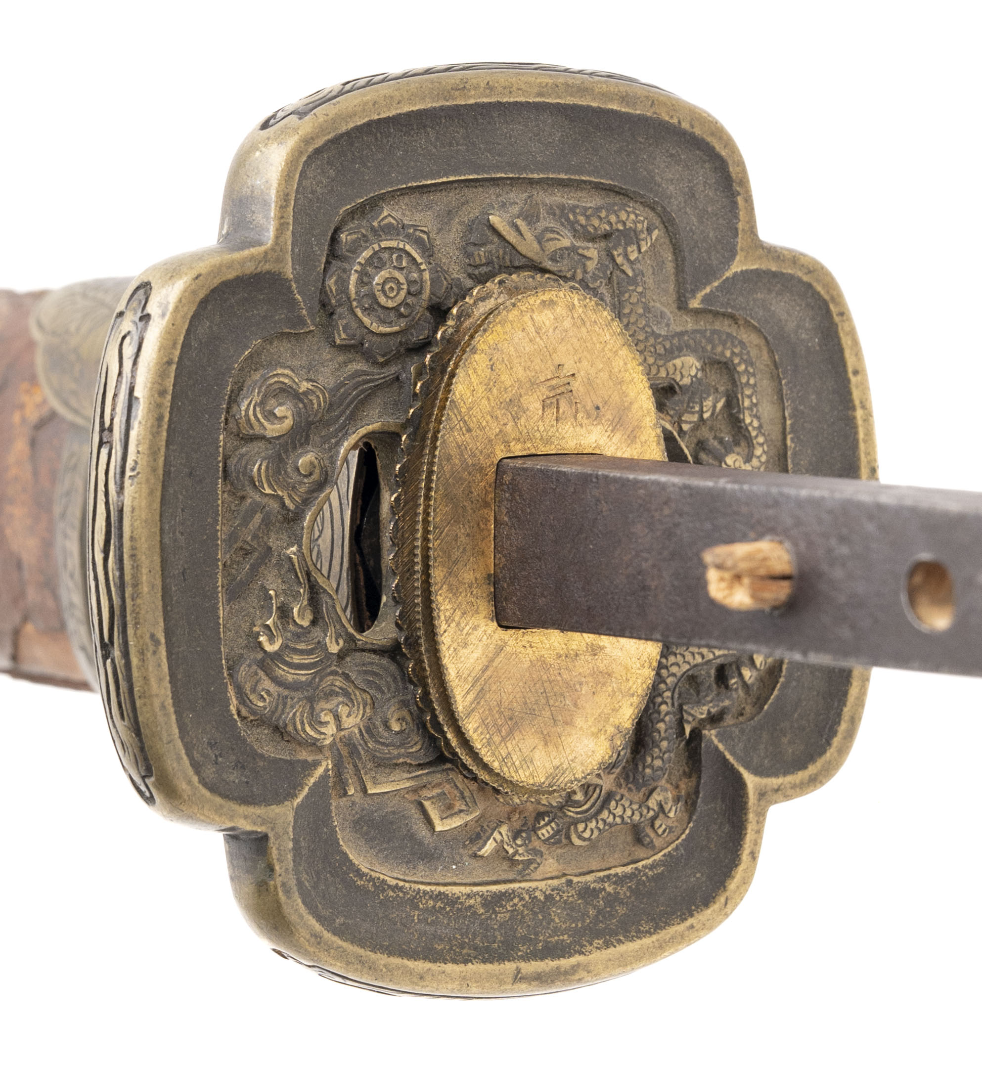 Blade: A massive ōmi-yari with a nagasa of 28” — unusually long for the type. The blade is of su-yari form, double-edged with a long central ridge and a deep bo-hi extending down the shaft. The geometry remains sharp and crisp, with a rounded spear point (minor edge bruise noted). Bright polish shows a clean ji and activity in the ha, though some areas display surface scratches and cloudiness from earlier oxidation. Nakago: Long tang with two mekugi-ana, cut with the detailed mei: 「能登国住藤原義之」 (Noto Kuni jū Fujiwara Yoshiyuki). Translation: “Yoshiyuki of the Fujiwara clan, residing in Noto Province.” Yasurime are straight, typical of Edo-period workmanship. Mounts: Unusually, this yari is found in katana-style mounts rather than on a pole. • Tsuba: Heavy brass/bronze guard of mokko-gata form, decorated in low relief with twin coiling dragons among clouds on the obverse and reverse. The carving is detailed, with additional symbolic motifs including a Buddhist wheel. The hitsu-ana are intact. • Saya: Lacquered wood saya fitted with decorative brass bands and kojiri. The lacquer finish shows flaking and wear but retains its original Edo-period character. • Other fittings: The tsuka (handle) is missing, but seppa and other spacers remain present. Condition: The blade is in a bright polish, with some abrasions and a few surface blemishes, but overall remains impressive. Mounts are worn, with lacquer losses to the saya, but all major components are intact and display well. Remarks: Ōmi-yari of this size are rare, especially when signed and mounted in katana-style koshirae. The blade’s mei attributes it to Fujiwara Yoshiyuki of Noto Province, a documented Edo-period smith. This was not a battlefield yari but rather a prestige piece — likely for ceremonial or display use in the late Edo period.
