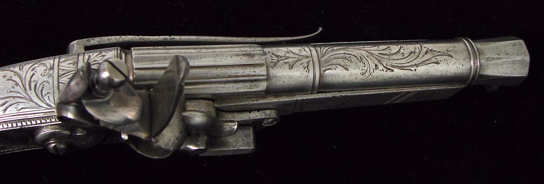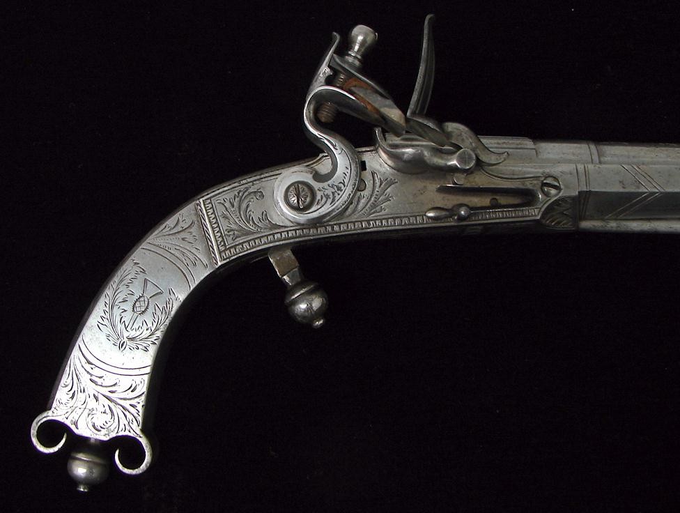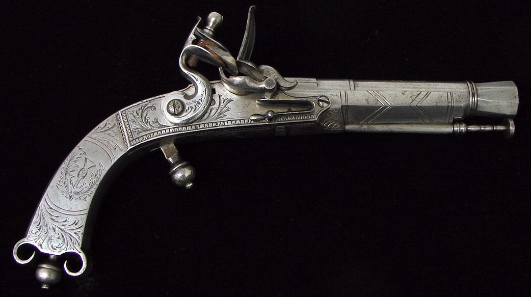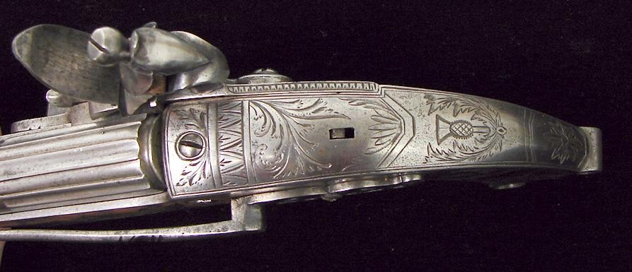 Pair of Scottish Highland Dress Flintlock Pistols. All metal rams horn butts. Guns are unsigned and are very nicely engraved with Scottish Acorn and Thistle motifs. Barrels are 6" long and 10 1/2" overall length. The cock on one pistol is replaced and very well done. Very hard to find a Highland dress pistol in flintlock. Reasonably priced pair.