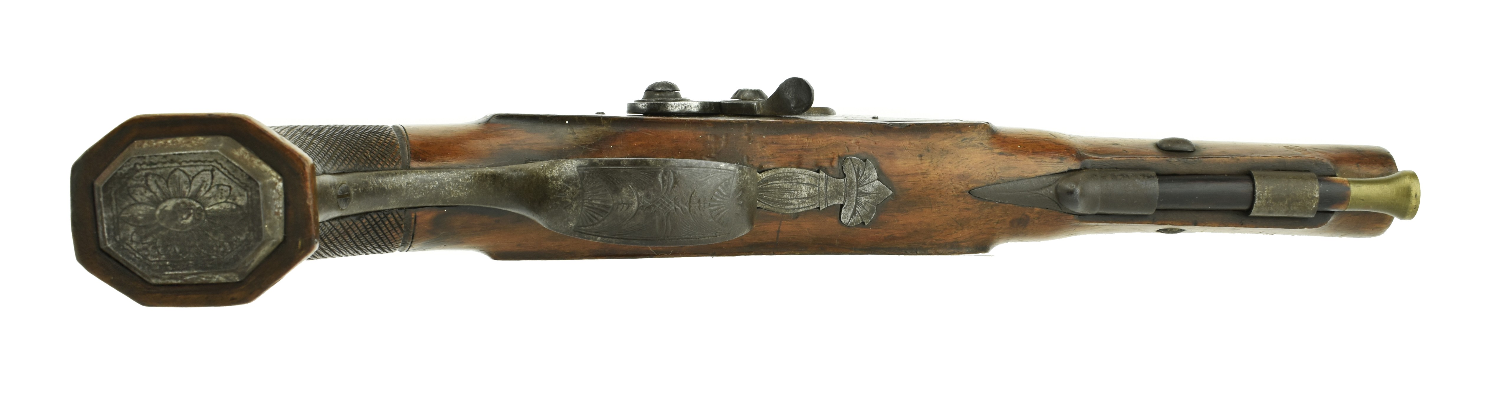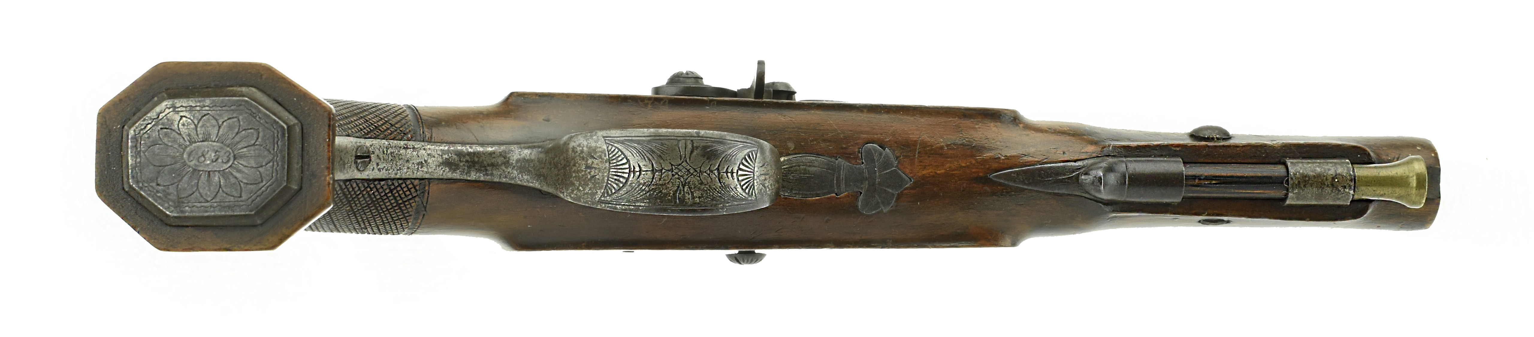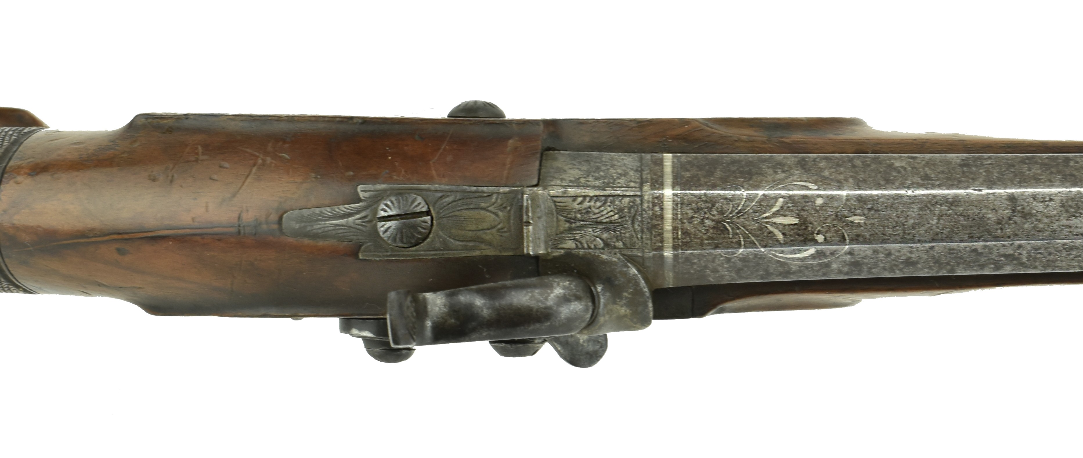 Pair of Unmarked German Percussion Travelers Pistols. Large .55 Cal Bores Pistols have hammer block safties. Barrels are 5 ¼” length and overall length is 11”. These are well made pistols probably of the 1820’s to 1830’s. Buttcap, trigger guard, barrels, lock, breench plug, tang and hammers are all engraved. Stocks are about excellent with very minor wear. No chips or cracks. Checkering is excellent . Barrels have silver inlays as does the silver banded breech plug. Actions work perfectly. Fine pair of travelers pistols.
