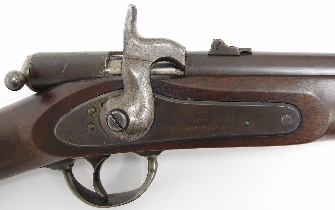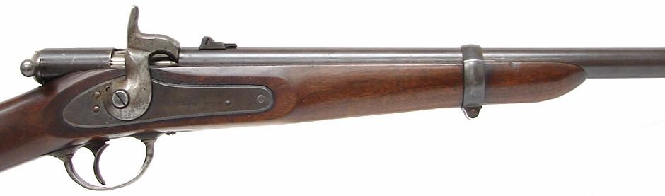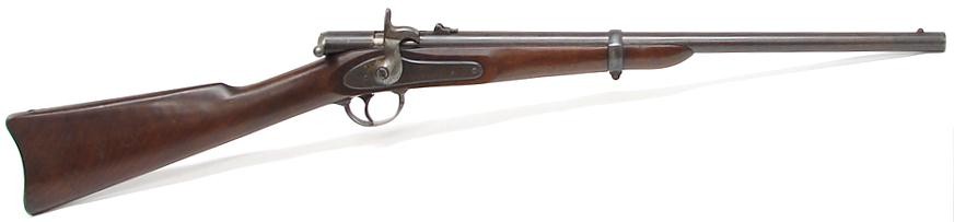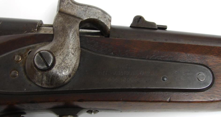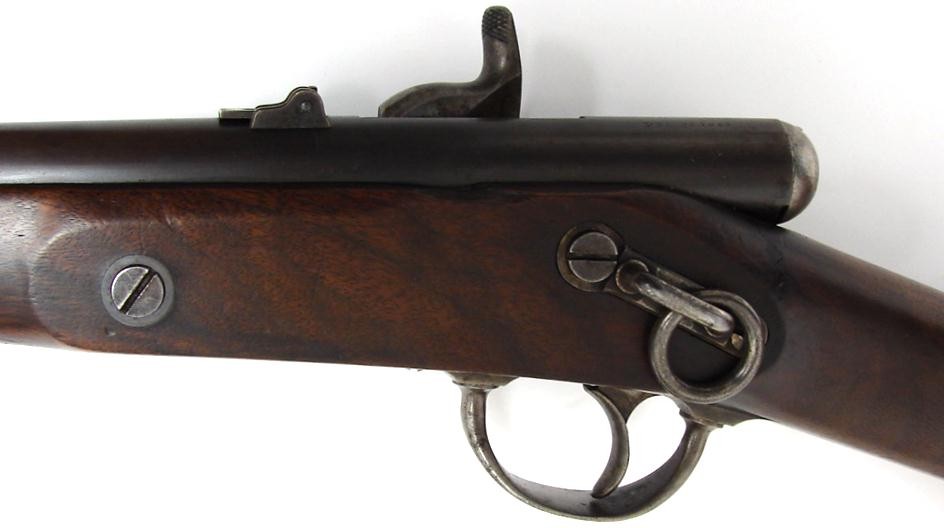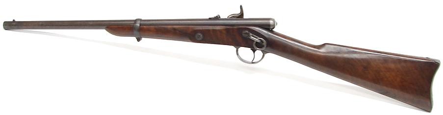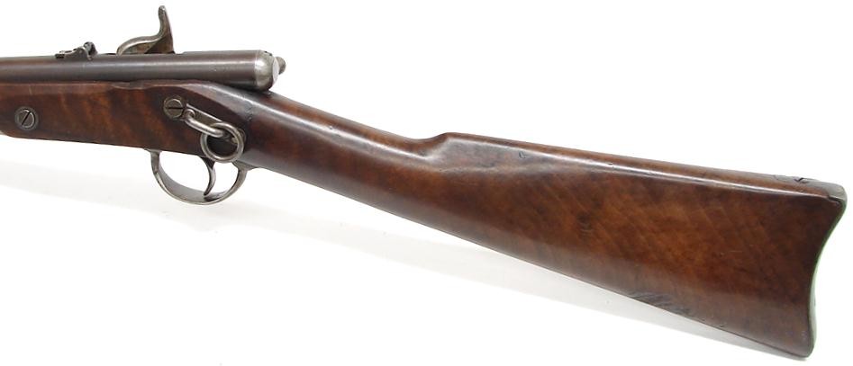 Palmer Civil War carbine with original brown on barrel. Thinned wood is very good but has a deep gouge on lower left of buttstock. Gun is very good plus.