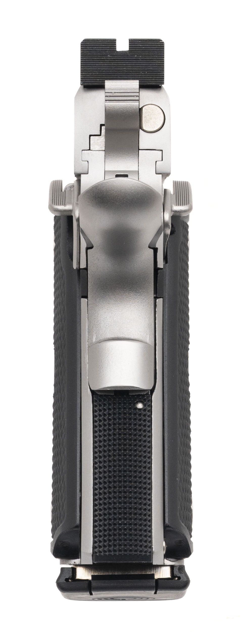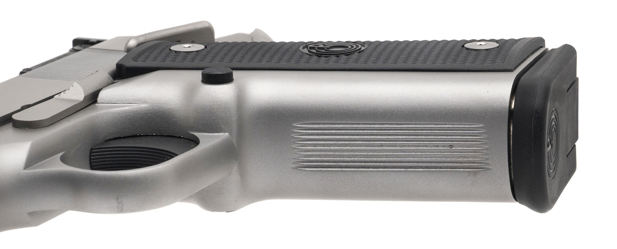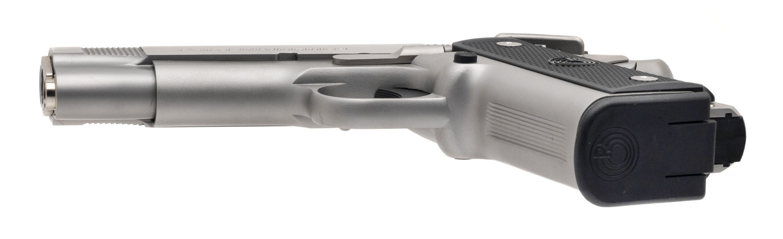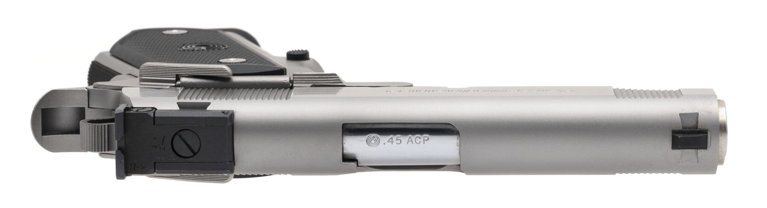 SN: HL2336. 1990s vintage, .45 ACP with a 4.25" barrel. Bore is very good. Vintage double stack stainless steel frame 1911 style pistol with an adjustable rear sight, ambidextrous manual thumb-safety, and checkered polymer grips. Metal shows minor marks. Overall condition is near excellent. Includes original case.