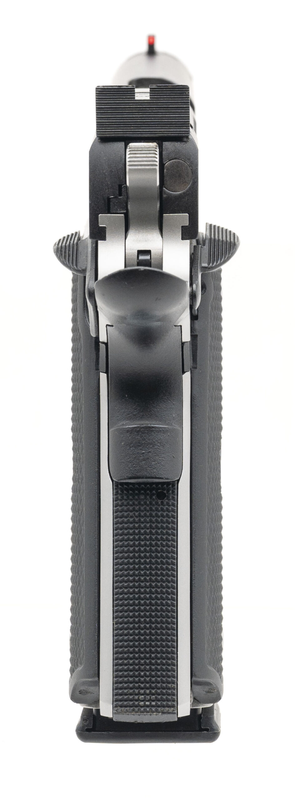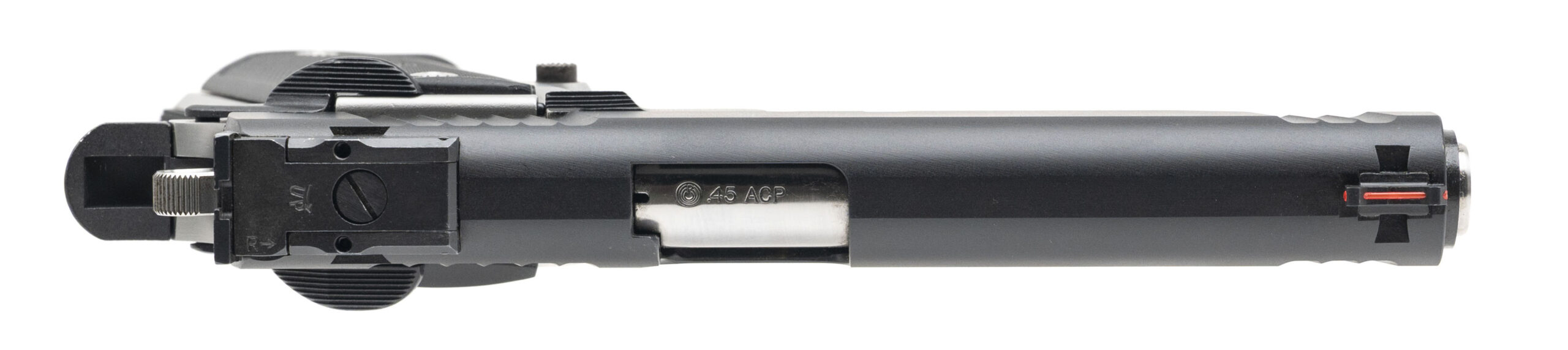 SN: P236125. Modern production, .45 ACP with a 5" barrel. Bore is excellent. Steel frame double-stack 1911 style pistol with a fiber-optic front sight, adjustable rear sight, ambidextrous manual thumb-safety, accessory rail, two-tone finish, and checkered polymer grips. Metal shows minor marks. Includes an additional magazine, and original case. Overall condition is near excellent.