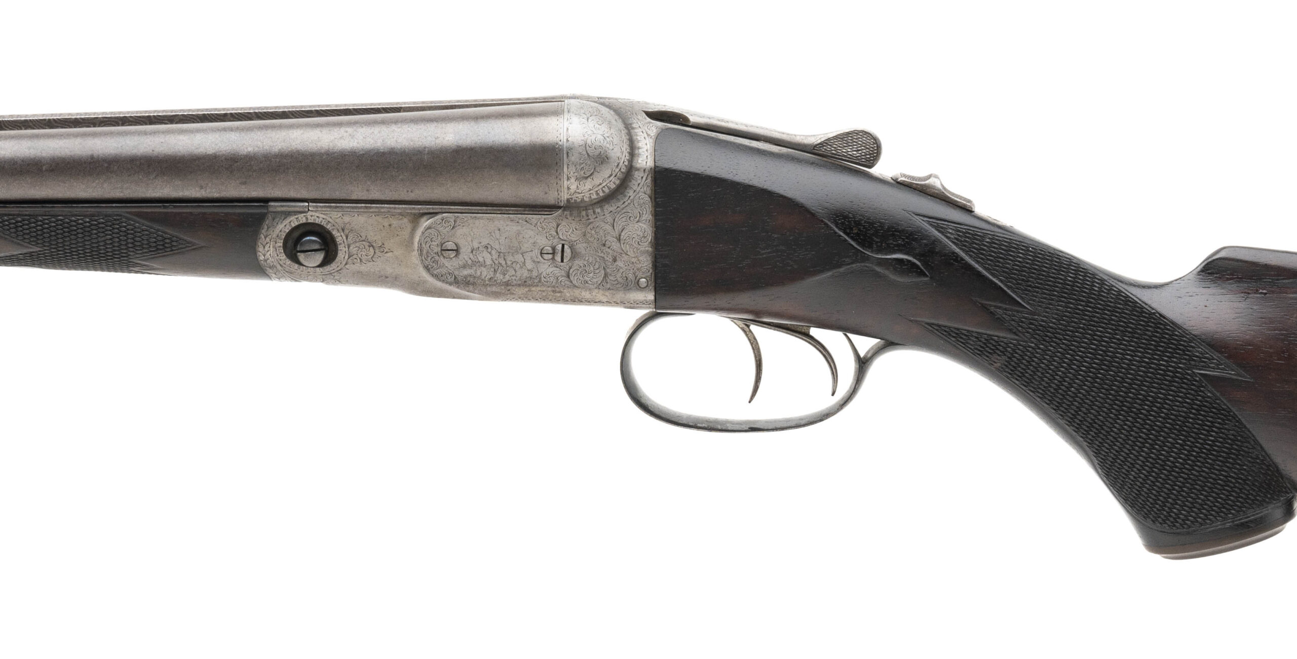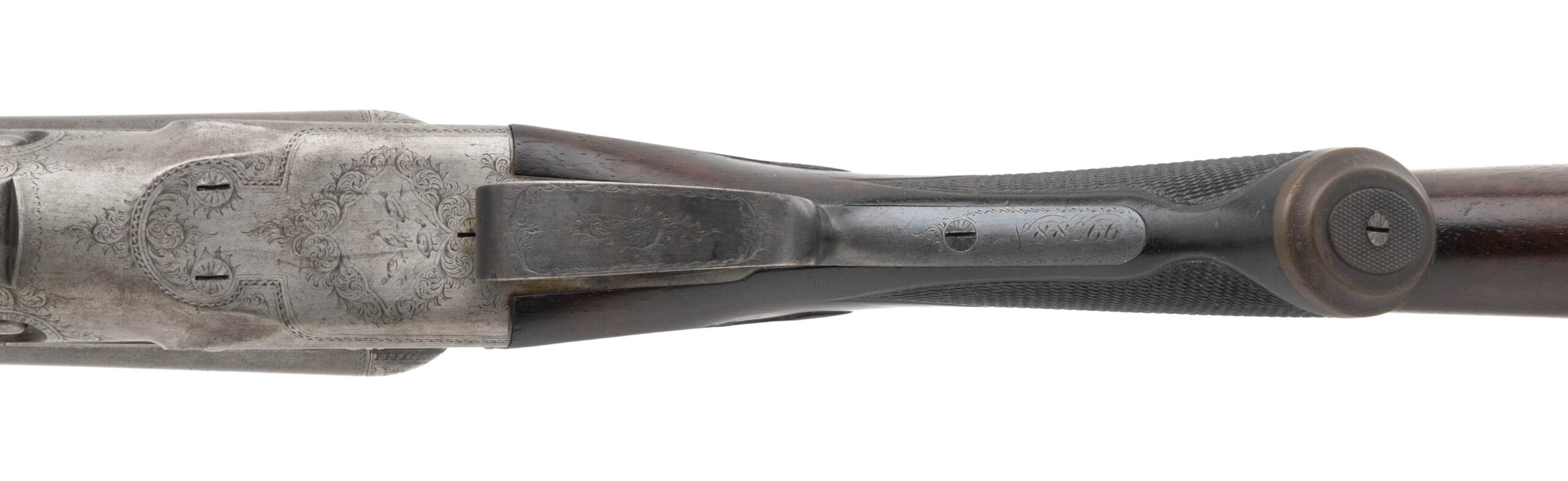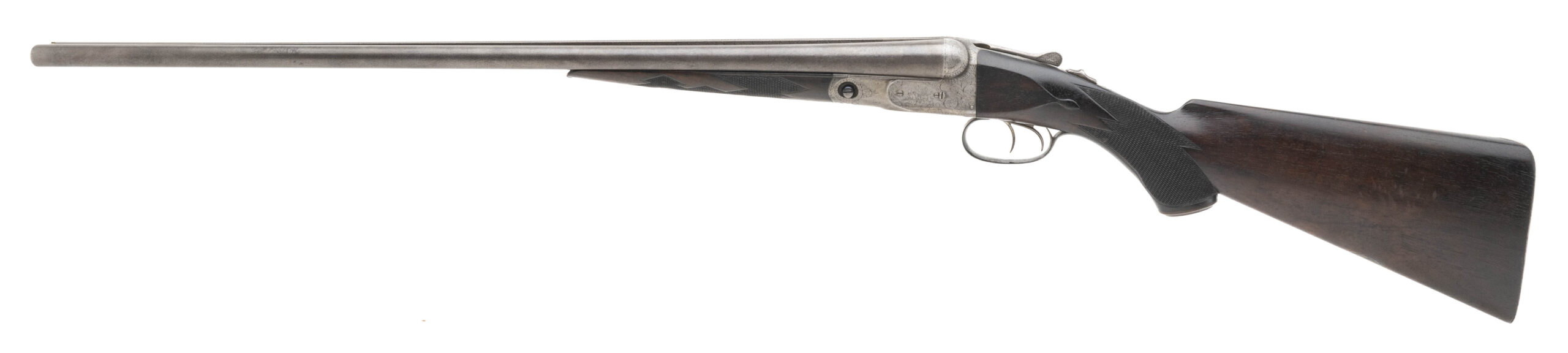 SN: 88266 made in 1898 in Meriden CT. 16 gauge side by side with 28” Damascus barrels with a single silver bead and 2 ½” chambers choked Cylinder and Improved Cylinder on a #1 frame. Box lock with extractors and double triggers. LOP measures 14 ¼” to the original engraved skeleton butt plate with a drop of 1 ¾” to 2 7/8”. Bores are bright with some signs that a couple small dents were removed. Barrels and action are in good condition with the pattern slightly faded but fully visible throughout the barrels and some of the original case color visible on the finely engraved action. The wood is in very good condition for its age with just some minor handling marks and signs of wear and the stock has its original grip cap and metal stock oval. Barrels are on face with no play and the action locks up tight with the top lever resting just right of center. Overall weight is 6 lbs 12 oz.