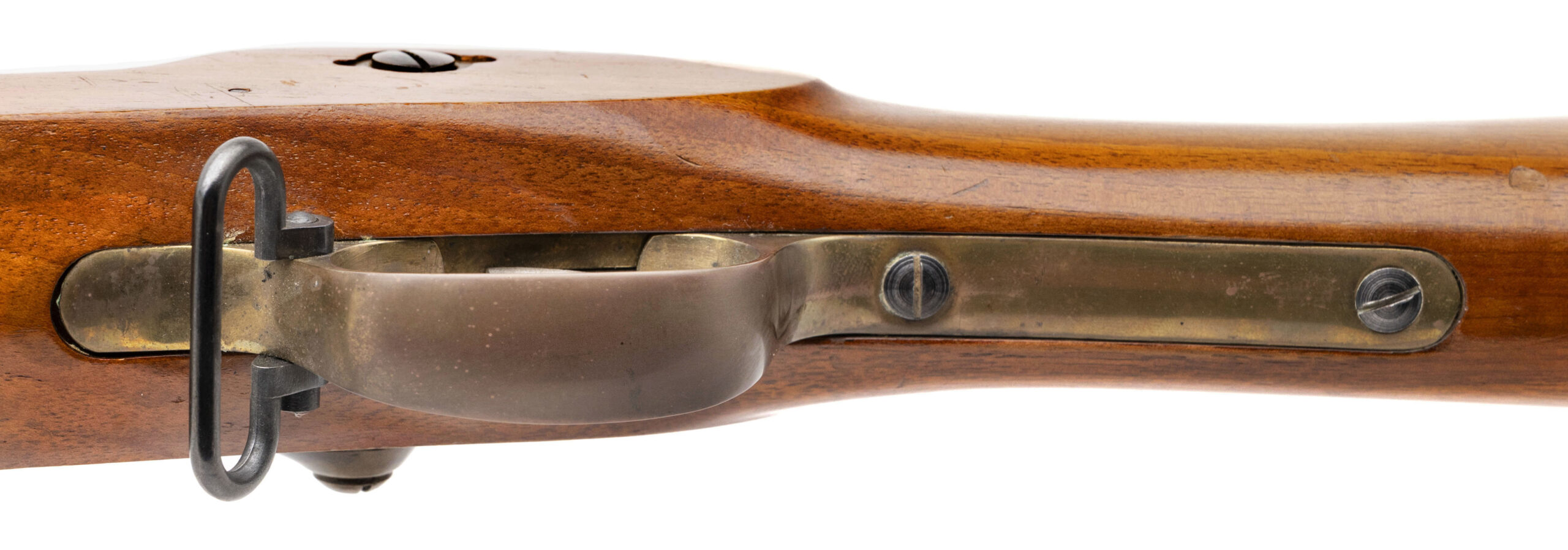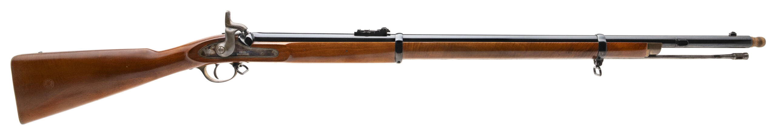 SN: 6247 made circa 1980's in Birmingham England. Modern replica of a 1858 Enfield Percussion rifle with a 32" round blued barrel with side bayonet lug and iron sights, case hardened lock plate, brass trigger guard and butt plate in a wood stock. Some light handling marks, overall in very good condition, clean bore with strong rifling.