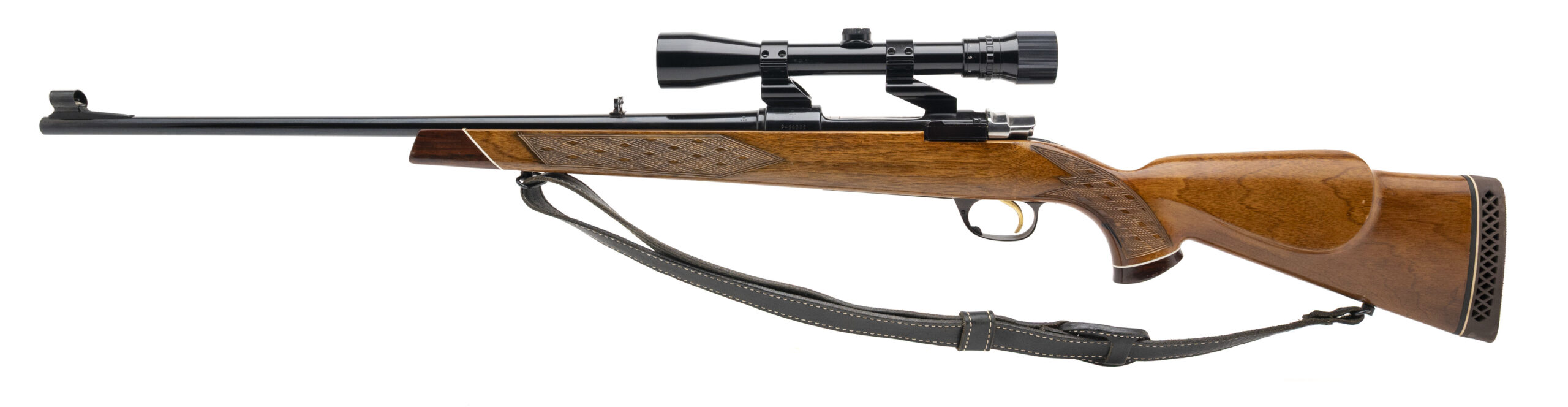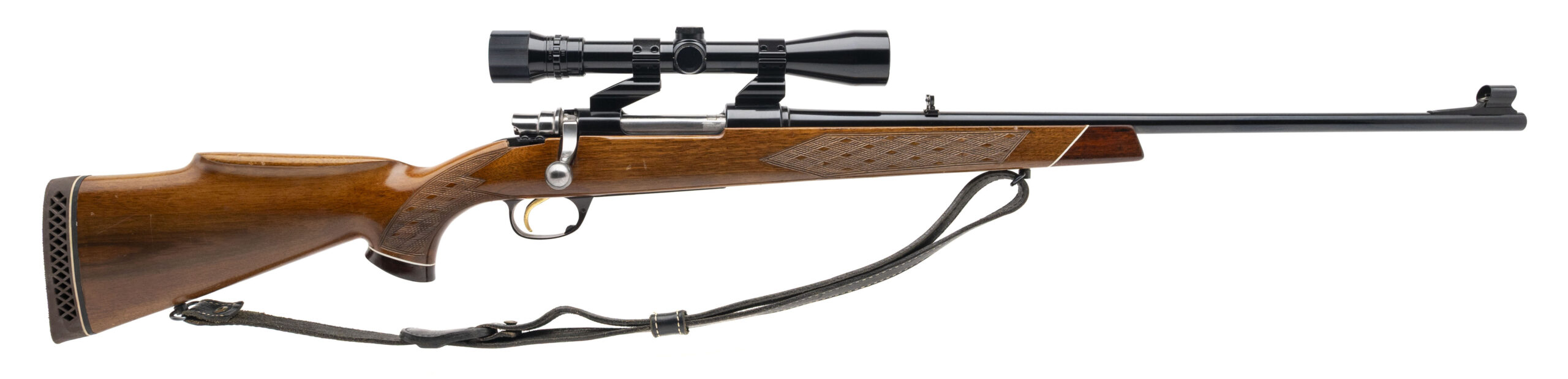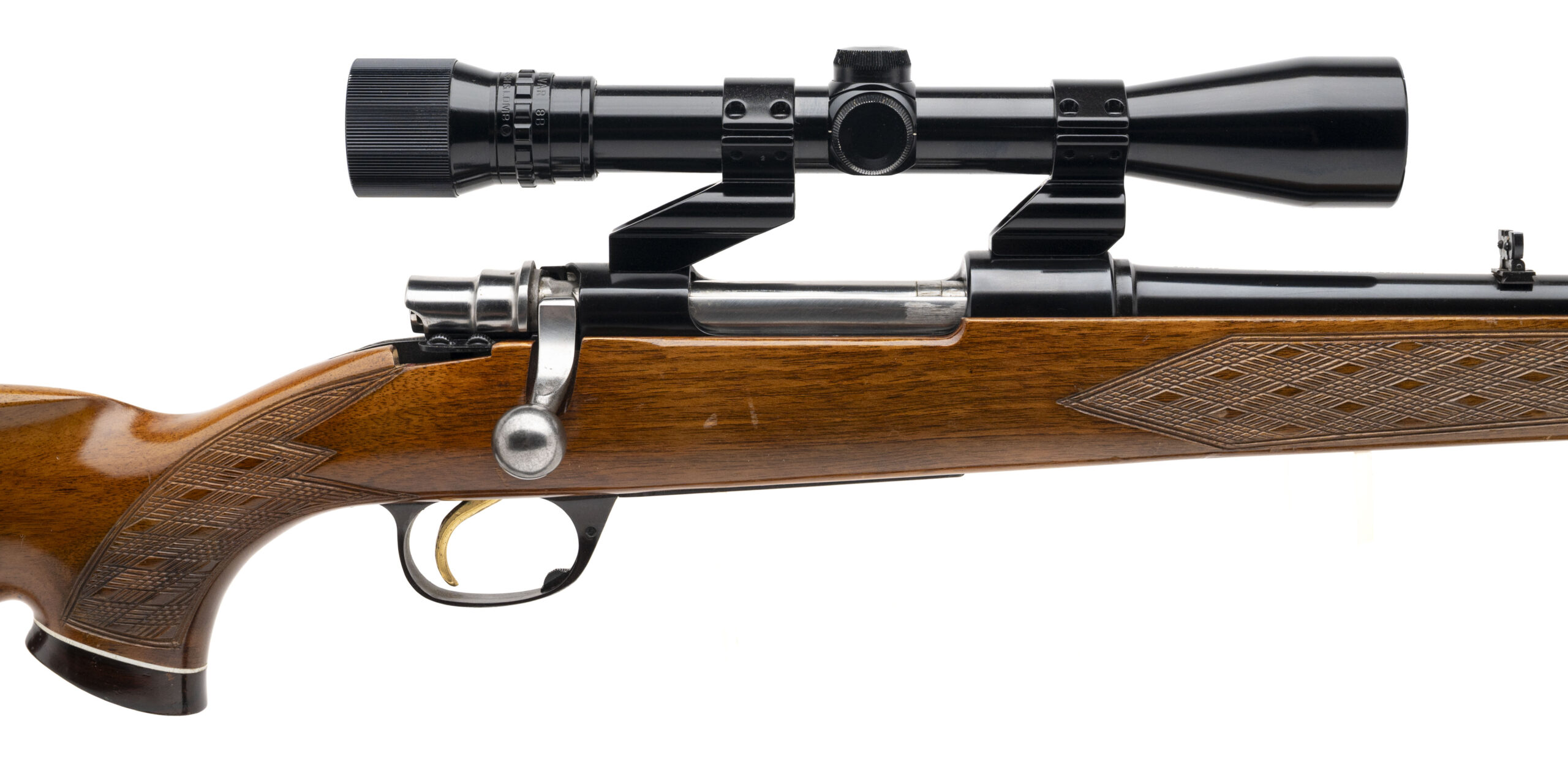 SN: P-38362 made in England circa 1970s/80s. Bolt action 30-06 hunting rifle with a 24" round barrel, ramped hooded front sight with dovetailed rear flip up sight on a Mauser action with a side safety, hinged bottom metal and Bausch & Lomb Balvar 2.5-8 scope with see through rings. Checkered walnut stock with skip line checkering, rosewood forend tip and grip cap with a Pachmayr recoil pad. Some light handling marks but overall in very good condition with an excellent bore. Comes with leather sling.