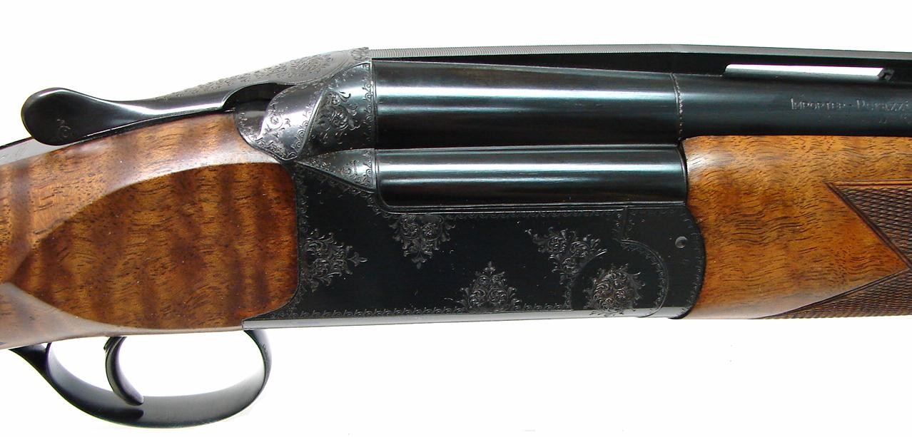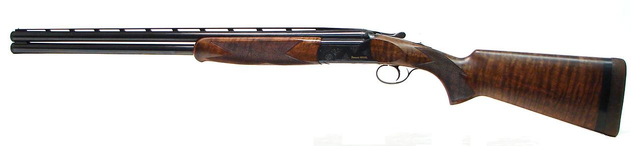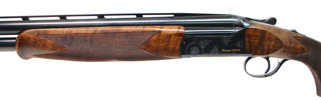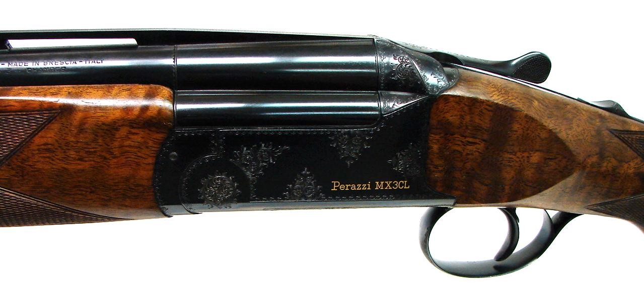 Perazzi MX3 CL 12 gauge shotgun. Beautiful over/under field gun with 27" barrels, screw choke, engraved receiver and finely figured walnut. The length of pull is 15 1/8" over an expertly installed leather pad and spacers. Great for a big man. Excellent condition overall with chokes, tools and custom leather carrying case.