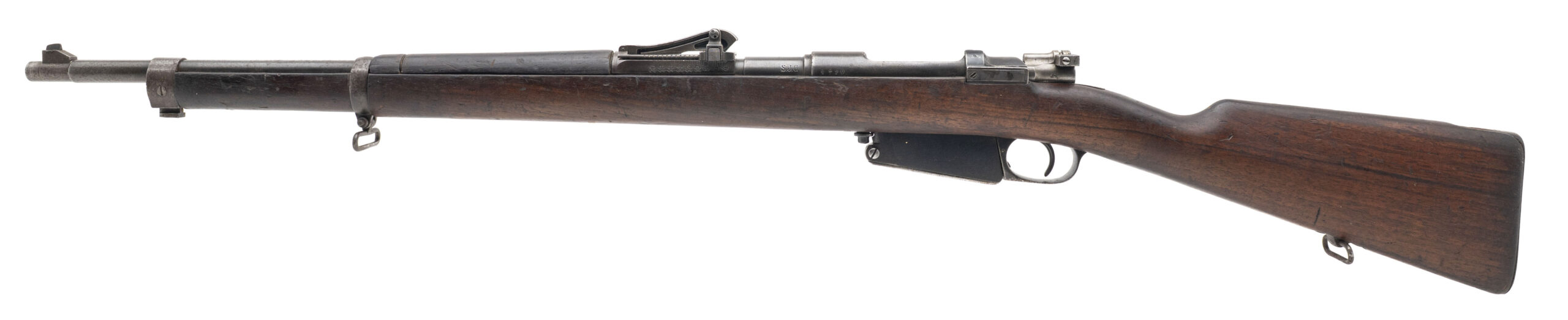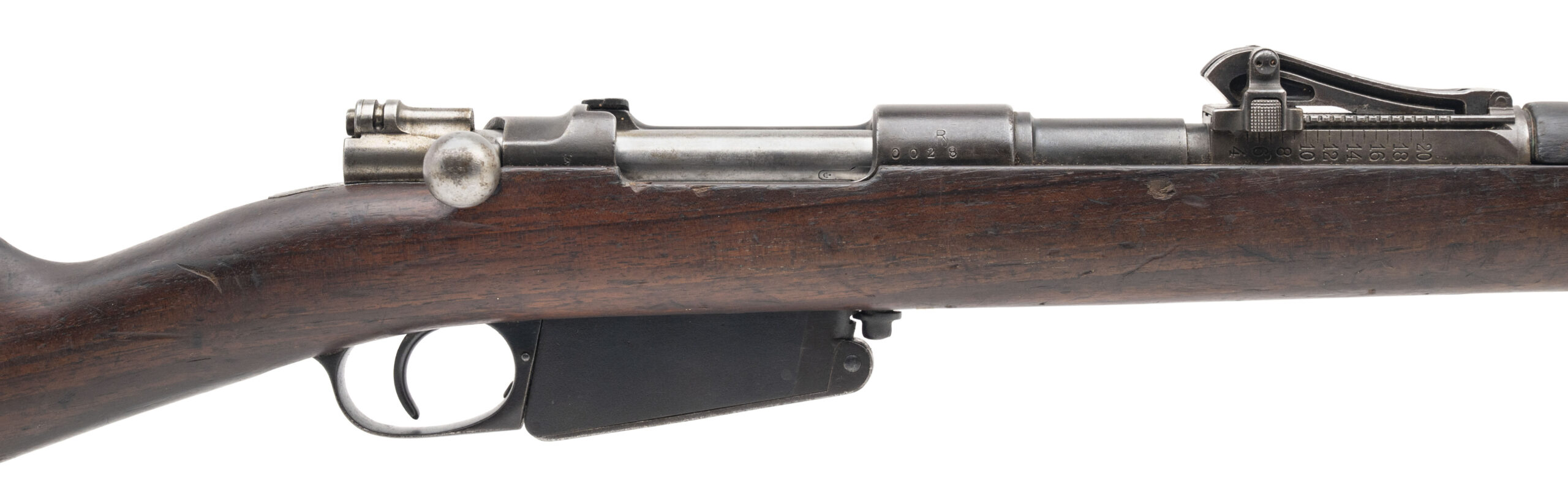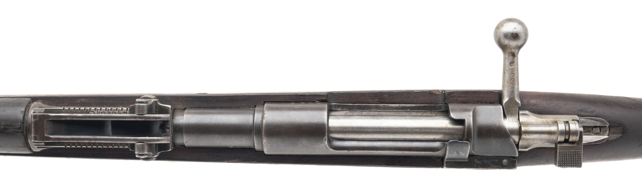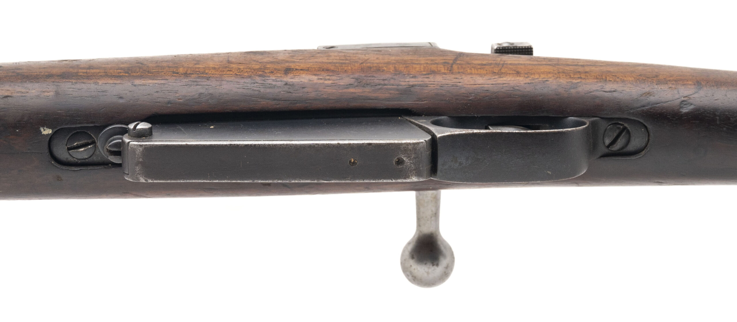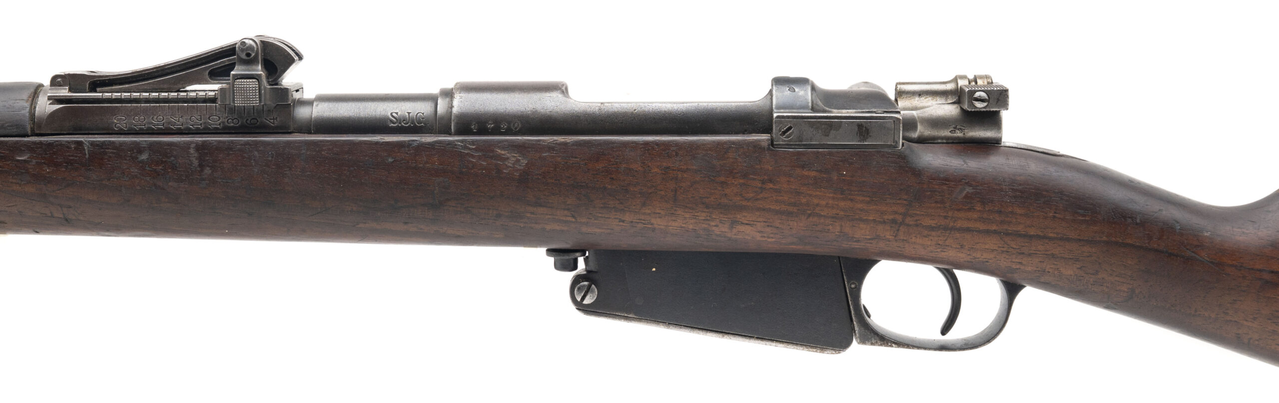 Serial No. 1720, rebuilt circa 1912, 23.5” round barrel. Originally produced as part of the Argentine M1891 Mauser contract, this rifle was later sold to Peru, where it was arsenal-converted into a carbine configuration in 1912. These converted carbines are sometimes referred to as “1912 Rebuilds”, part of Peru’s effort to modernize its arms while reusing existing stockpiles. The barrel is marked “S.J.G.” indicating it’s a new Swiss barrel. Bolt is non matching, typical for these refitted rifles. Metal finish has thinned to a light grey patina, with light surface oxidation noted throughout. The stock is solid but shows the expected field wear, including nicks, dings, and scratches from decades of service use. The action is smooth and functions correctly,