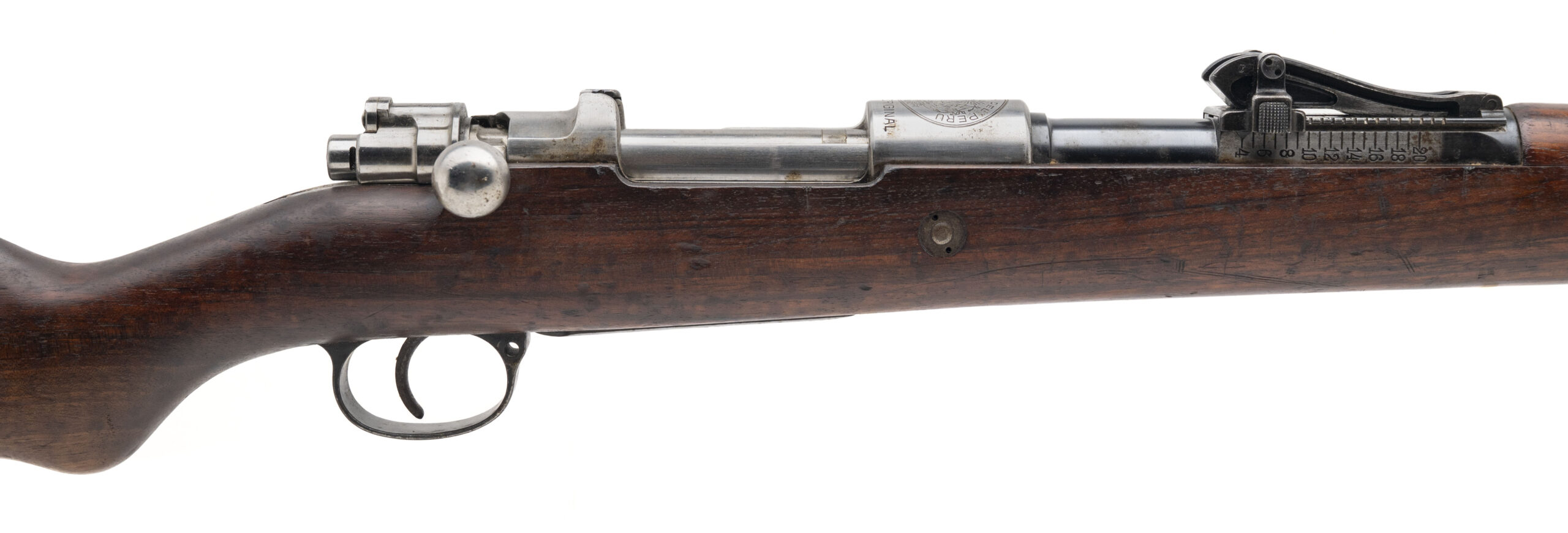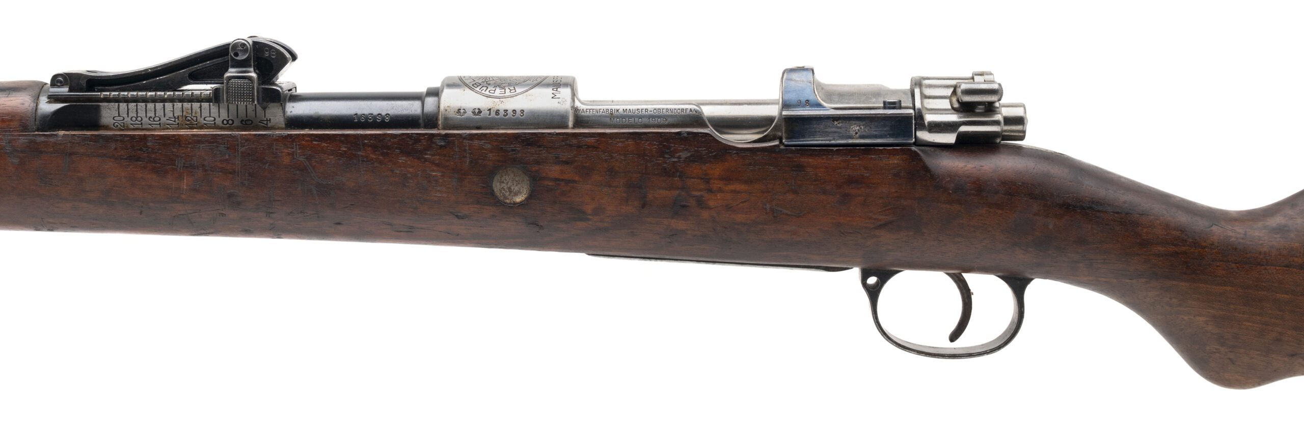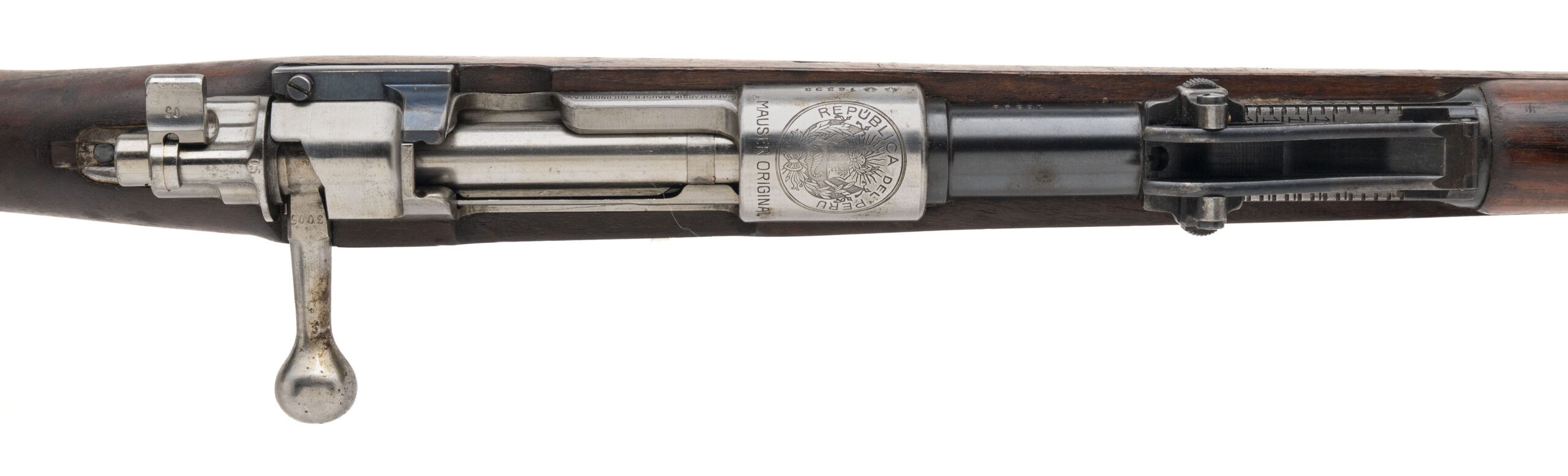 Serial No. 16398, manufactured circa 1910–1914, 7.65x53mm, 28.5” round barrel. This Peruvian M1909 Mauser is a licensed copy of the German Gewehr 98, produced by Mauser Oberndorf specifically for the Peruvian military. The receiver is crisply marked "Republica del Peru" over the Peruvian crest, followed by "Mauser Original", a hallmark of its early contract origin. Serial numbers are matching except for the bolt. The blued finish is very good with light thinning noted. The hardwood stock shows expected light handling impressions but remains structurally sound and well-preserved with a handsome Mauser cartouche visible. The action is smooth and functions correctly. This is a fine representative of South American Mauser exports of early 20th-century military arms.