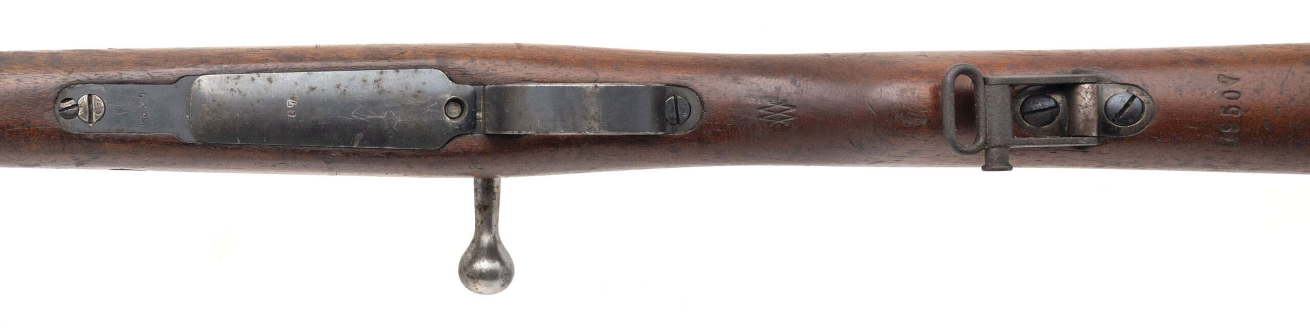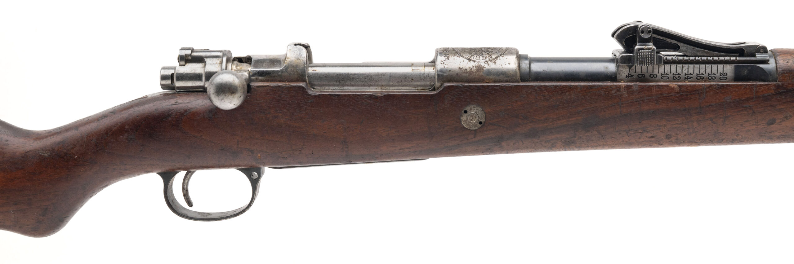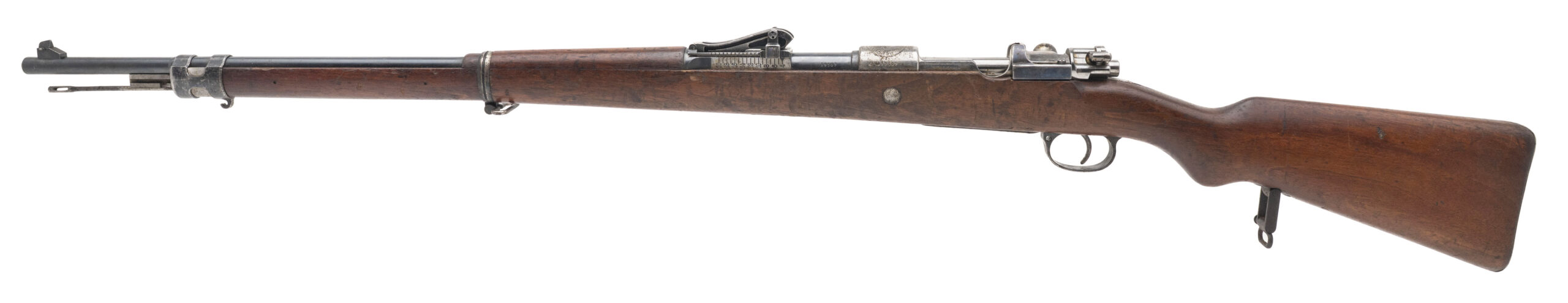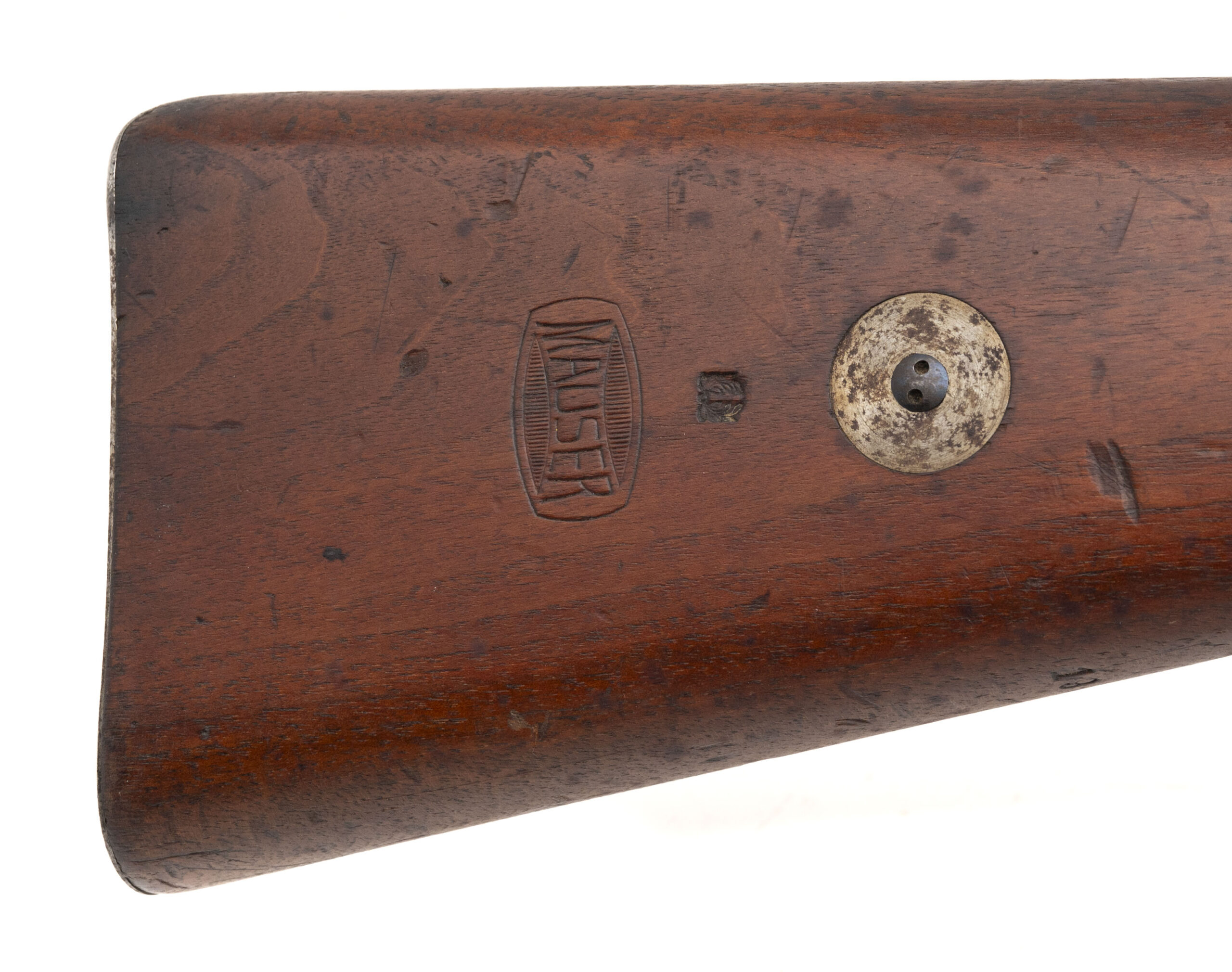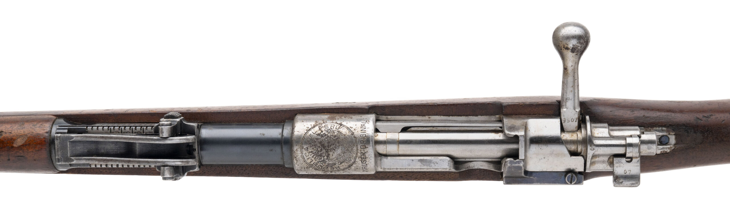 Serial No. 19507, manufactured circa 1910–1914, 7.65x53mm, 28.5” round barrel. This Peruvian M1909 Mauser is a licensed copy of the German Gewehr 98, produced by Mauser Oberndorf specifically for the Peruvian military. The receiver is crisply marked "Republica del Peru" over the Peruvian crest, followed by "Mauser Original", a hallmark of its early contract origin. All visible serial numbers are matching, with light surface oxidation noted on the receiver. The blued finish has aged gracefully, showing an even tone. The hardwood stock shows expected light handling impressions but remains structurally sound and well-preserved. The action is smooth and functions correctly. This is a fine representative of South American Mauser exports of early 20th-century military arms.
