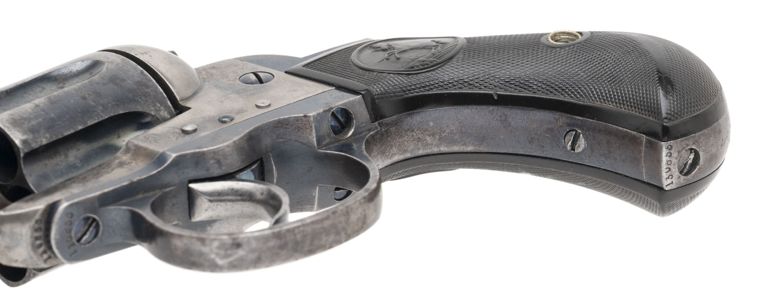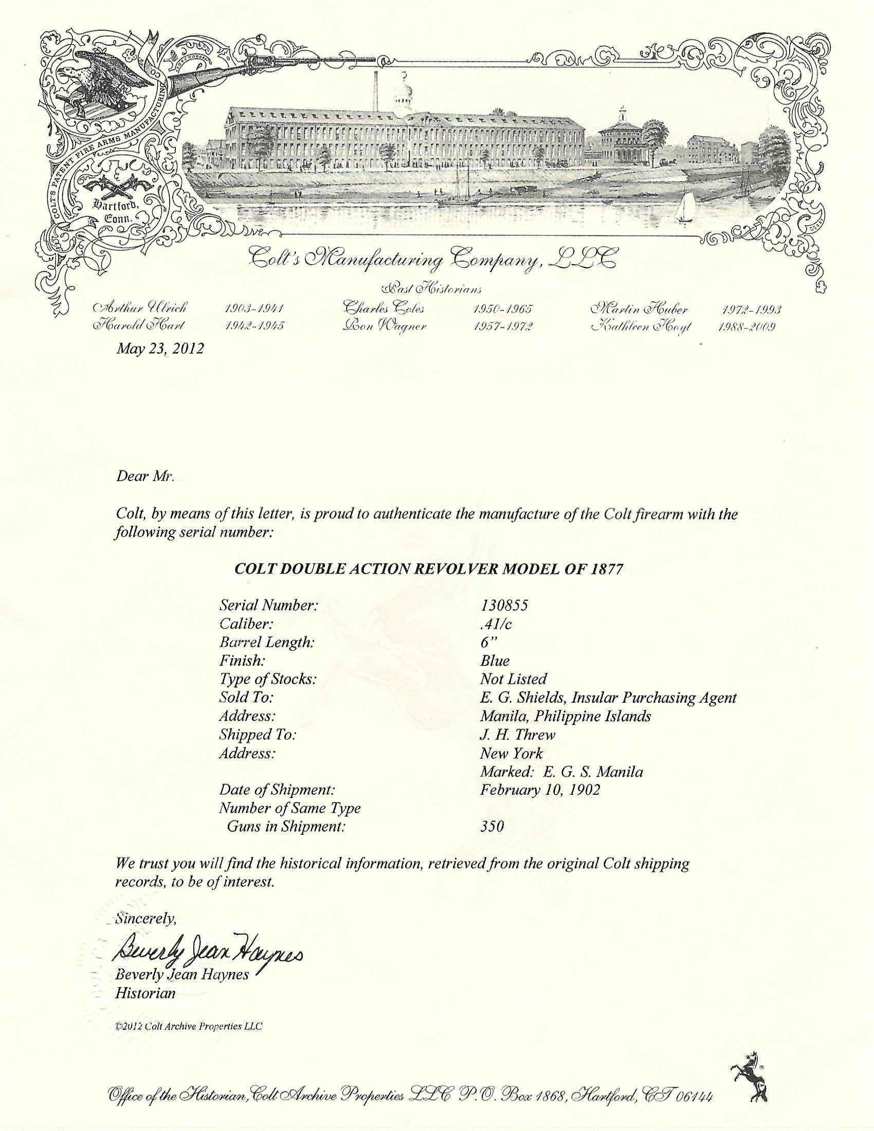 Serial number 130855. Made in 1902. 41 Colt caliber with a 6” barrel. This gun is in very fine condition with 65% of the original blue finish. The case colors rate at approximately 50% . The grips are excellent. This is a very interesting gun as it comes with a factory letter that confirms the configuration and the shipping address which is to E. G. Shields / Insular Purchasing Agent in Manila, Philippines Islands. This is one of 600 guns that was shipped to the Philippines during the transition period of the administration from the US Army to Civilian authorities. These guns remained in service for several years. Only a few of these guns are known here in the USA. This gun comes with a letter from noted Colt expert Don Wilkerson explaining this gun.