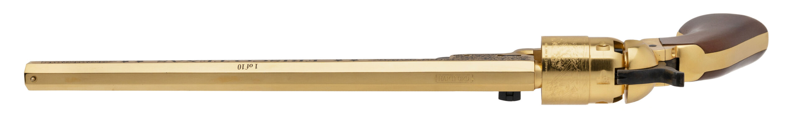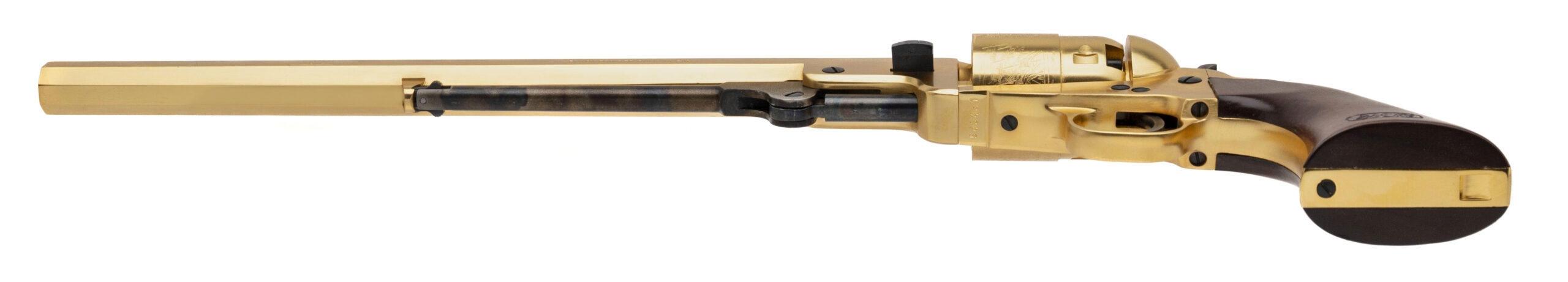 SN: 543431 modern production made in Italy by Pietta. 1851 Navy brass carbine Hartford model .44 caliber with a 12" octagon barrel, brass metal with case hardened loading rod and small parts and walnut grips. 1 of 10 made as a commemorative for Frisco Texas. Overall in excellent condition. Comes with original box. Dallas location.