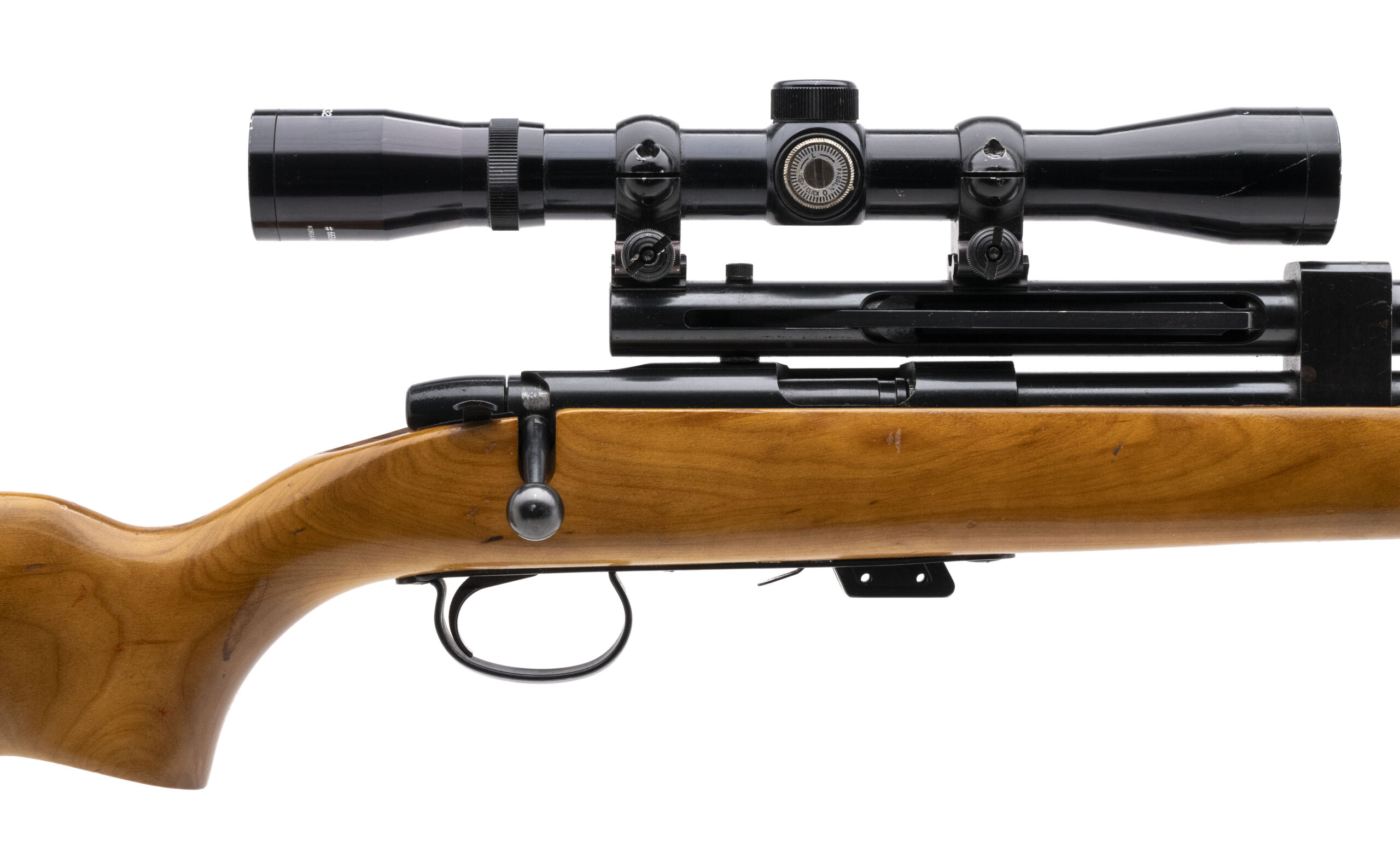 SN: A1042715. Modern production .22LR with an 22" barrel. Bore is bright with strong rifling. Bolt-Action tranquilizer rifle made on a Remington action. Uses .22 blanks to launch a .50 cal projectile. Has a Tasco 4X scope. Overall condition is very good.