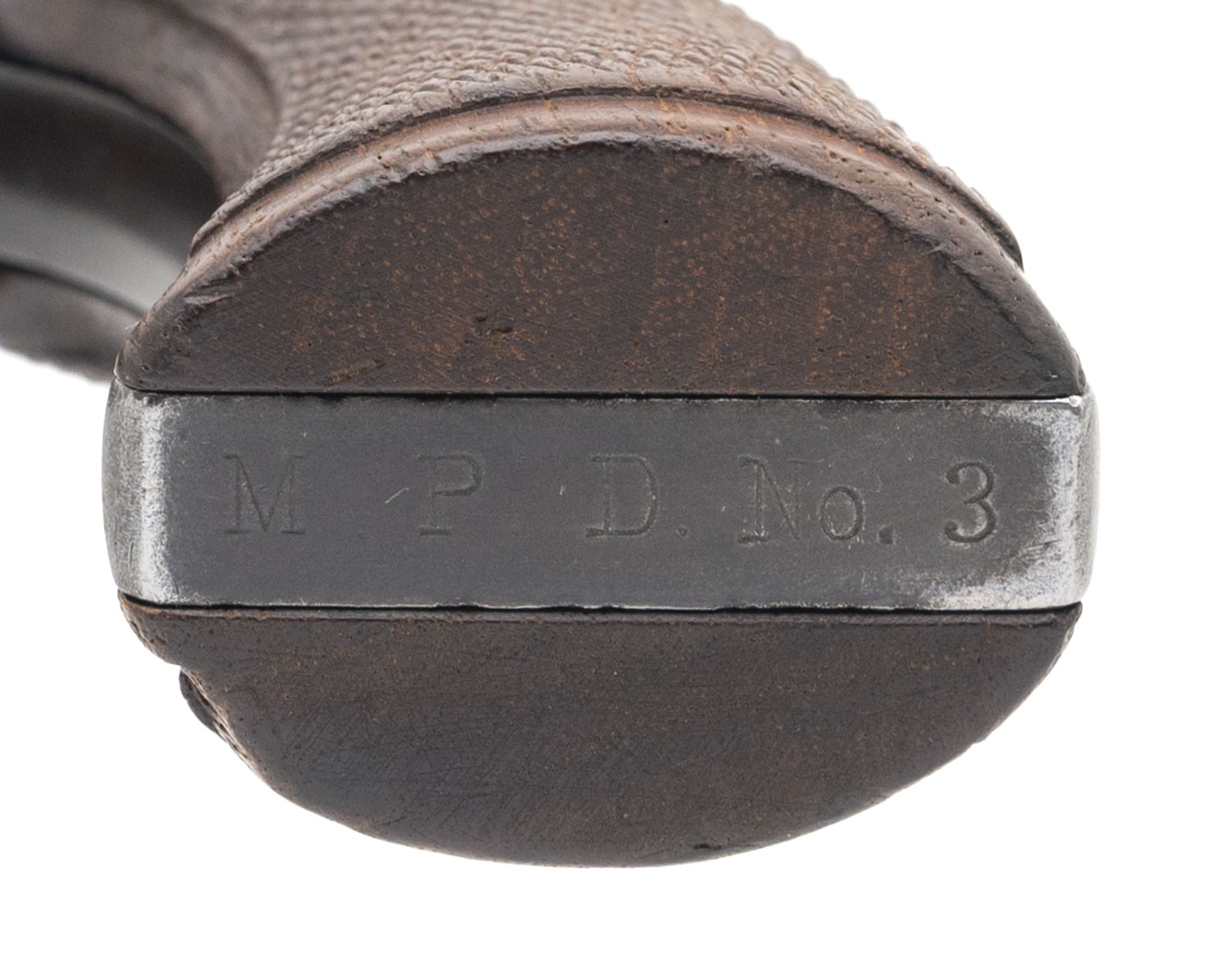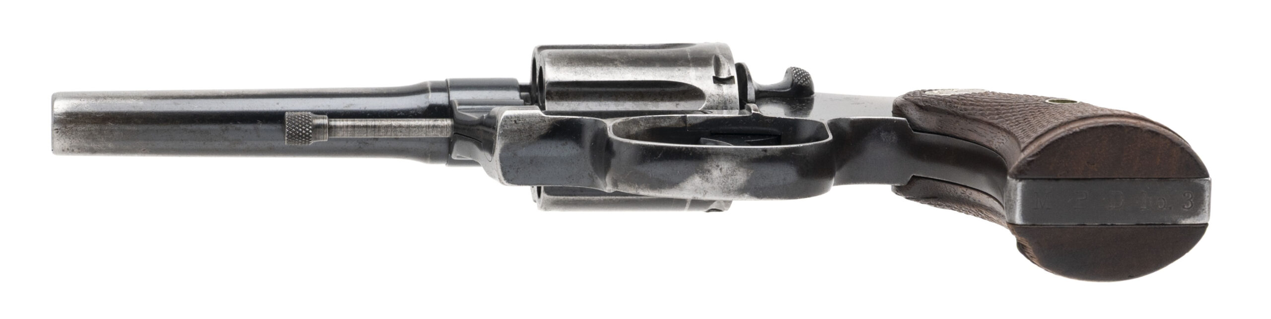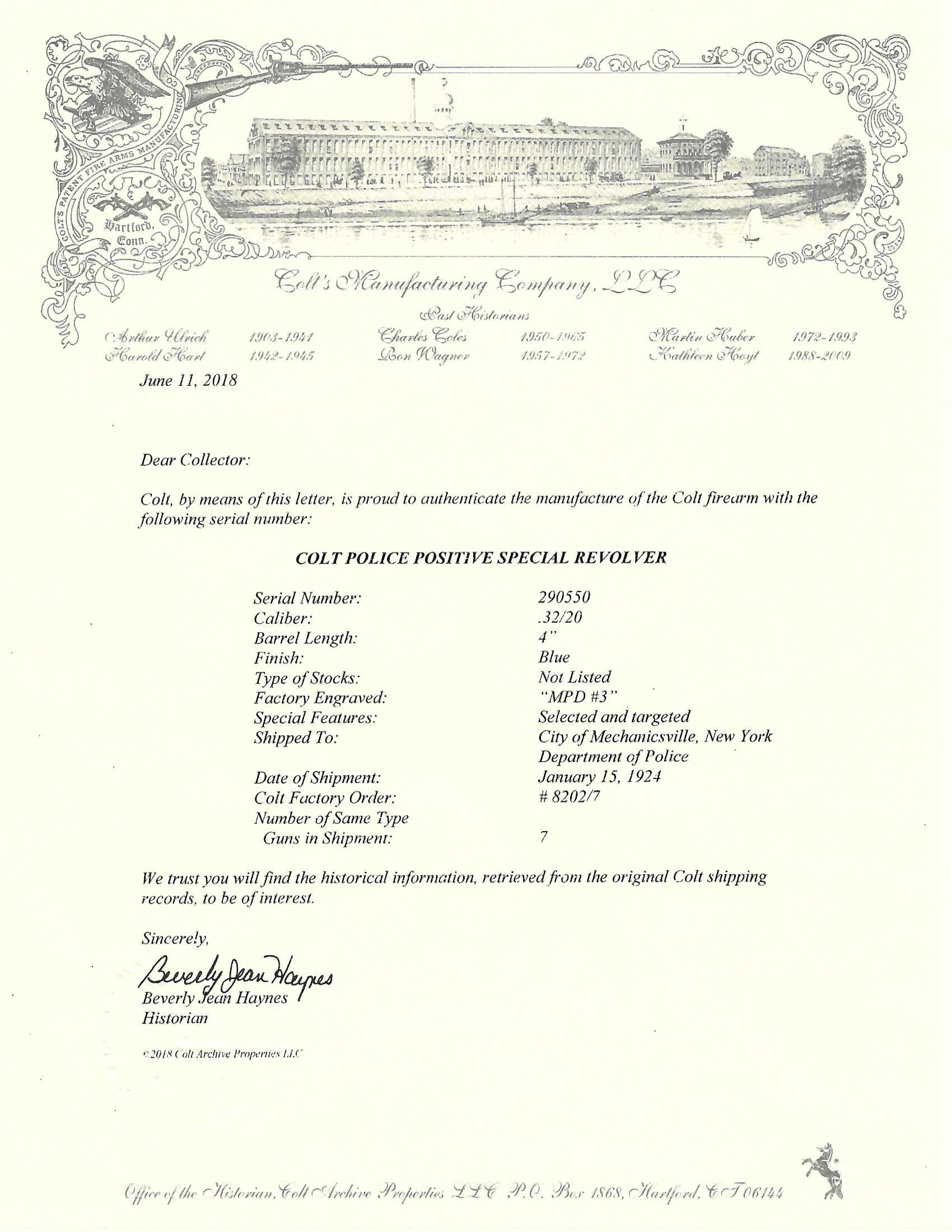 Serial number 290550. Made in 1924. 32-20 caliber with a 4” barrel. This gun has approximately 50% of the original blue. This gun show normal carry wear. The butt is marked “MPD No. 3” for Mechanicsville Police Department. Accompanying this gun is a factory letter confirming all features. This gun was sold to the Department of Police in Mechanicsville, New York.