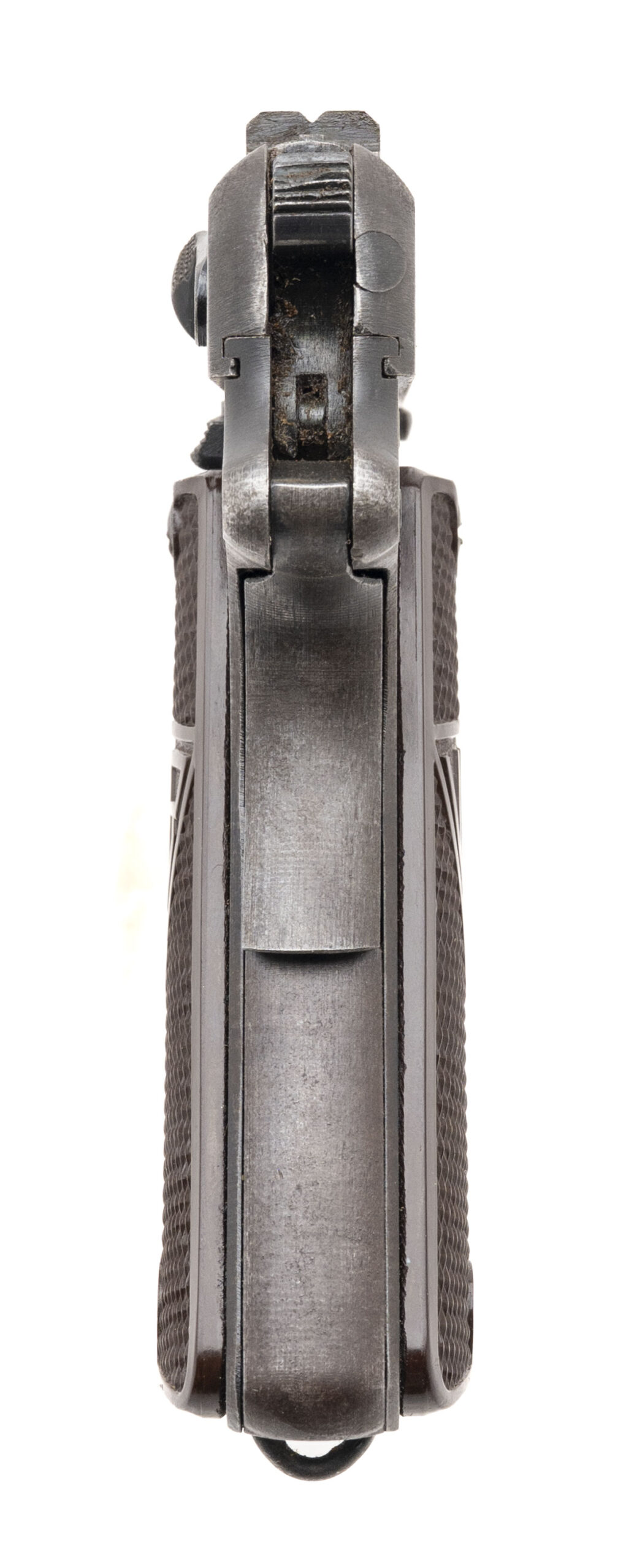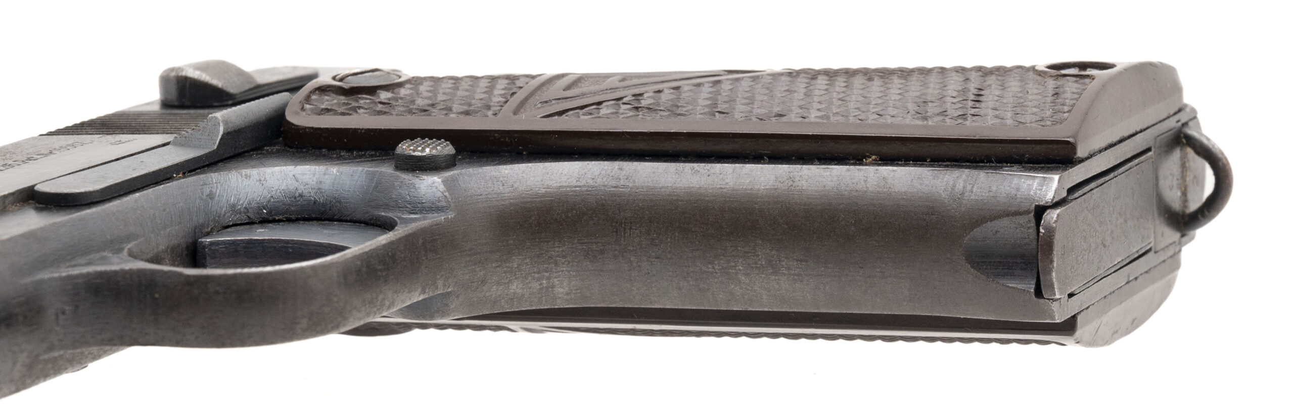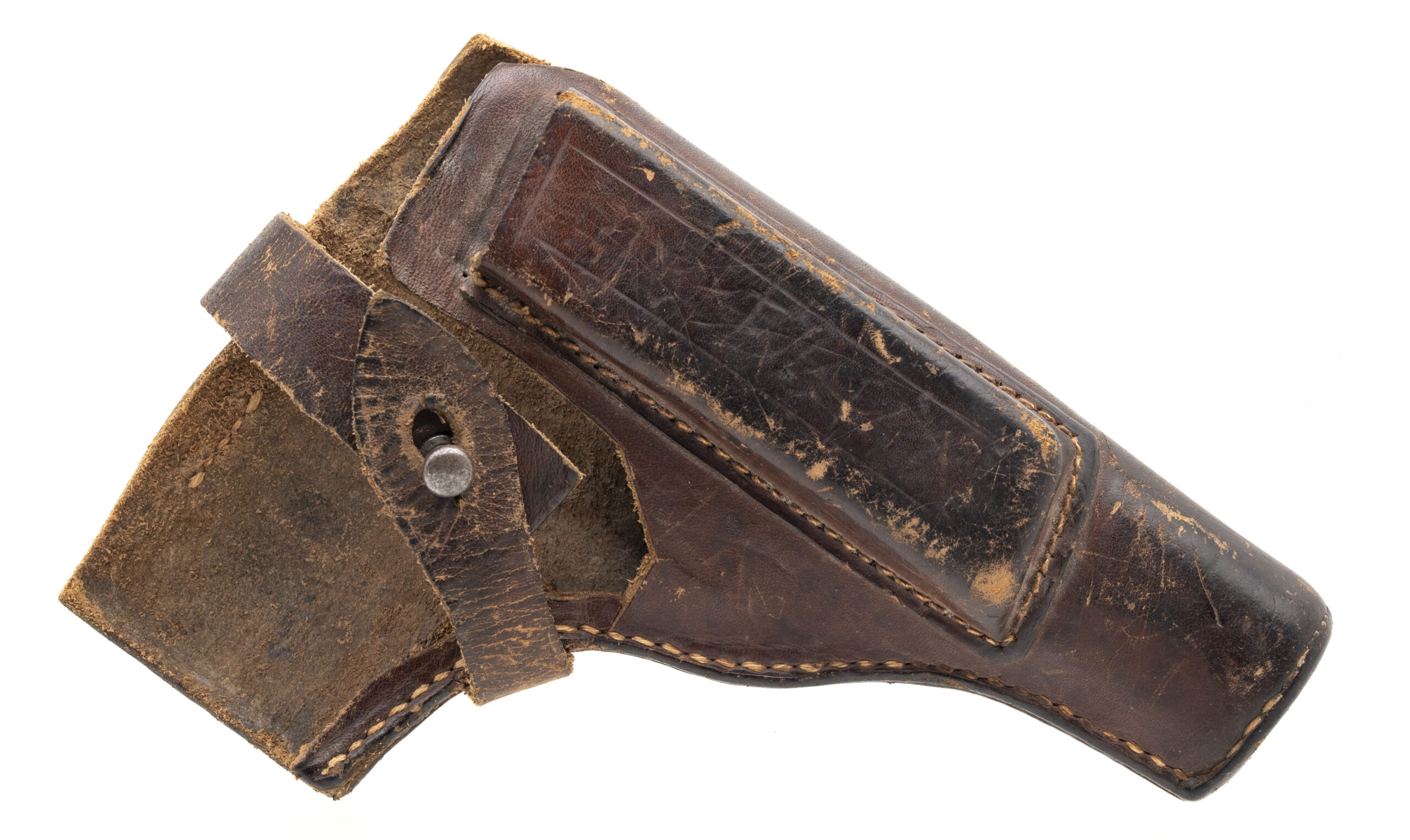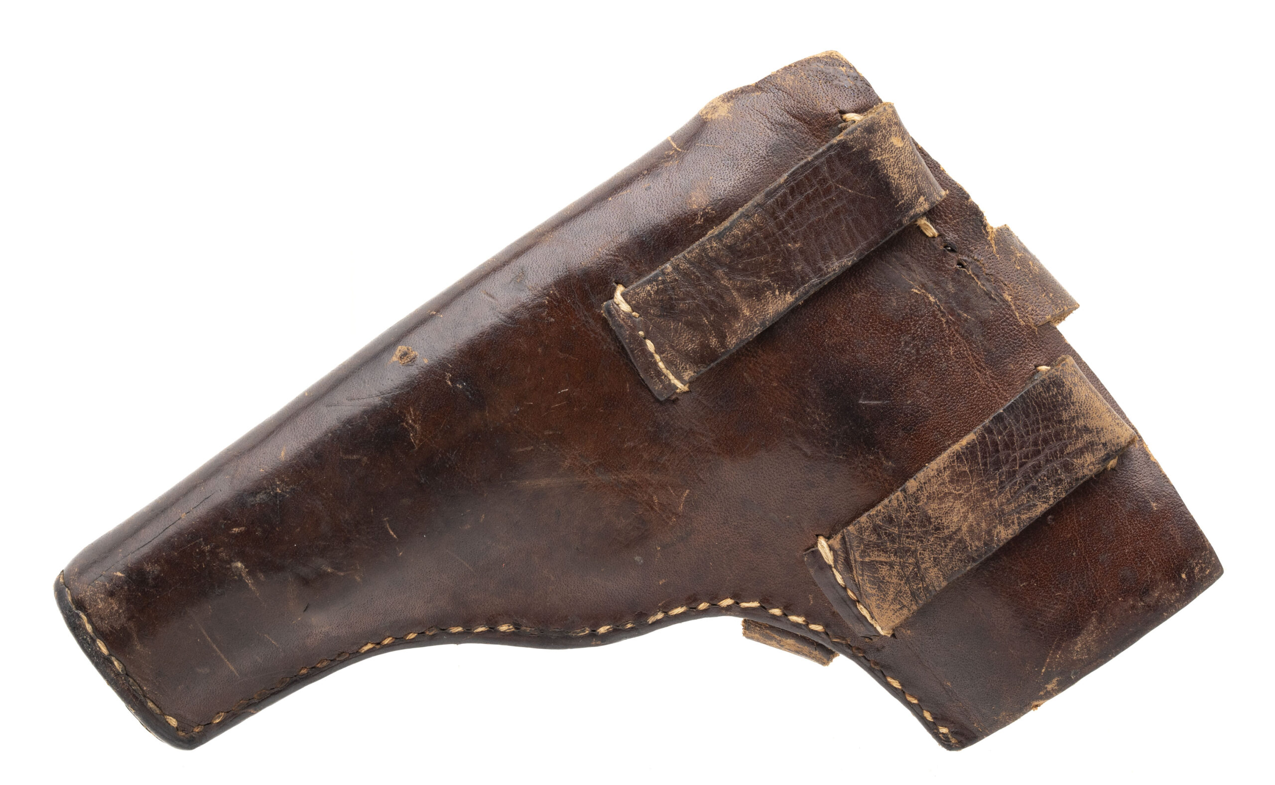 SN: E5772. Made in 1942 with a 4.7-inch barrel chambered for the 9mm Luger cartridge. This all-matching pistol was produced under German occupation as a "9mm Pistole 645(p)" & therefore has "Eagle 77" & "WaA626" military acceptance marks on the slide & frame. The condition is good overall with faded original factory finish across the metal parts as well as isolated spots of oxidation on the slide. The bore is bright & shiny with strong visible rifling. Comes with plastic "FB" grips, an 8-round magazine & an original leather flap holster that has had the flap cut off.