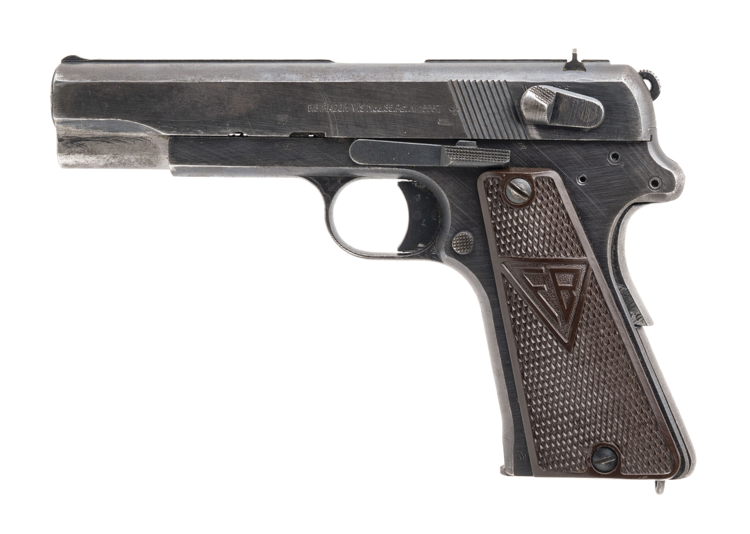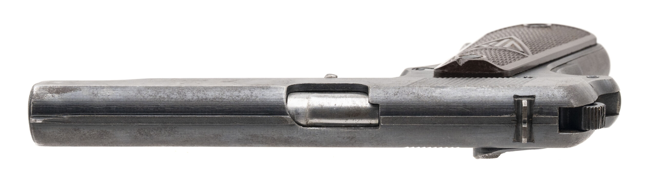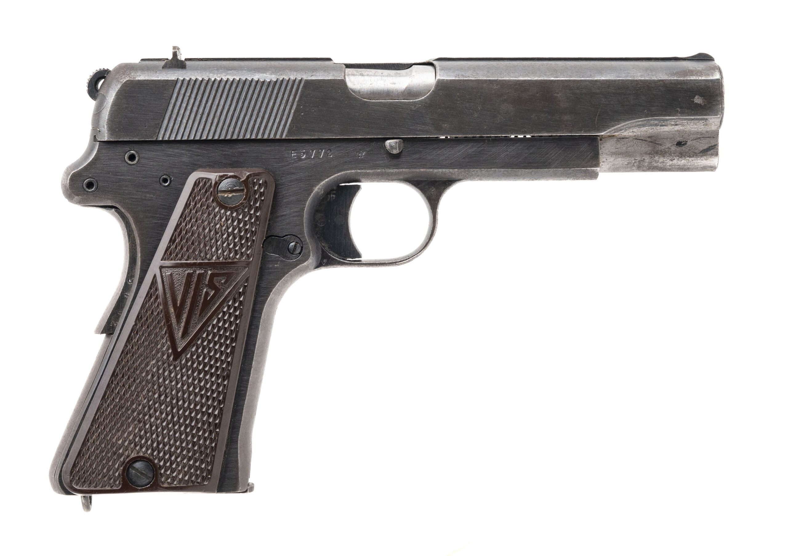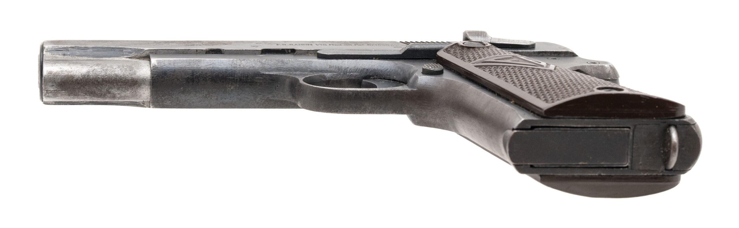 SN: E5772. Made in 1942 with a 4.7-inch barrel chambered for the 9mm Luger cartridge. This all-matching pistol was produced under German occupation as a "9mm Pistole 645(p)" & therefore has "Eagle 77" & "WaA626" military acceptance marks on the slide & frame. The condition is good overall with faded original factory finish across the metal parts as well as isolated spots of oxidation on the slide. The bore is bright & shiny with strong visible rifling. Comes with plastic "FB" grips, an 8-round magazine & an original leather flap holster that has had the flap cut off.