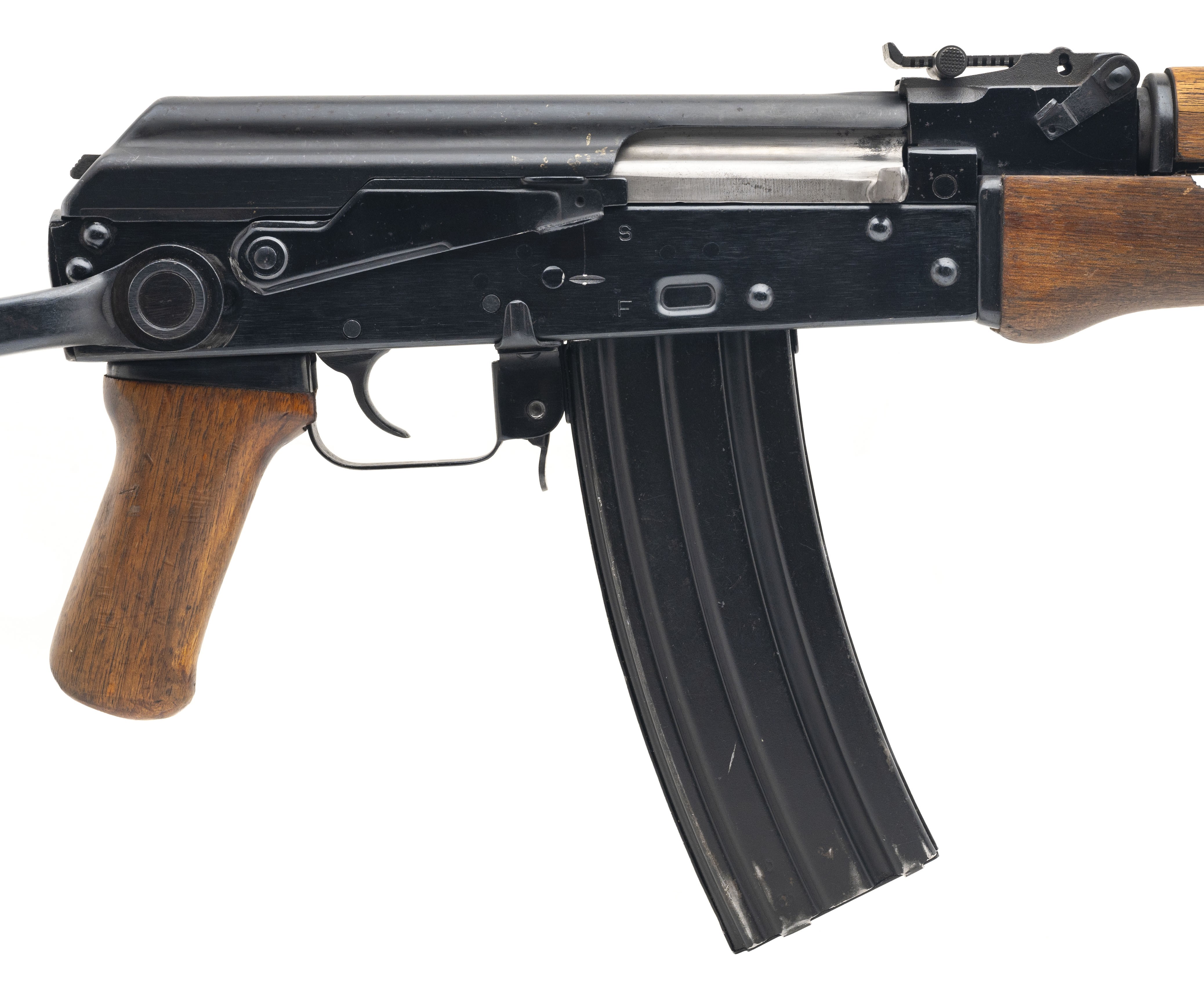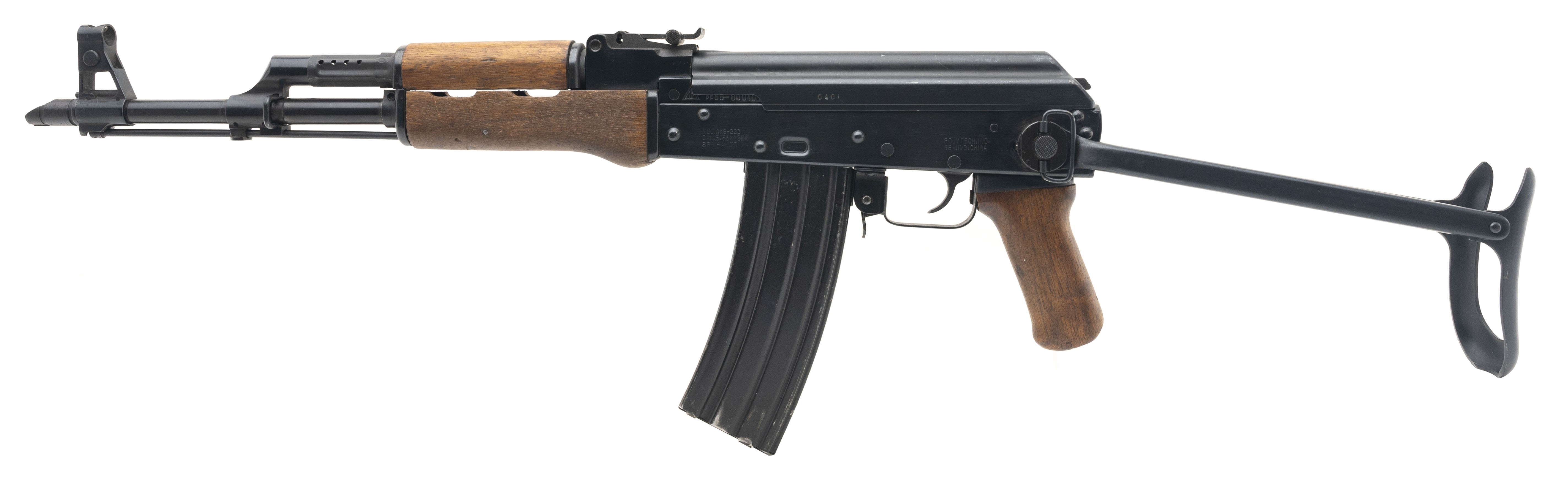 SN: PF85-000401. Made in 1985 with a 16" chrome-lined barrel chambered for the .223 cartridge. This desirable pre-ban stamped receiver import commercial Kalashnikov is numbers matching & in very good condition with a bright bore, original factory polished blue finish, wood furniture & underfolder stock. Comes with a 16-inch cleaning rod & an original 30-round magazine.