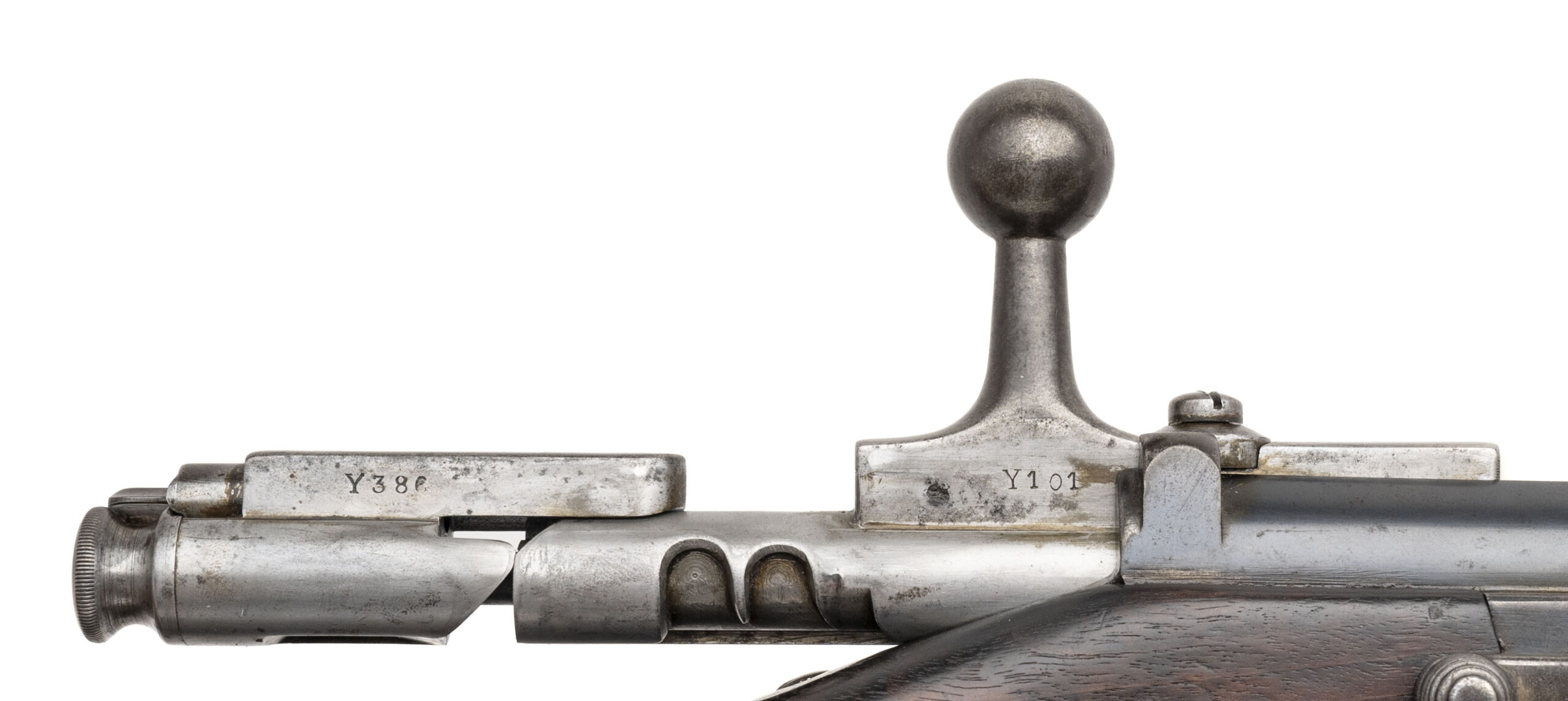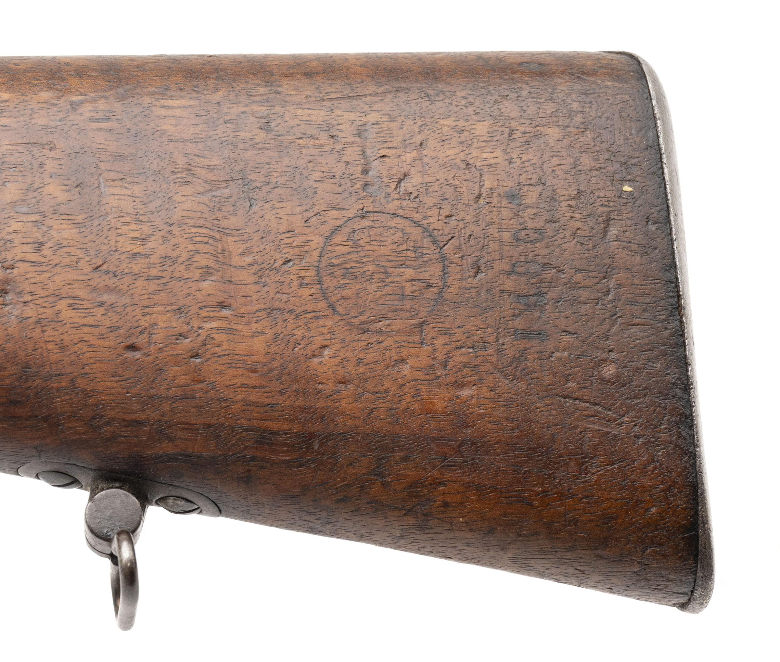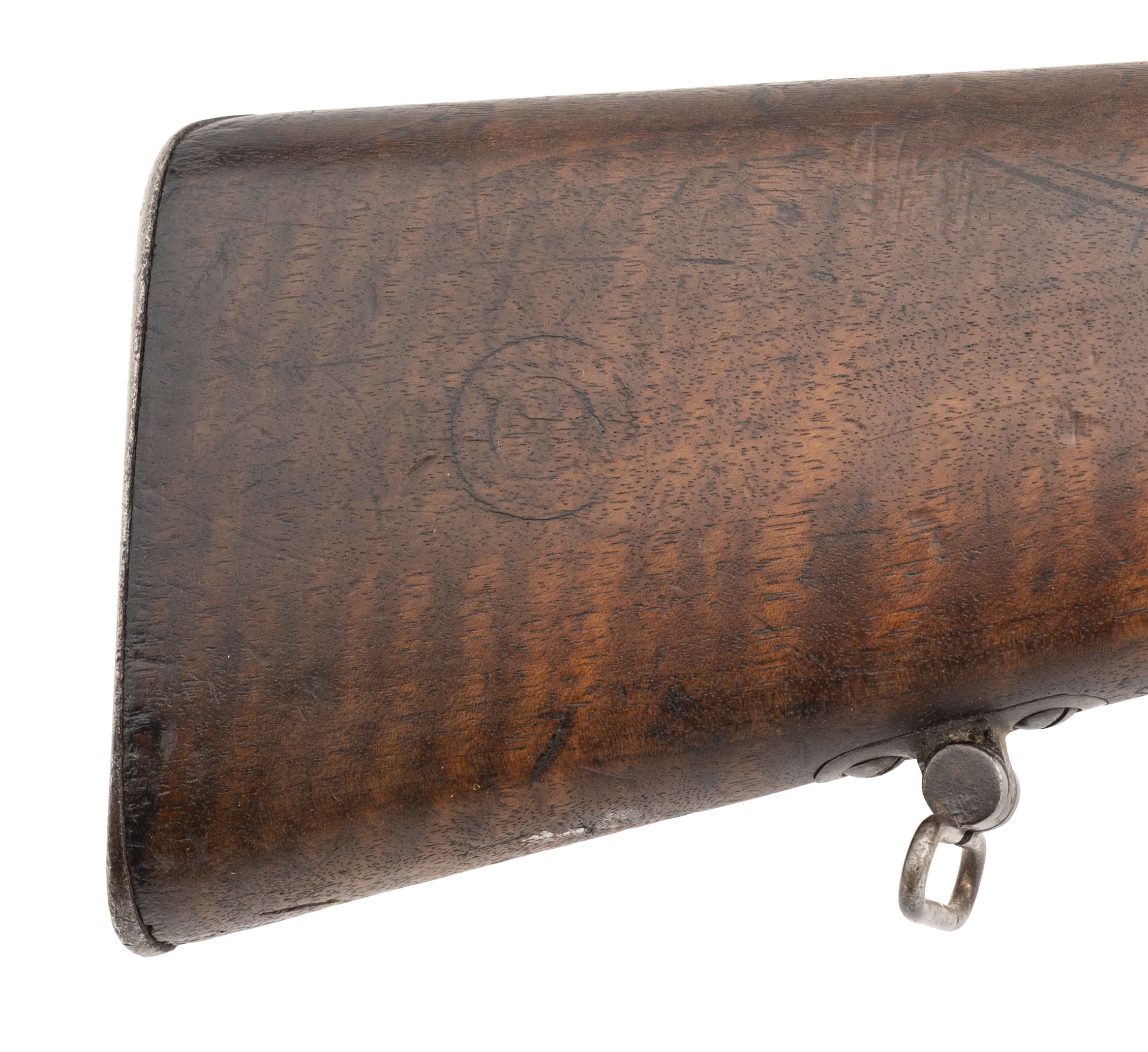 Serial No. pp973, manufactured 1886, 8x60mmR, 32¾” round barrel. Serial numbers on the bolt are non-matching to the receiver. Metal shows an even brown/grey patina, with the receiver’s original blue beginning to thin to grey in places. Stock is in very good condition with light handling marks and a sharp cartouche visible. Action is smooth and functions correctly. A well-preserved example of the Kropatchek pattern Portuguese service rifle, notable for its Steyr manufacture and attractive original finish.