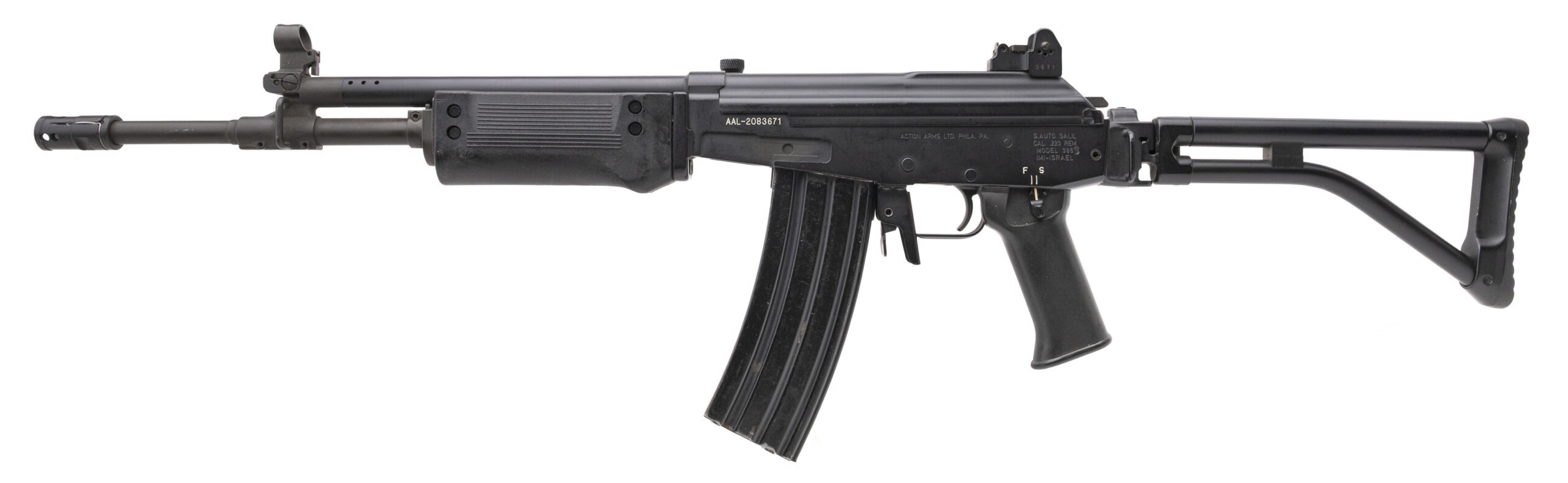 Serial number AAL-2083671. Made in August 1987 with a 16-inch 1/12-inch twist barrel that has a bright chromed bore with strong visible rifling. This pre-89 Galil is an IMI Model 386 that was imported by Action Arms, so it has no bayonet lug or bipod attachment point but it is equipped with a synthetic pistol grip & an insulated synthetic handguard. Condition overall is excellent with original factory finish across the metallic parts that shows barely any handling wear. The FAL-type side-folding stock locks up tight. An extremely nice example of one of the most popular pre-89 semi-automatic rifles. Comes with folding night sights & an unmarked 35-round magazine.