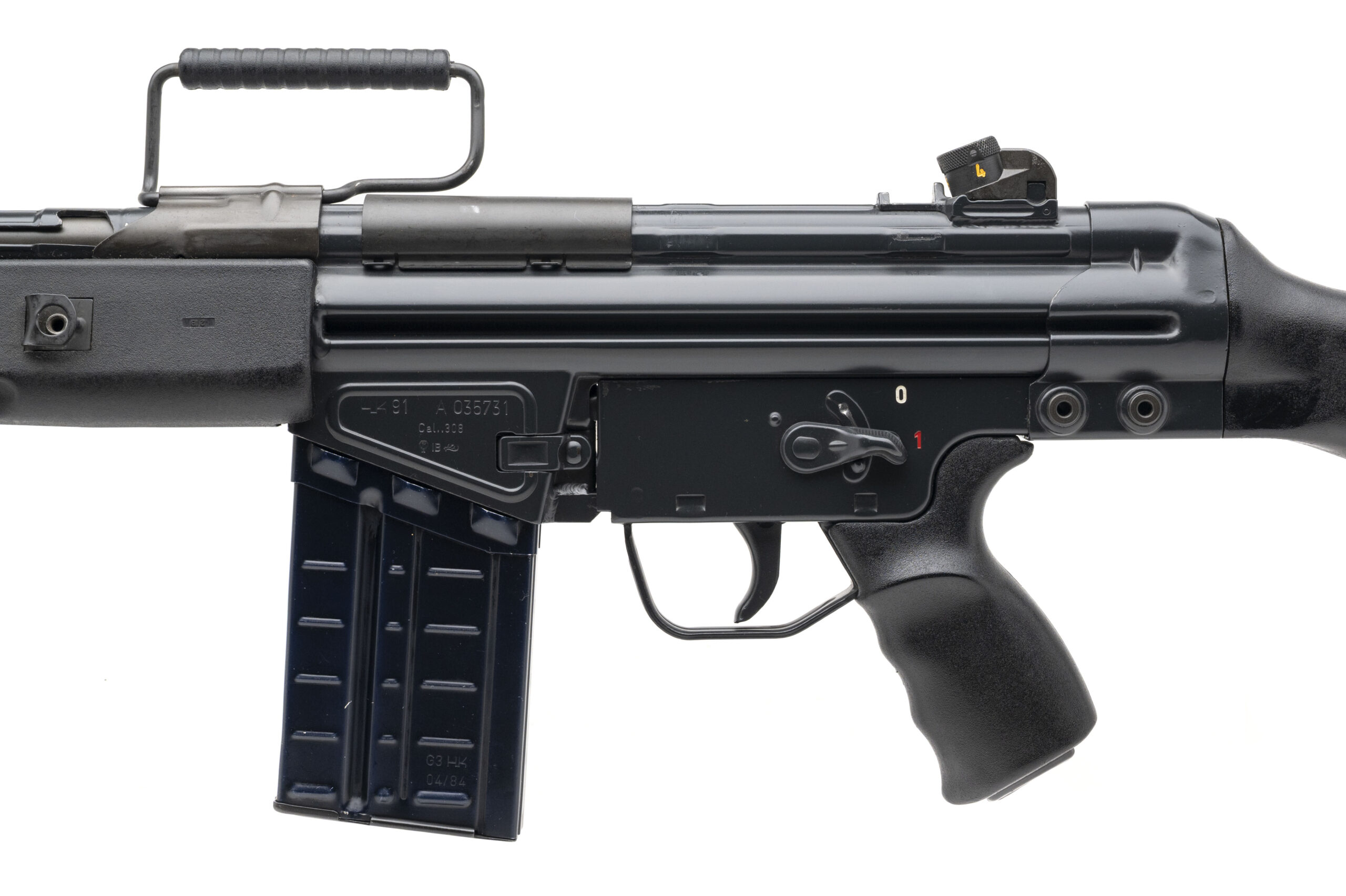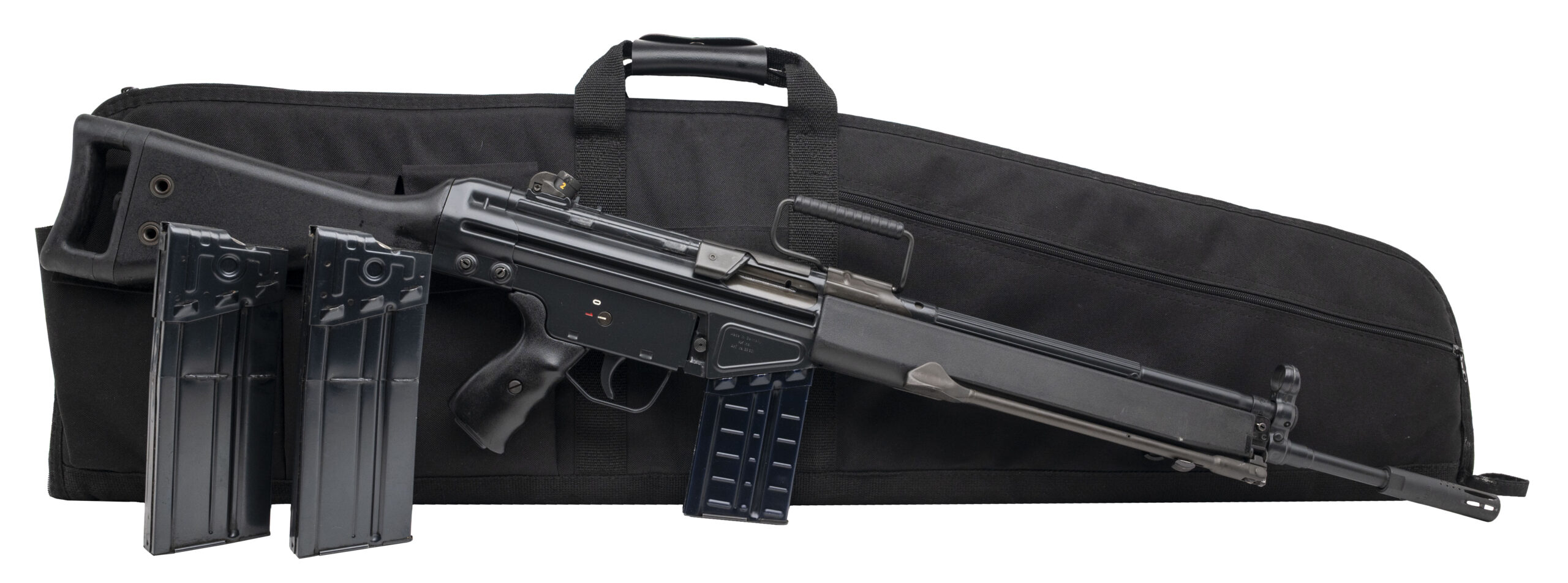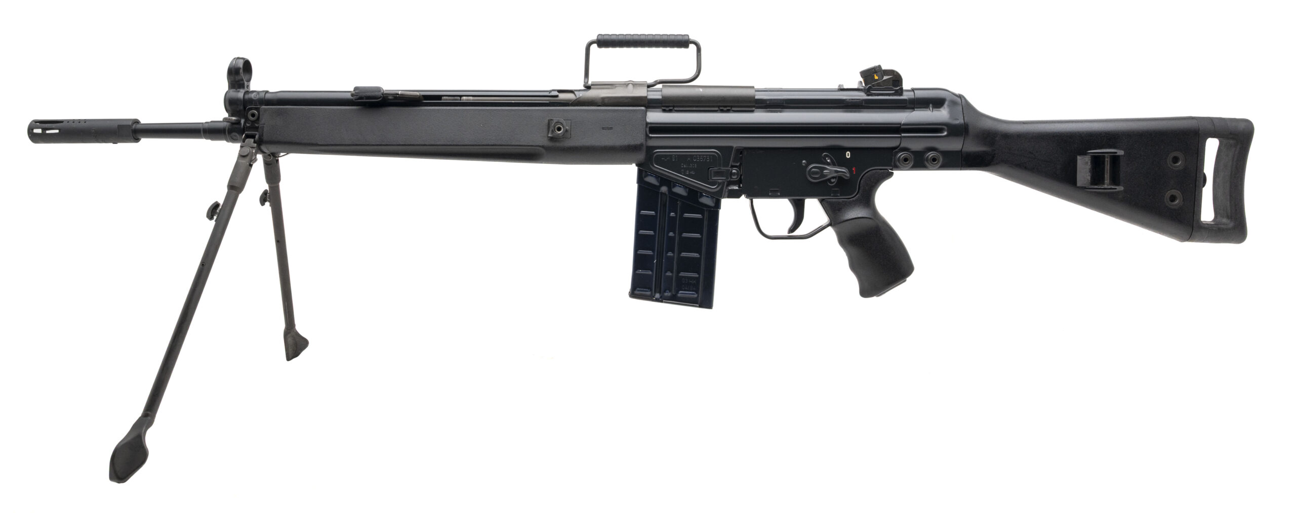 Serial number A035731. Made in 1981 with an 18-inch barrel that has a bright bore with strong visible rifling. Overall condition is excellent with original factory finish across the metallic parts & synthetic furniture that is likewise in excellent shape. Rifle is equipped with a Fabian Brothers muzzle stabilizer, a shell deflector, a carry handle, a stock extender & bipod. A fine example of the glory days of the pre-ban roller delayed blowback HK sporting rifles. Comes with an April 1984 dated 20-round aluminum G3 factory magazine & 2 unmarked HK factory steel 30-round magazines and a range bag.