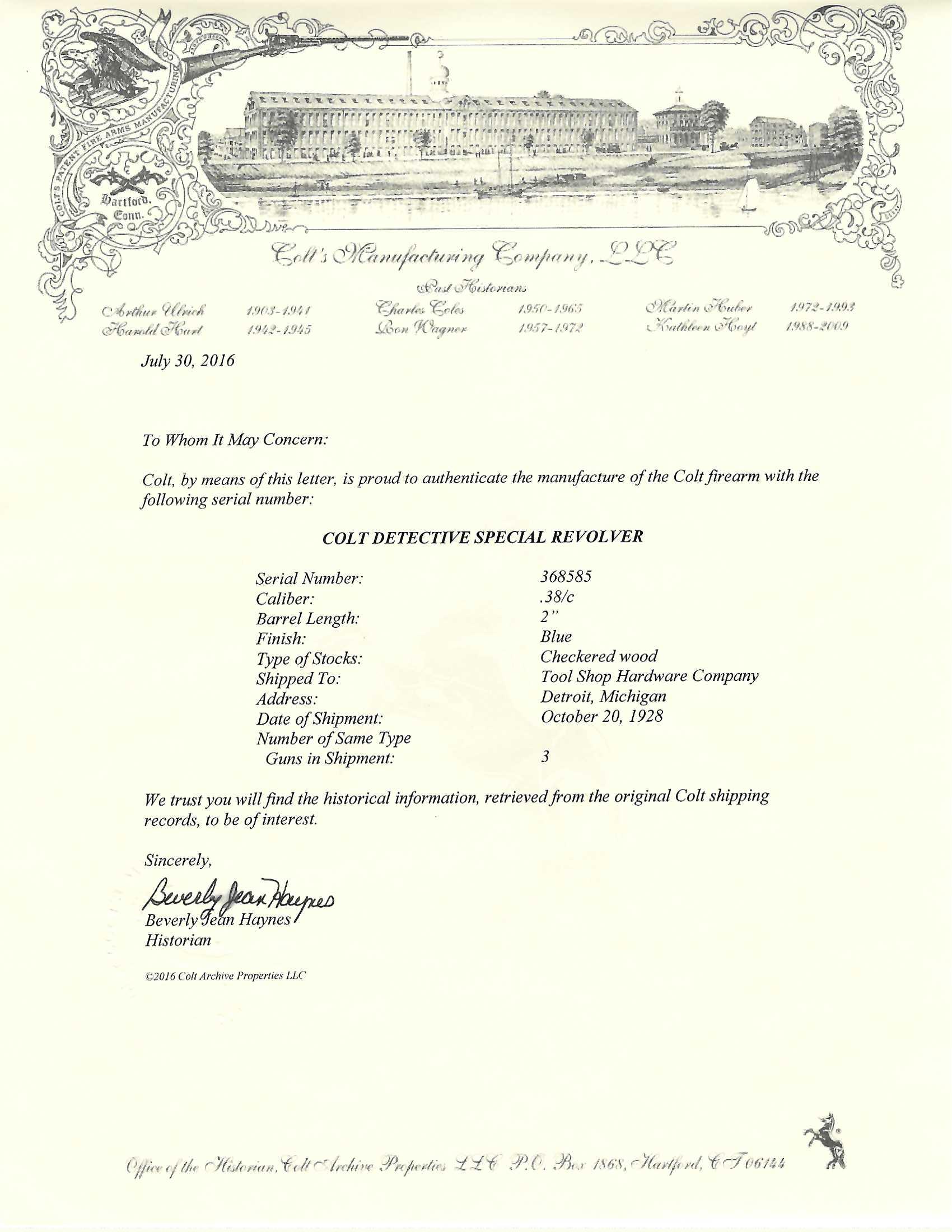 Serial number 368585. Made in 1928. 38 Special with a 2” barrel. This is a nice example of a pre-war gun that shows normal carry use. There is approximately 75% of the original blue finish/ The grips show normal handling wear. This is a very early model that was made right at the time period where they started marking what were short barrel police positives as detective specials. This gun comes with a factory letter. It was shipped on October 20, 1928 to Tool Shop Hardware company in Detroit, Michigan.