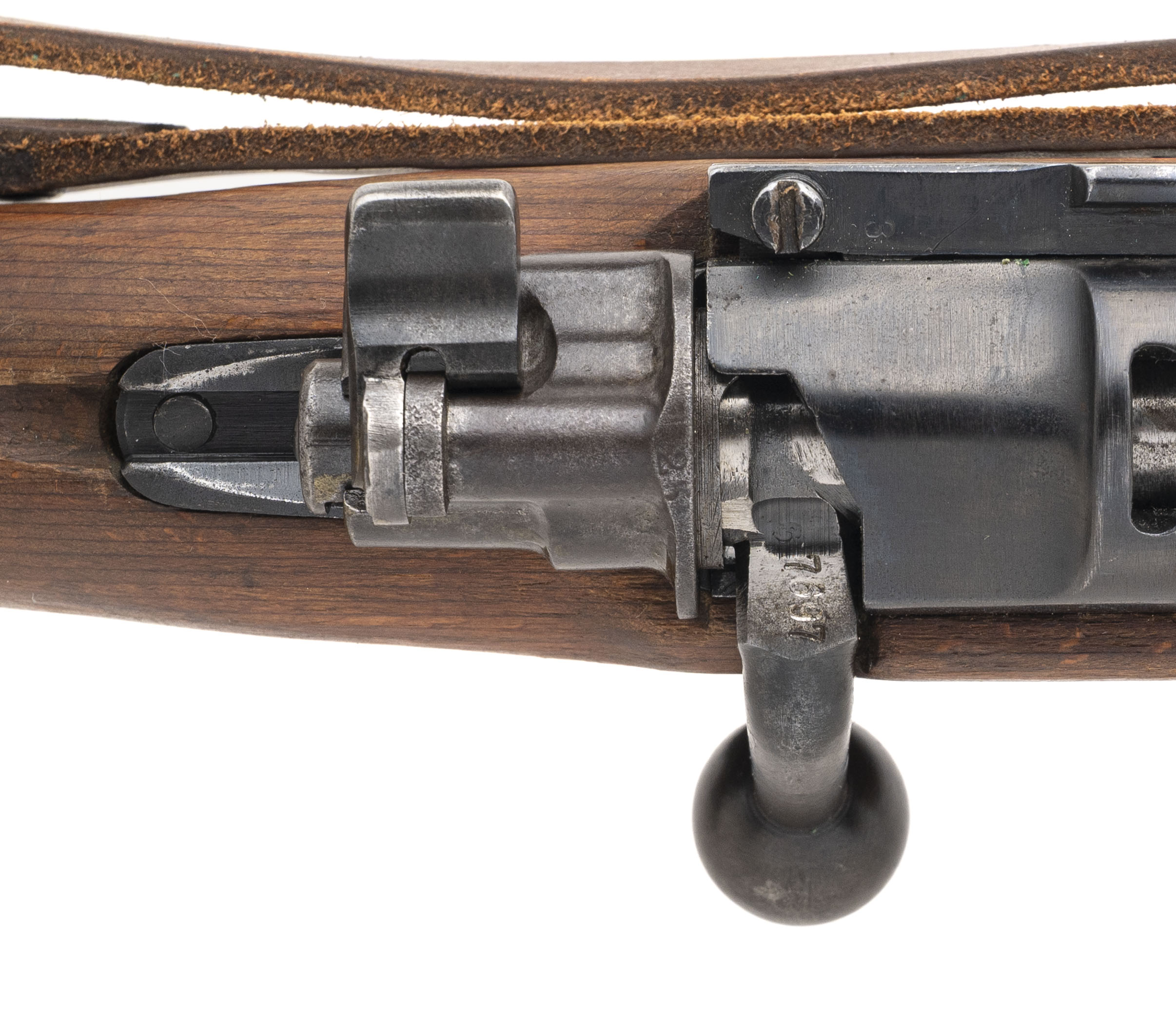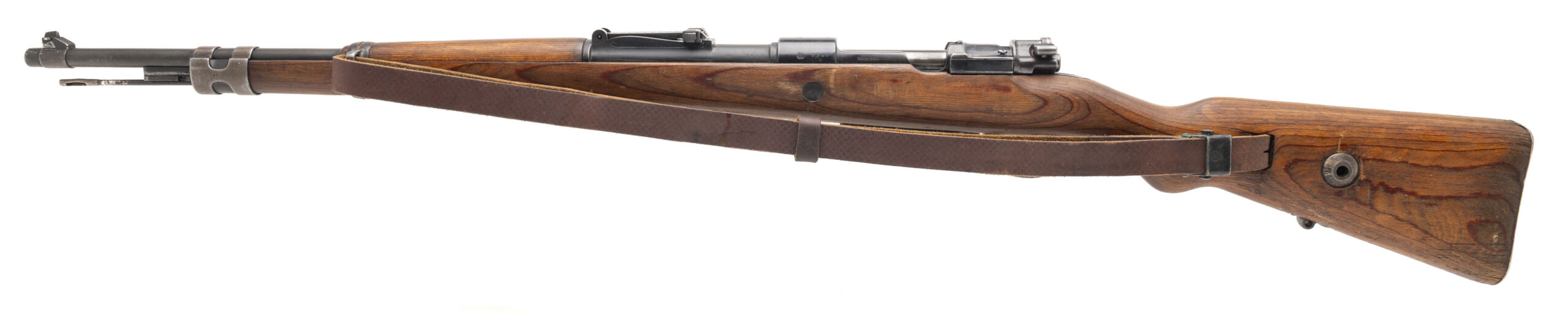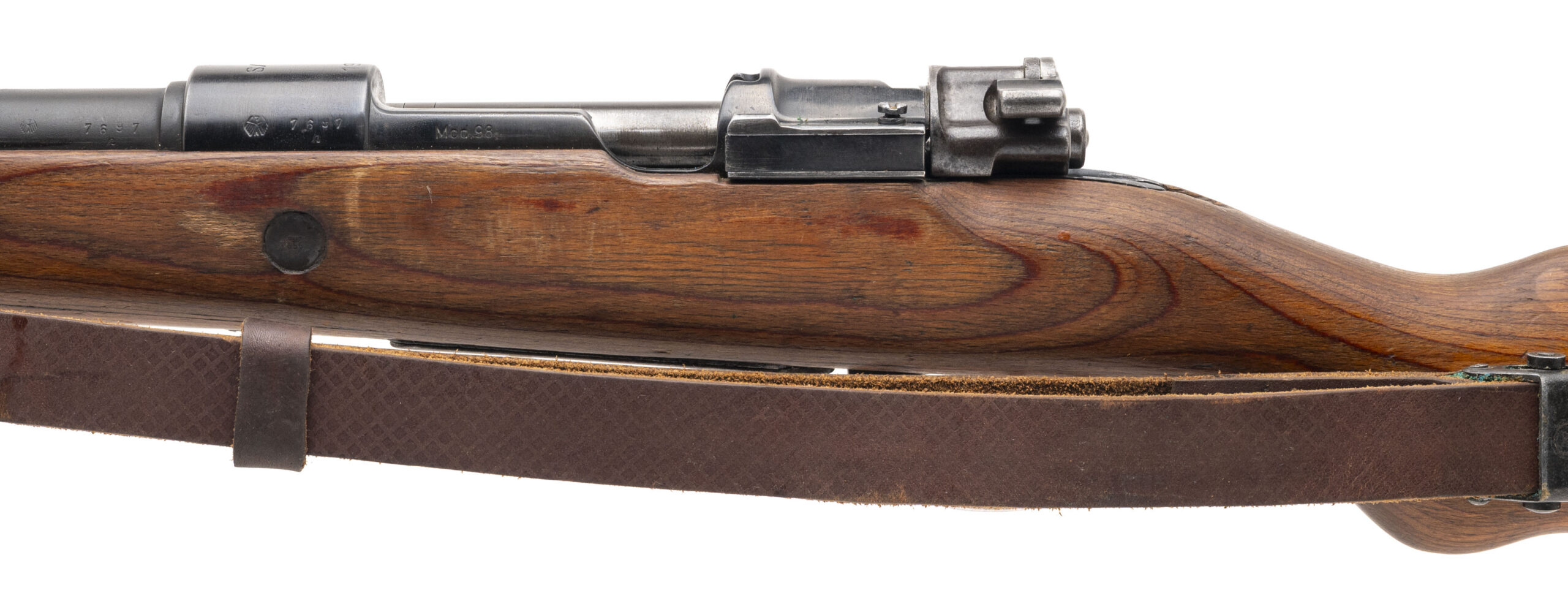Serial number 7697k. Made at Mauser Oberndorf in 1936 with a 23.6-inch barrel that has a bright bore with strong visible rifling. This pre-war Kar98k is in overall very good condition with thinning original factory finish across the metallic parts & laminated beechwood furniture. The stock shows limited handling wear & the handguard is matching in color & condition. There is a Navy Arms import mark on the left side of the barrel near the muzzle. Comes with a leather sling & cleaning rod.