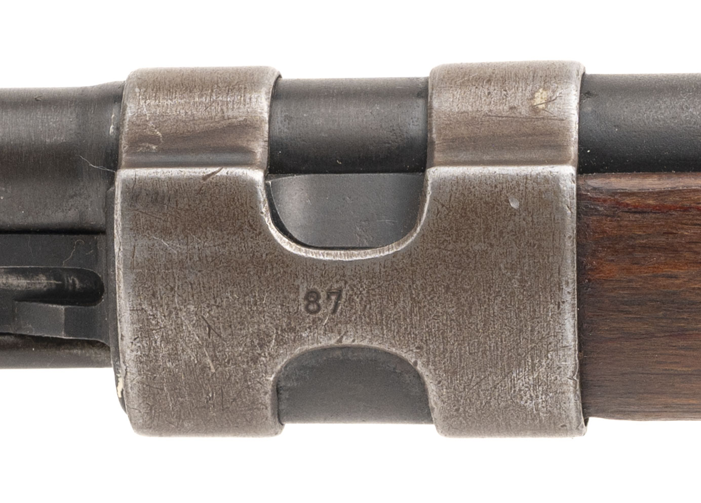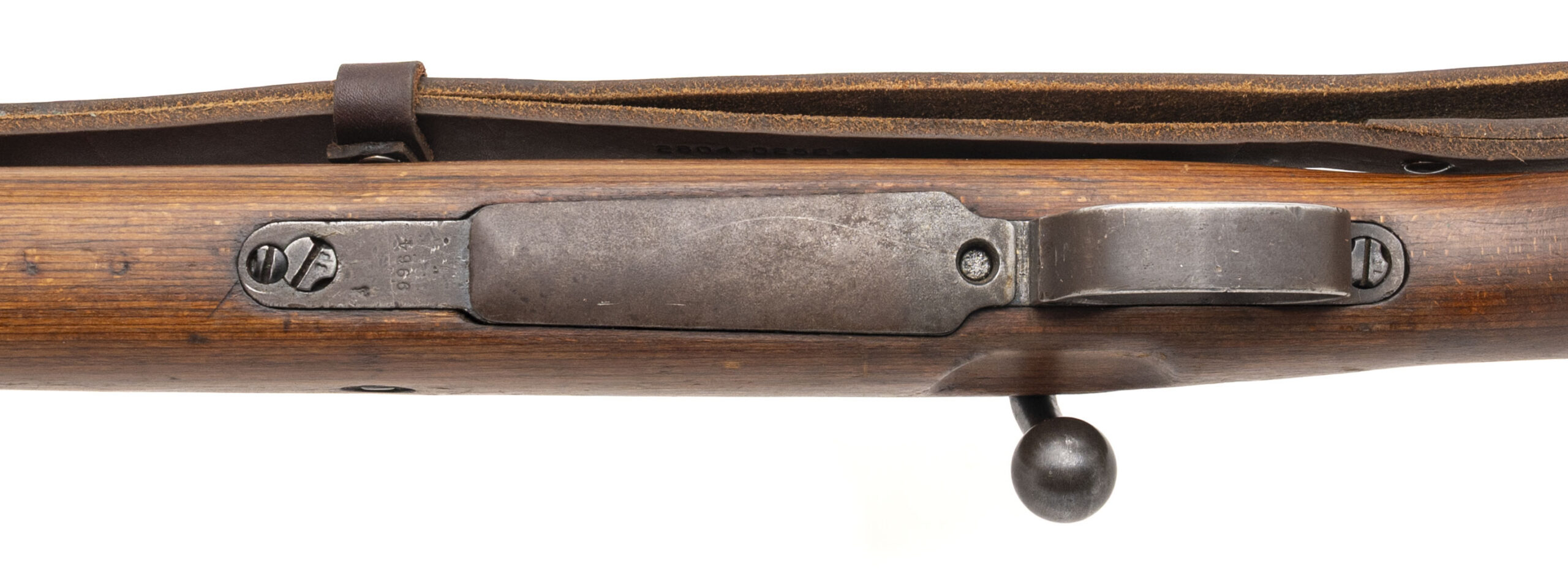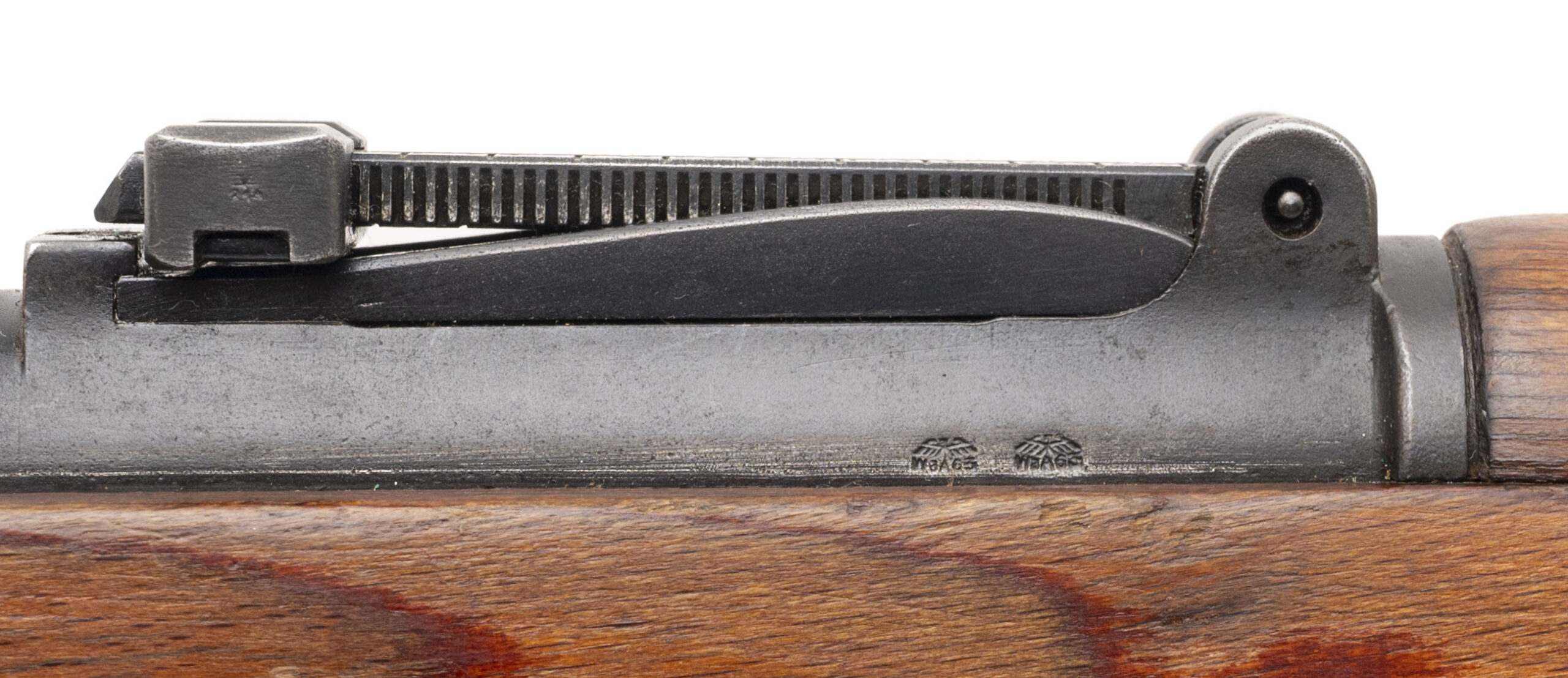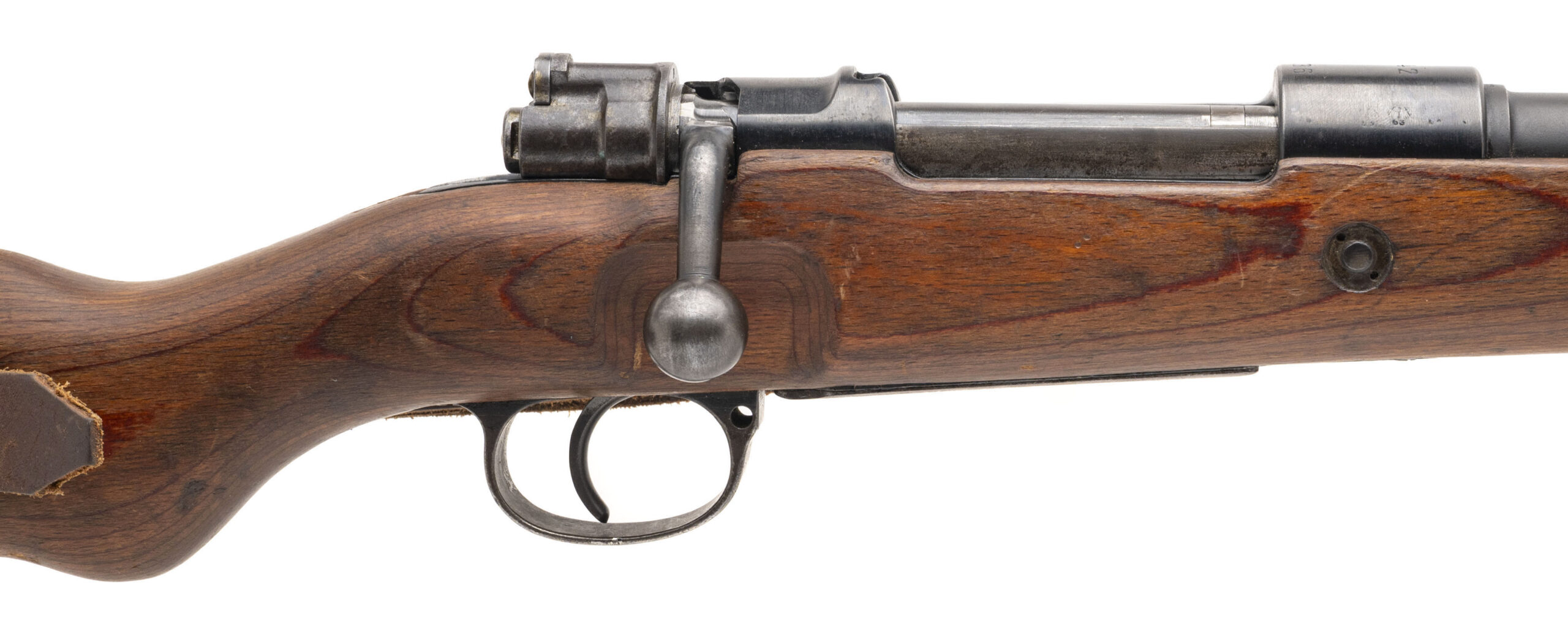 Serial number 7697k. Made at Mauser Oberndorf in 1936 with a 23.6-inch barrel that has a bright bore with strong visible rifling. This pre-war Kar98k is in overall very good condition with thinning original factory finish across the metallic parts & laminated beechwood furniture. The stock shows limited handling wear & the handguard is matching in color & condition. There is a Navy Arms import mark on the left side of the barrel near the muzzle. Comes with a leather sling & cleaning rod.