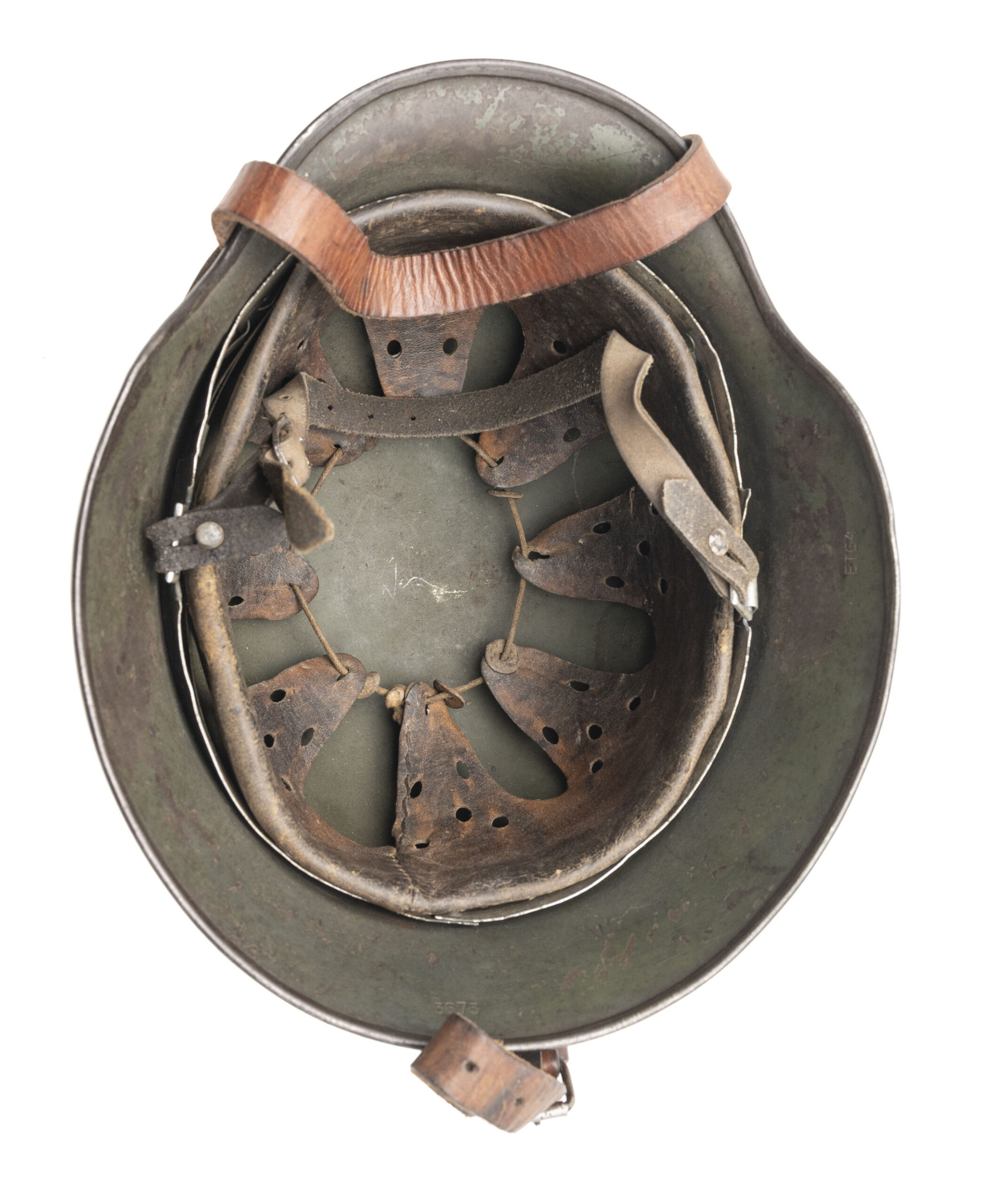 This pre-World War II German single decal M35 rolled-edge "Stalhelm" (steel helmet) was made in 1937 by Eisenhüttenwerke in Thale, Saxony-Anhalt. The shell size is 64 & the liner size is 57. The original feldgrau finish on the shell appears to have been overpainted & reveals some scratches as well as some evidence on the right side where the other decal used to be. Shell, liner & liner chinstraps are in good condition. Comes with a brown leather carrying strap.