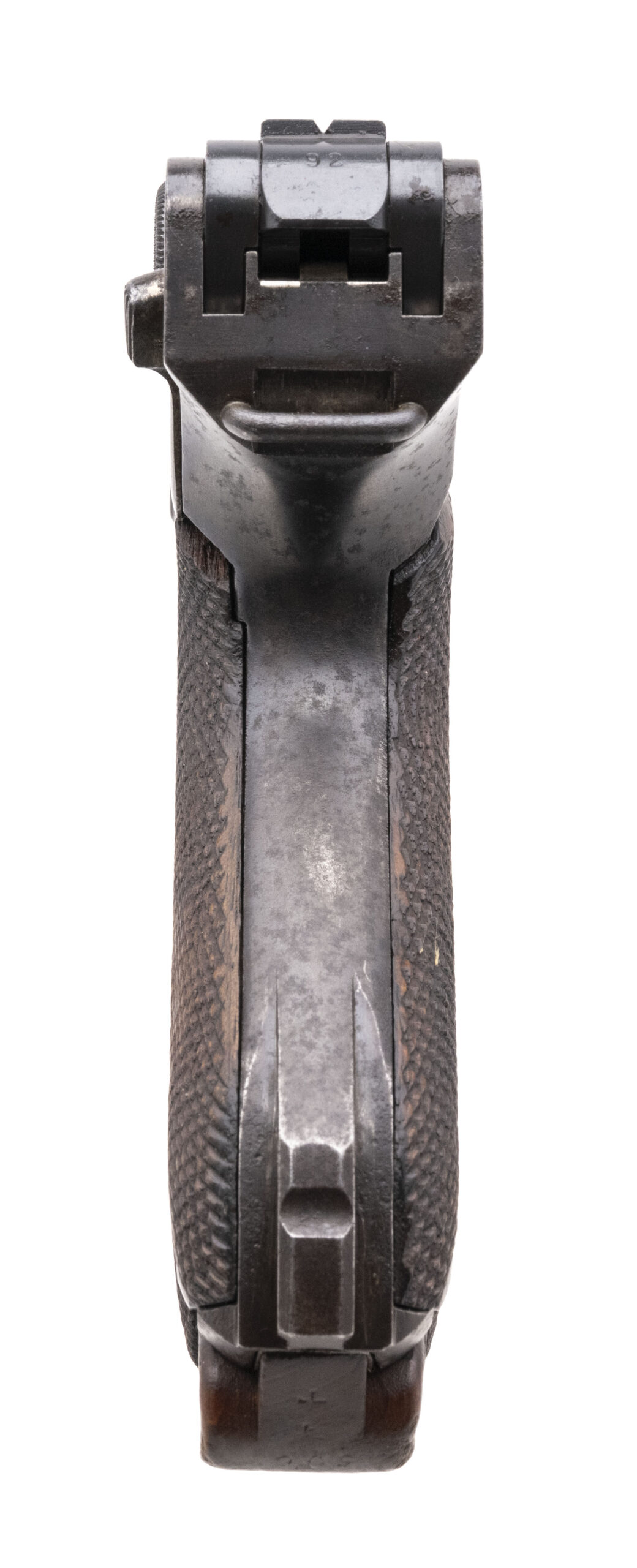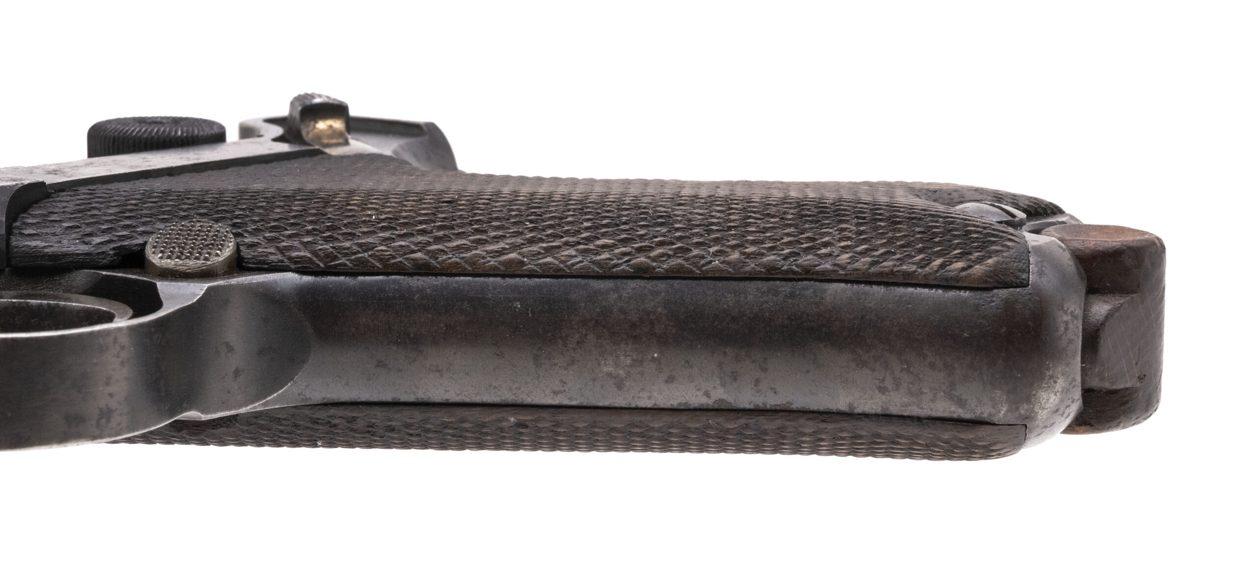 Serial No. 8892a, made in 1913, 9mm, 4” round barrel. Bore is bright with light frosting visible in the grooves, rifling remains strong. Serial numbers are matching on the pistol, magazine is not. Roughly 75% original blue remains with 90% straw noted. Standard Imperial and military markings and proofs. Scattered surface oxidation and edge wear is also noted with majority being on the left side. Brown checkered are very good with light handling usage noted. Action is smooth and functions correctly.