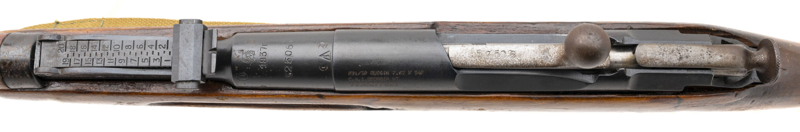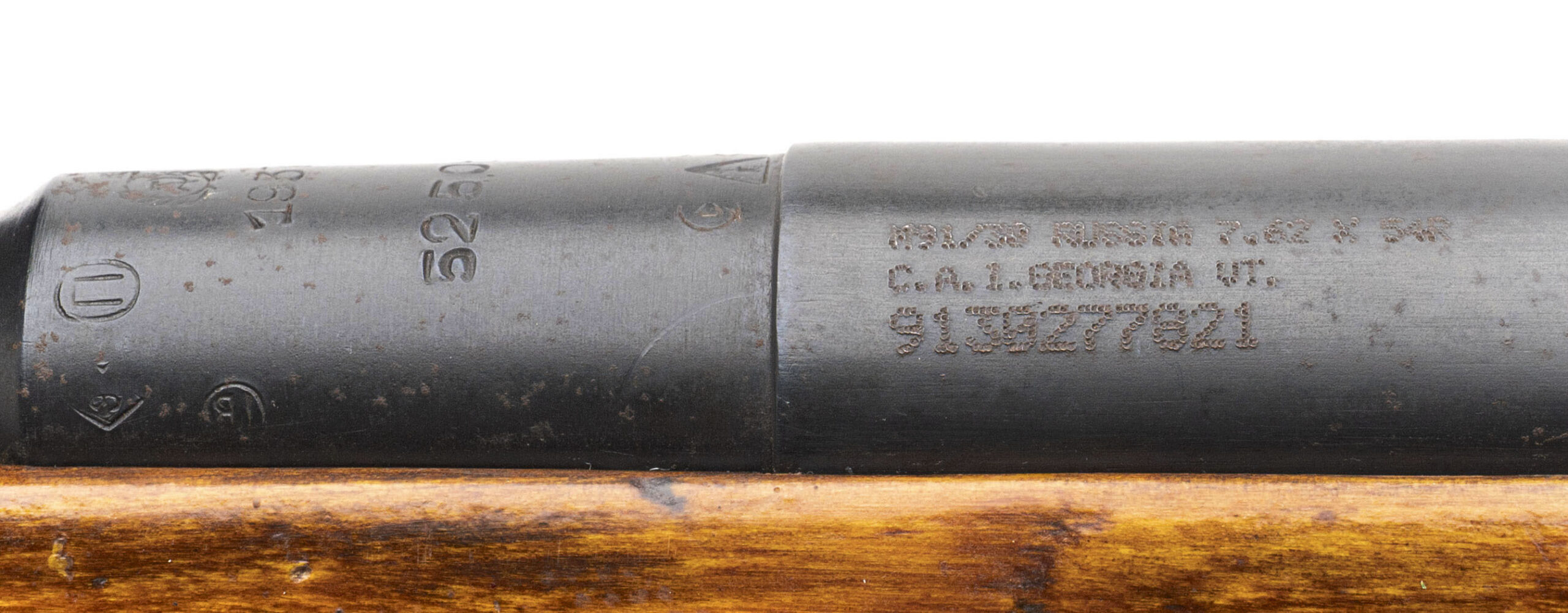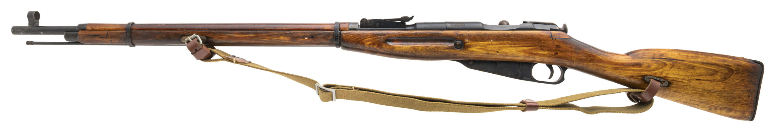 Serial No. 9130277821 (importer), manufactured in 1937, chambered in 7.62×54R with a 28.75" round barrel. The bore is bright with strong rifling. Serial numbers are non-matching, with the bolt having been force-matched during service or refurbishment. The left side of the receiver is import marked. Metal surfaces show light scattered surface oxidation consistent with age, while the stock remains good with light surface impressions noted in scattered areas. Overall presentation is honest and representative of a pre-war Soviet service rifle. Action is smooth and functions correctly. Rifle comes complete with bayonet.