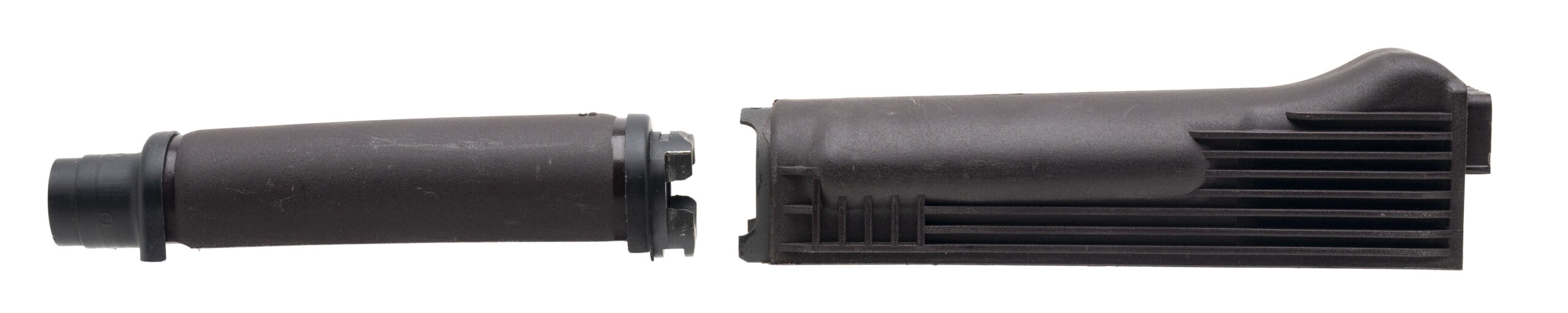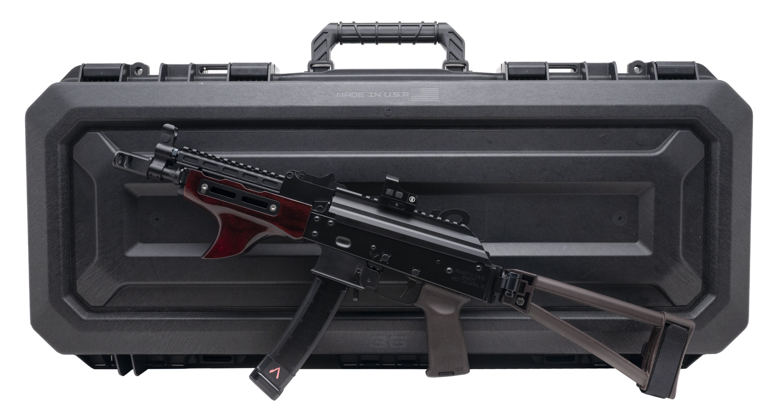 SN: AKV003290. Modern production 9mm with an 10.5" barrel and 2 port muzzle brake. Bore is bright with excellent rifling. Semi-Auto AK Tactical Pistol with Bushnell optic, wood forend and shark-fin grip and ALG trigger. Finish is in excellent condition. Polymer furniture is excellent condition. Comes with case, original furniture and muzzle brake and 4 extra magazines.