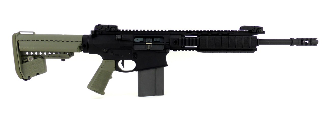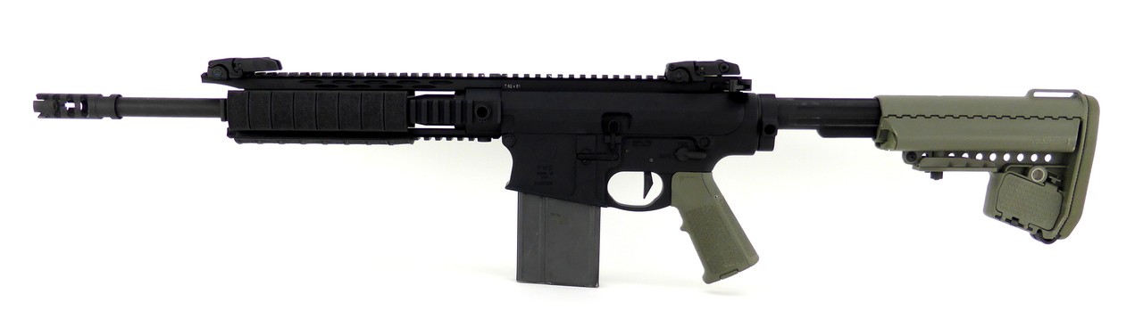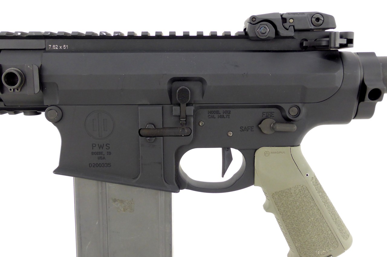 PWS MK2 Multi/7.62x51 caliber rifle. Has MIAD grip, Vltor stock, SD-E (super dynamic enhanced) Geissele trigger, and guard rail.