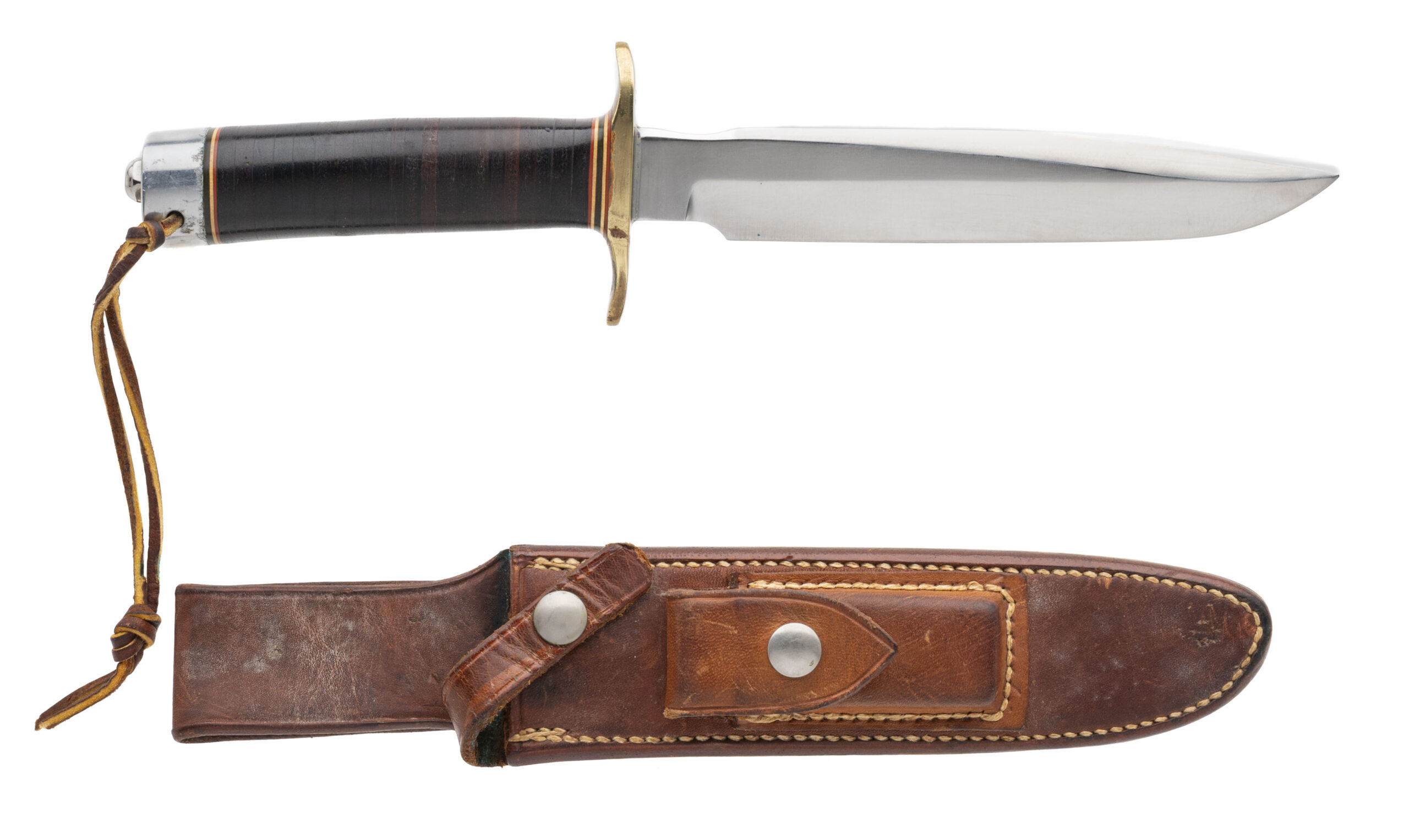 Randall model 1 fighting knife made circa late 1970's with a 7" S marked stainless blade, brass guard, stacked leather handle with aluminum pommel and original Johnson rough back sheath with orange stone. Some scuffs and handling marks, overall in good solid condition.