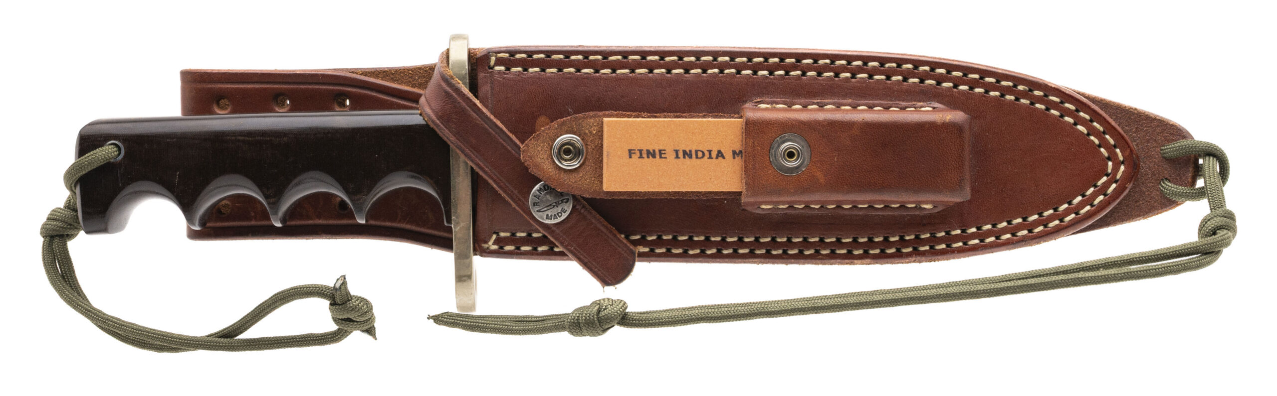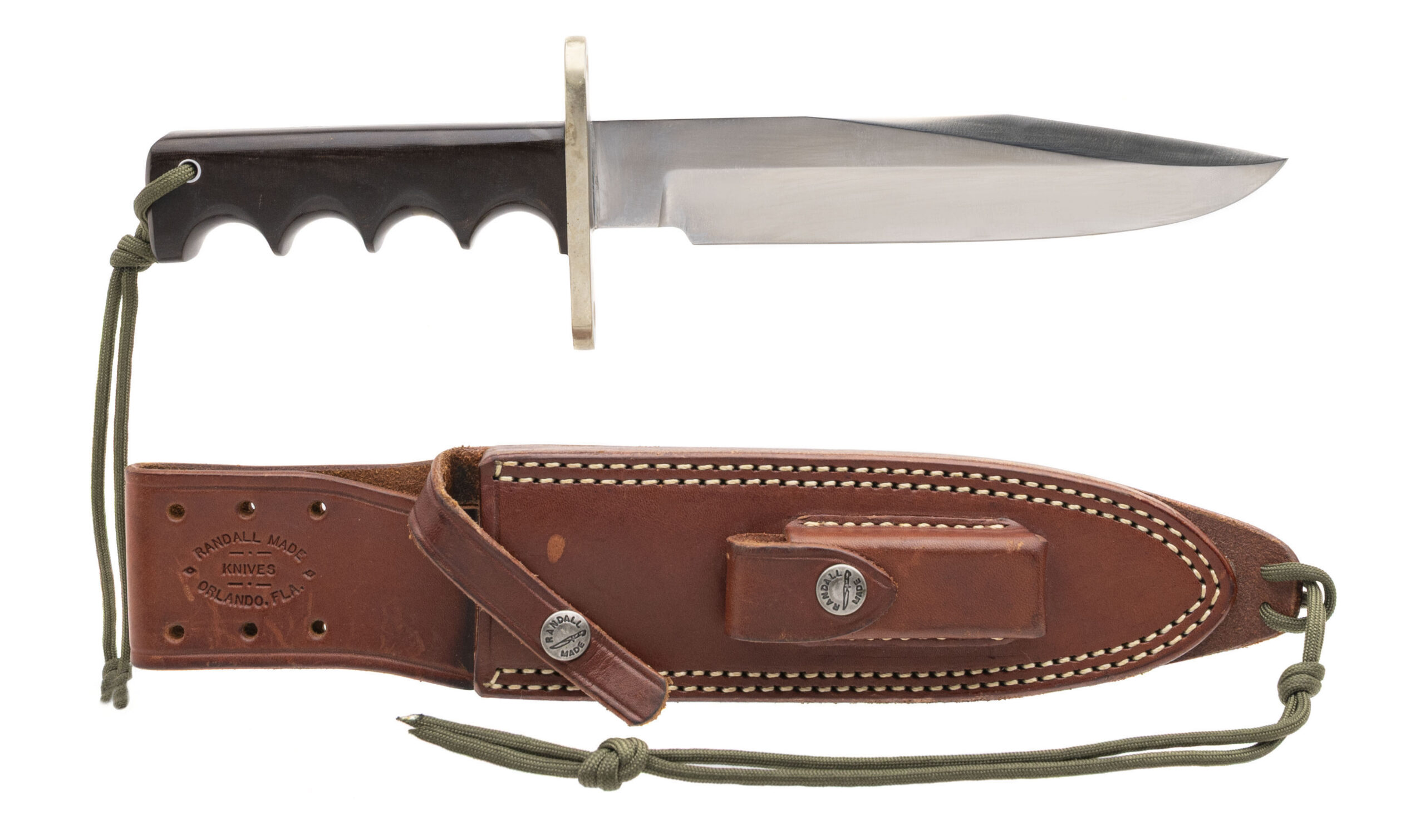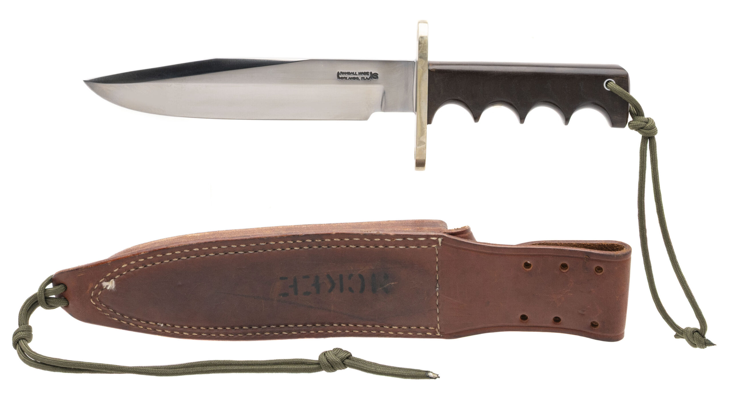 Randall model 14 fixed blade fighting knife with a 7 1/2" blade, 12 1/8" OAL, polished brass guard and finger grooved micarta handle with a full tang and lanyard hole near the pommel. Original Randall smooth back sheath with orange Fine India stone and smooth back with the name "MCKEE" marked in military style stencil . Some light handling marks on the sheath, knife is near excellent.