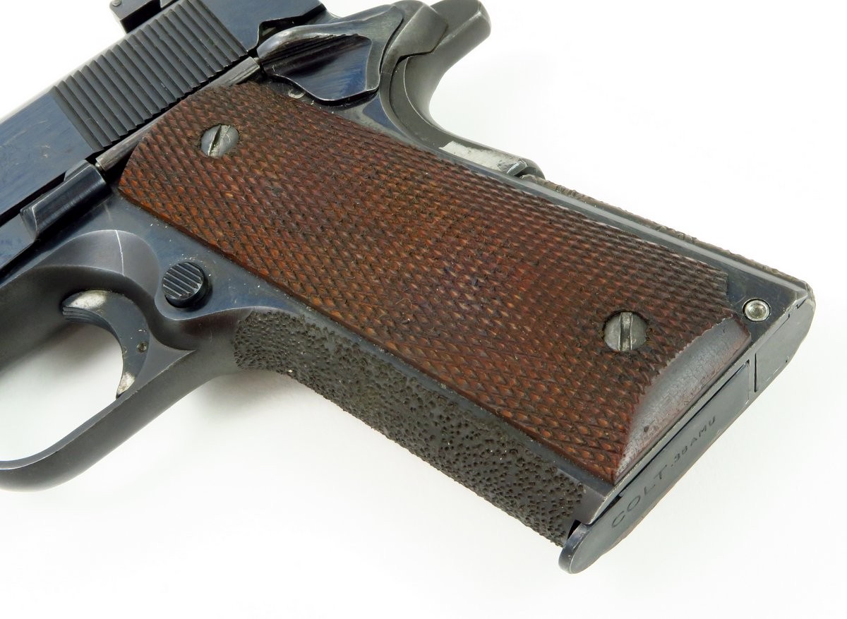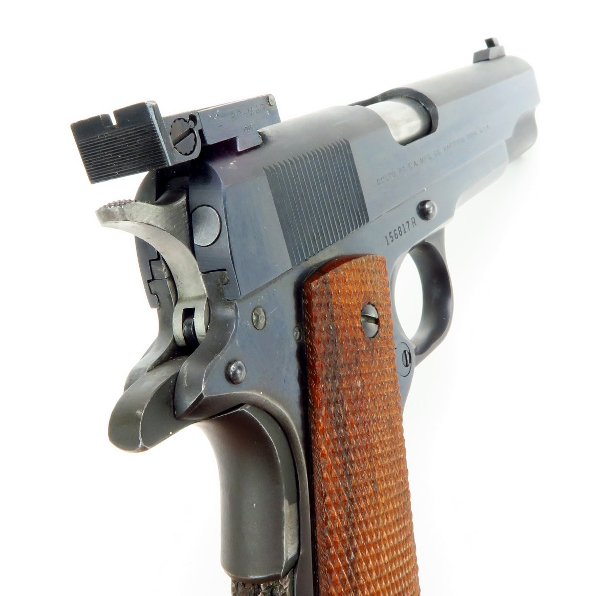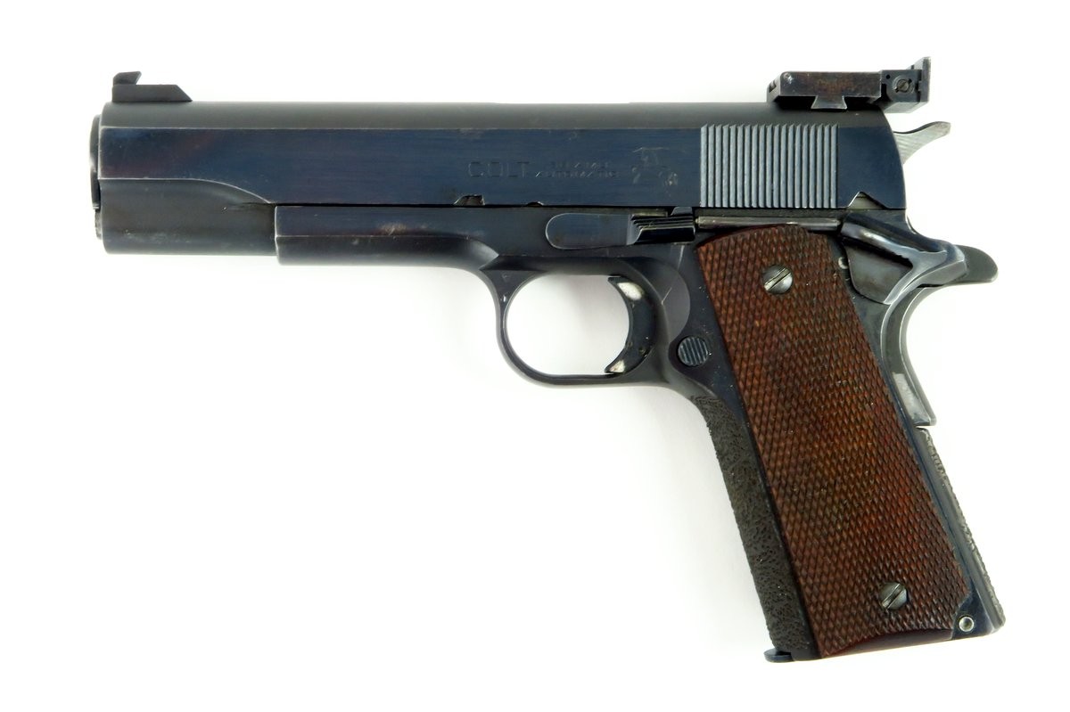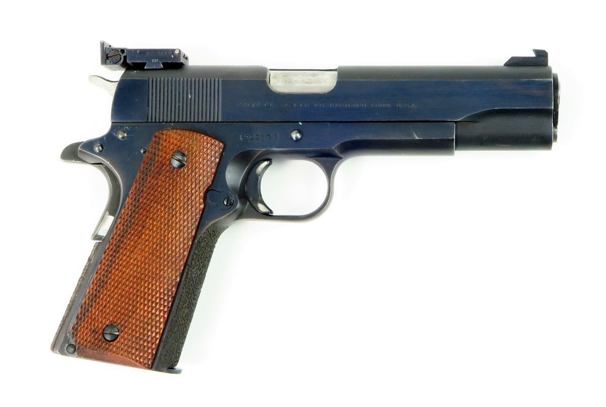 Rare Colt 38 AMU pistol. This is a very scarce and desirable Colt commercial pistol, produced in the scarce 38 AMU cartridge. This cartridge was developed by the army marksmanship unit, Fort Benning, Georgia to meet national match standards, by firing the light and more accurate 38 AMU round as used by the US ARMY marksmanship teams. It was built on a model 1911 A1 type pistol frame, with basic parts provided by Colt, in essence a kit gun. Initially they were manufactured on government contracts, but eventually a few were sold commercially and they were manufactured on special order for Gil Hebard Guns, Knoxville, Illinois. The slide is marked on each side; “Colt/.38 AMU/Automatic” followed by the Rampant Colt and the obverse “Colt’s PT. F.A MANUFACTURED. CO. Hartford, CONN. U.S.A.” The top of the barrel is marked “Colt .38 AMU” The slide is equipped with an extended front sight and an adjustable Bo-Mar target rear sight. Serrated trigger and stippled front grip. Gun is in very fine condition with almost all of its original blue. Mechanically excellent. Bore is excellent.