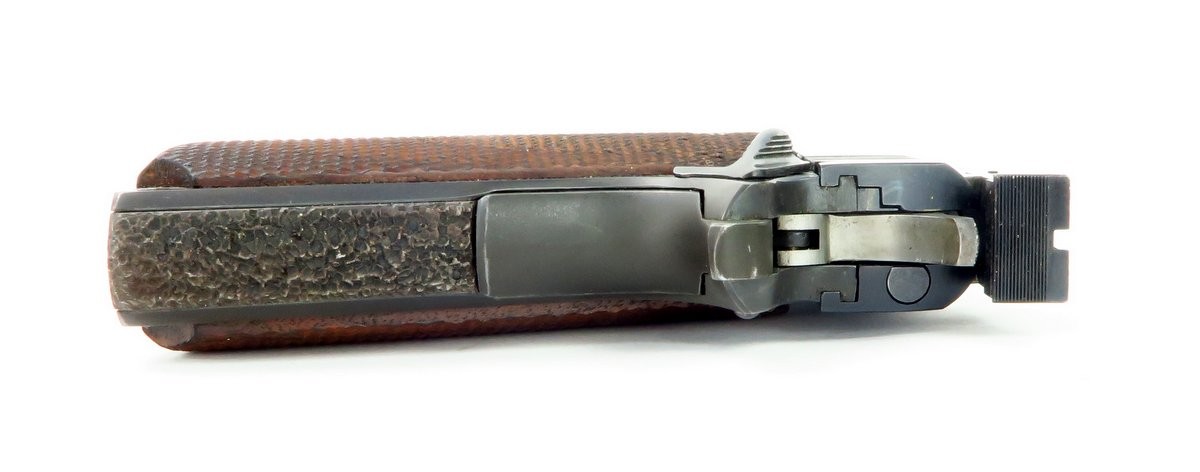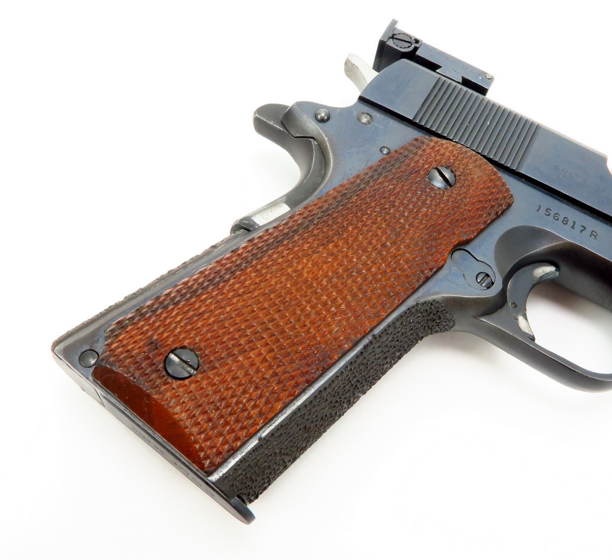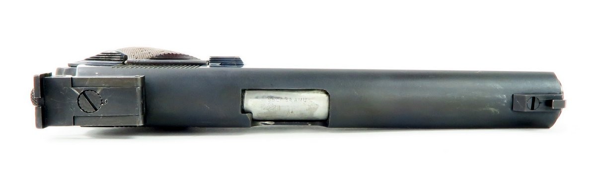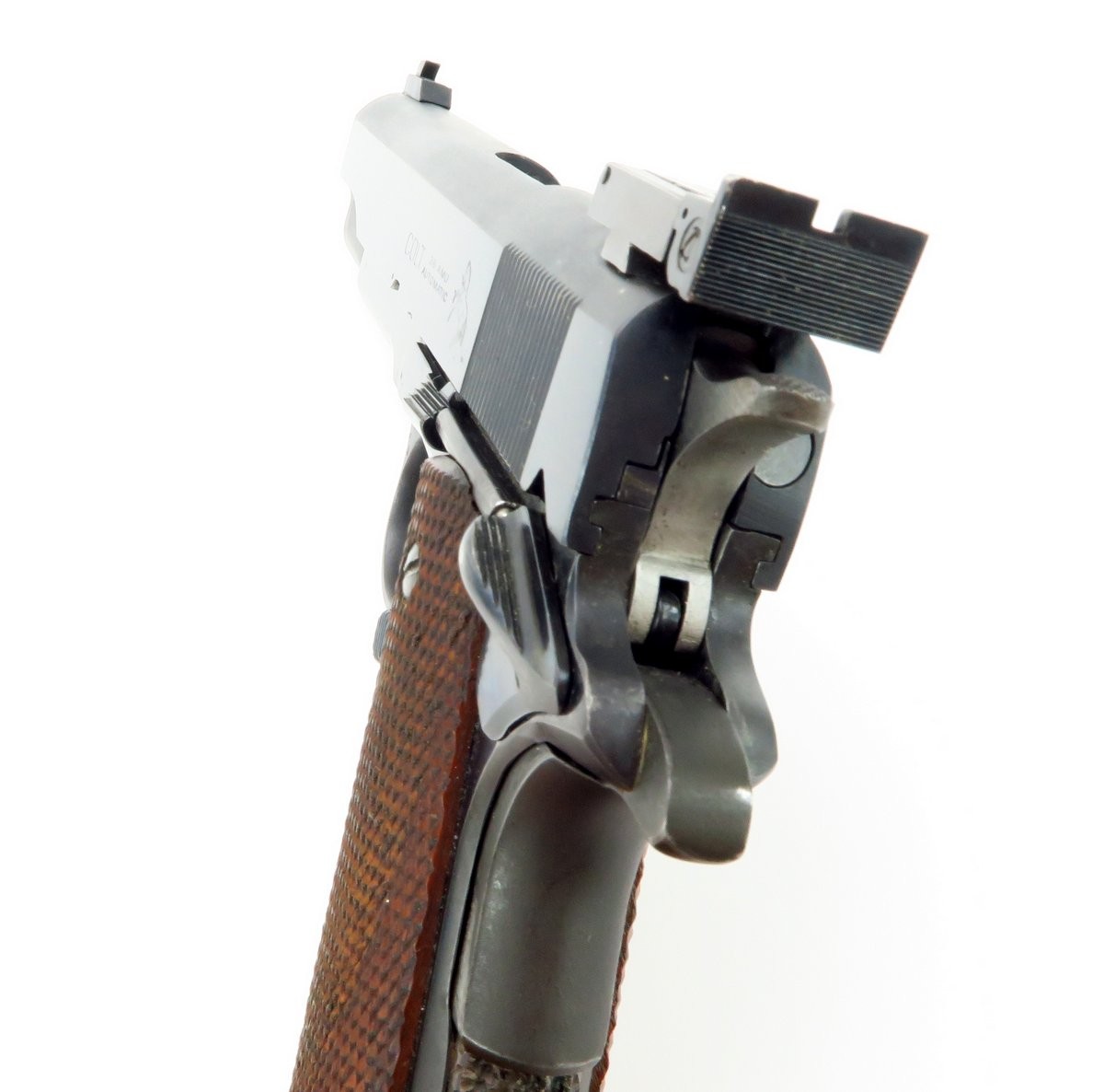 Rare Colt 38 AMU pistol. This is a very scarce and desirable Colt commercial pistol, produced in the scarce 38 AMU cartridge. This cartridge was developed by the army marksmanship unit, Fort Benning, Georgia to meet national match standards, by firing the light and more accurate 38 AMU round as used by the US ARMY marksmanship teams. It was built on a model 1911 A1 type pistol frame, with basic parts provided by Colt, in essence a kit gun. Initially they were manufactured on government contracts, but eventually a few were sold commercially and they were manufactured on special order for Gil Hebard Guns, Knoxville, Illinois. The slide is marked on each side; “Colt/.38 AMU/Automatic” followed by the Rampant Colt and the obverse “Colt’s PT. F.A MANUFACTURED. CO. Hartford, CONN. U.S.A.” The top of the barrel is marked “Colt .38 AMU” The slide is equipped with an extended front sight and an adjustable Bo-Mar target rear sight. Serrated trigger and stippled front grip. Gun is in very fine condition with almost all of its original blue. Mechanically excellent. Bore is excellent.