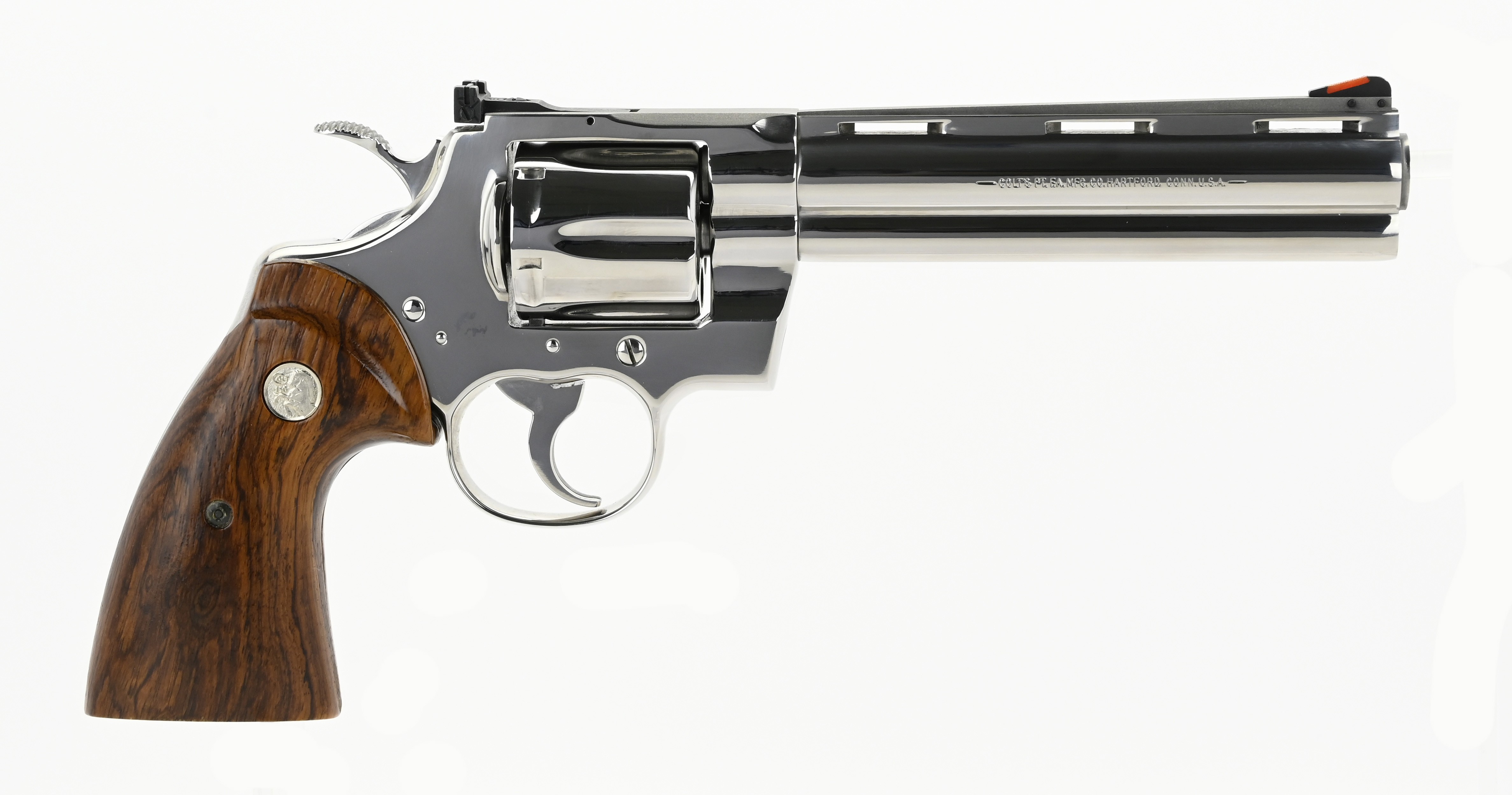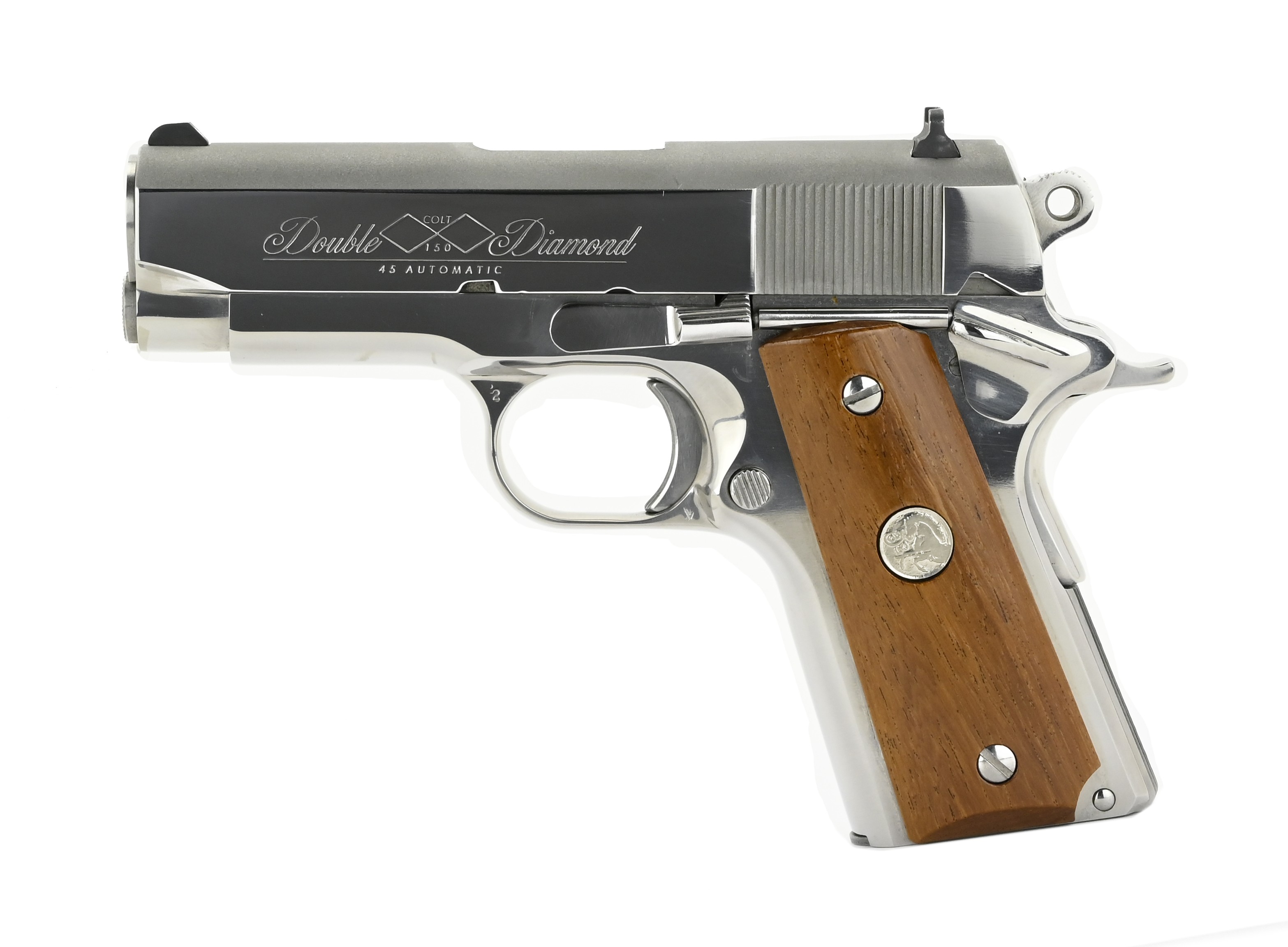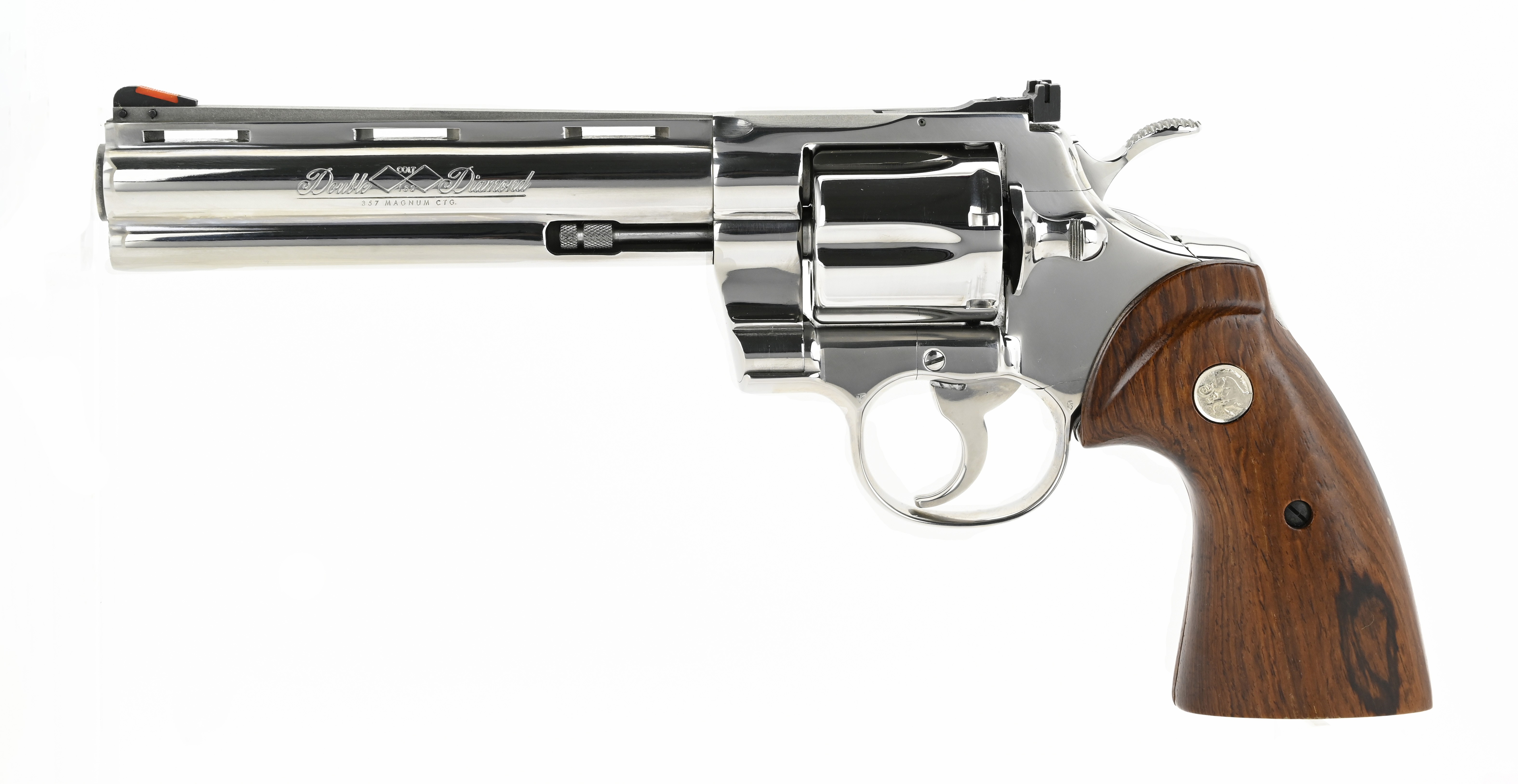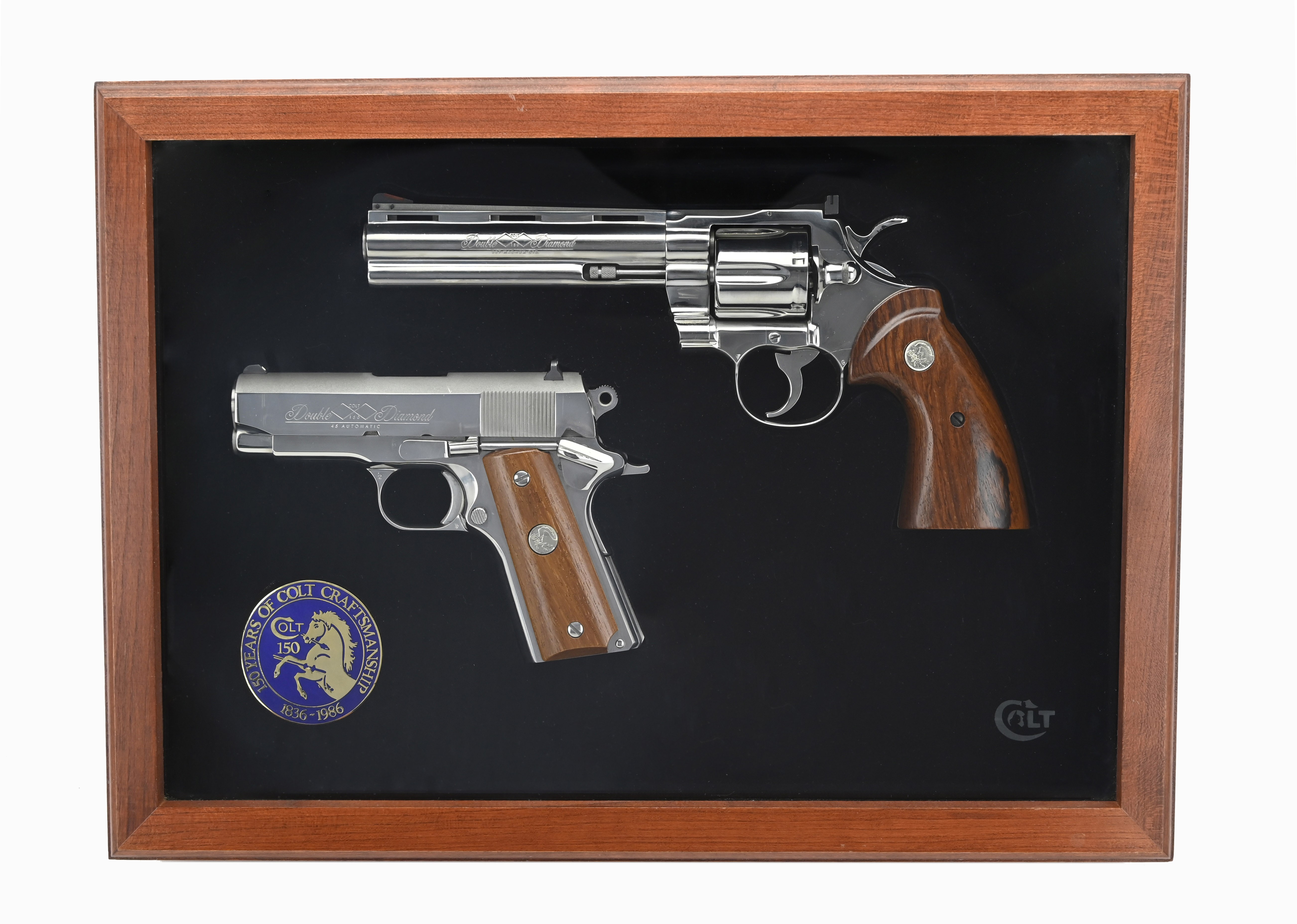 Rare! Colt Python & Officers ACP Double Diamond 150th Anniversary Set Made in 1986 for Colt’s 150th anniversary, this matched pair of guns includes a 6” bright stainless Python and a bright stainless Officers ACP .45, each with special “Double Diamond” markings. Cased together in a fancy presentation case, only 1000 sets were made. Rarely seen for sale, this is a very beautiful and desirable set, in perfect, unfired condition.